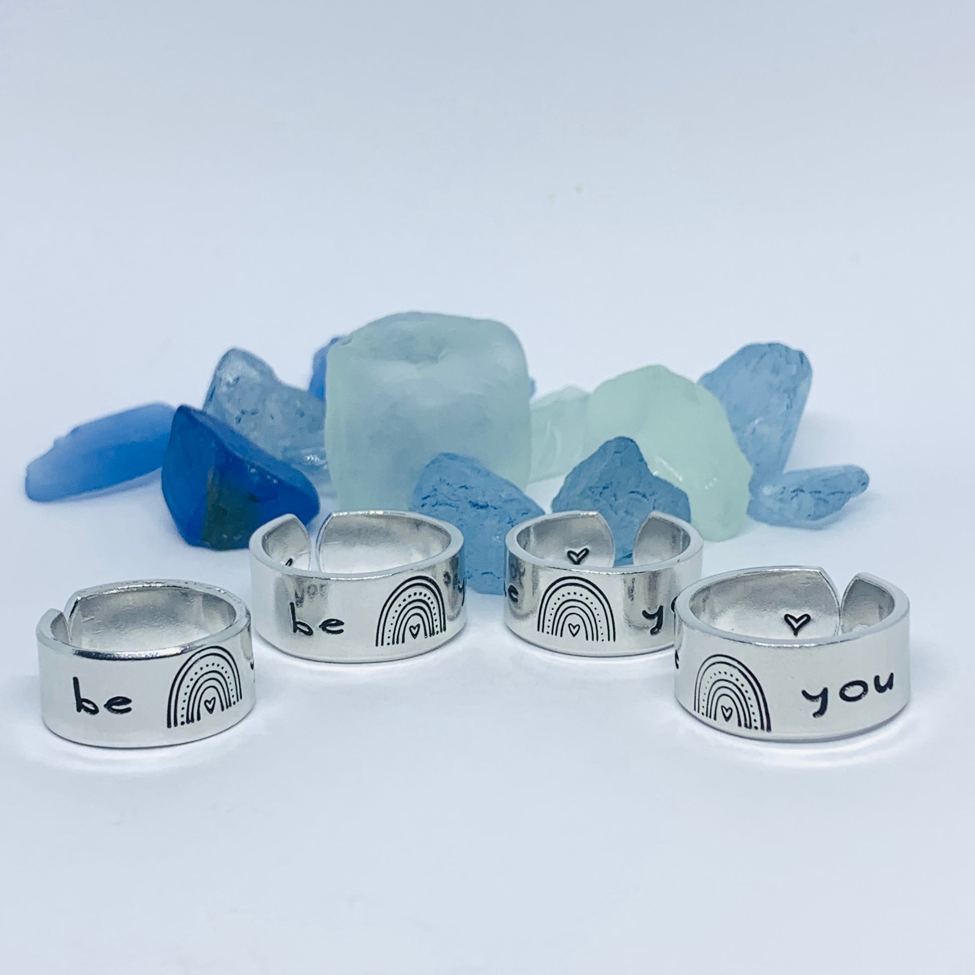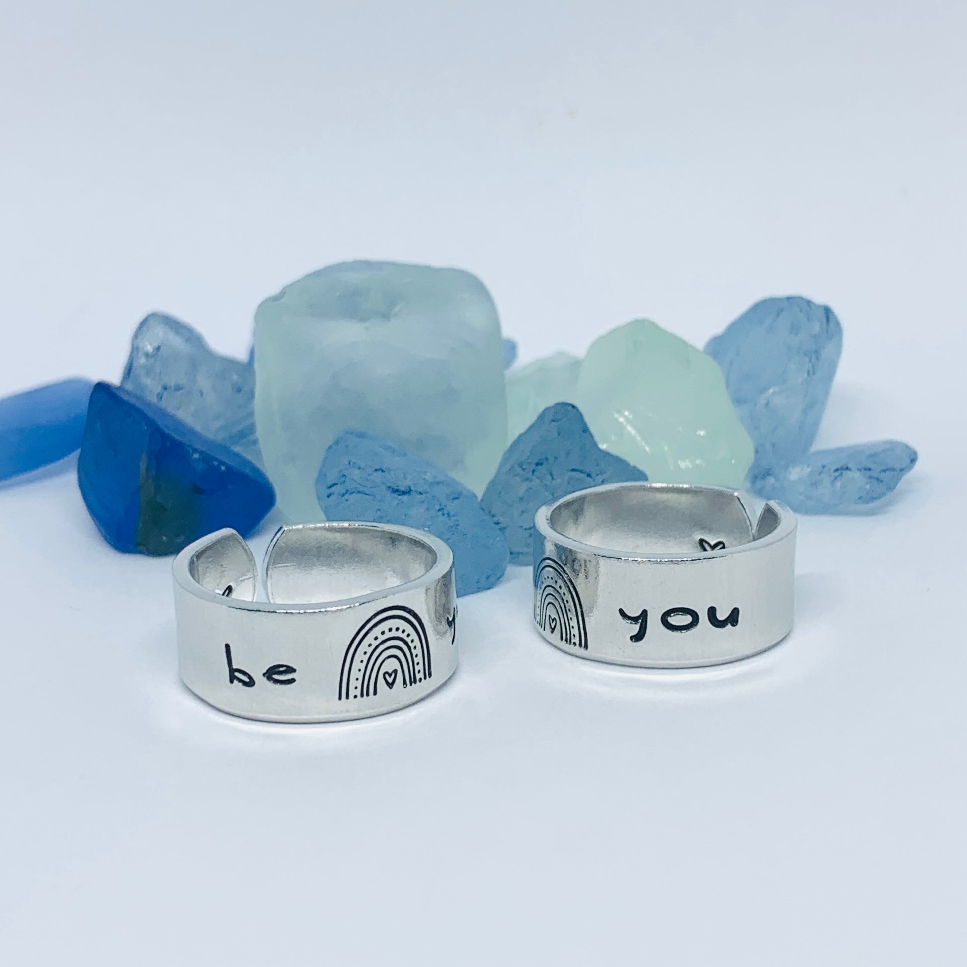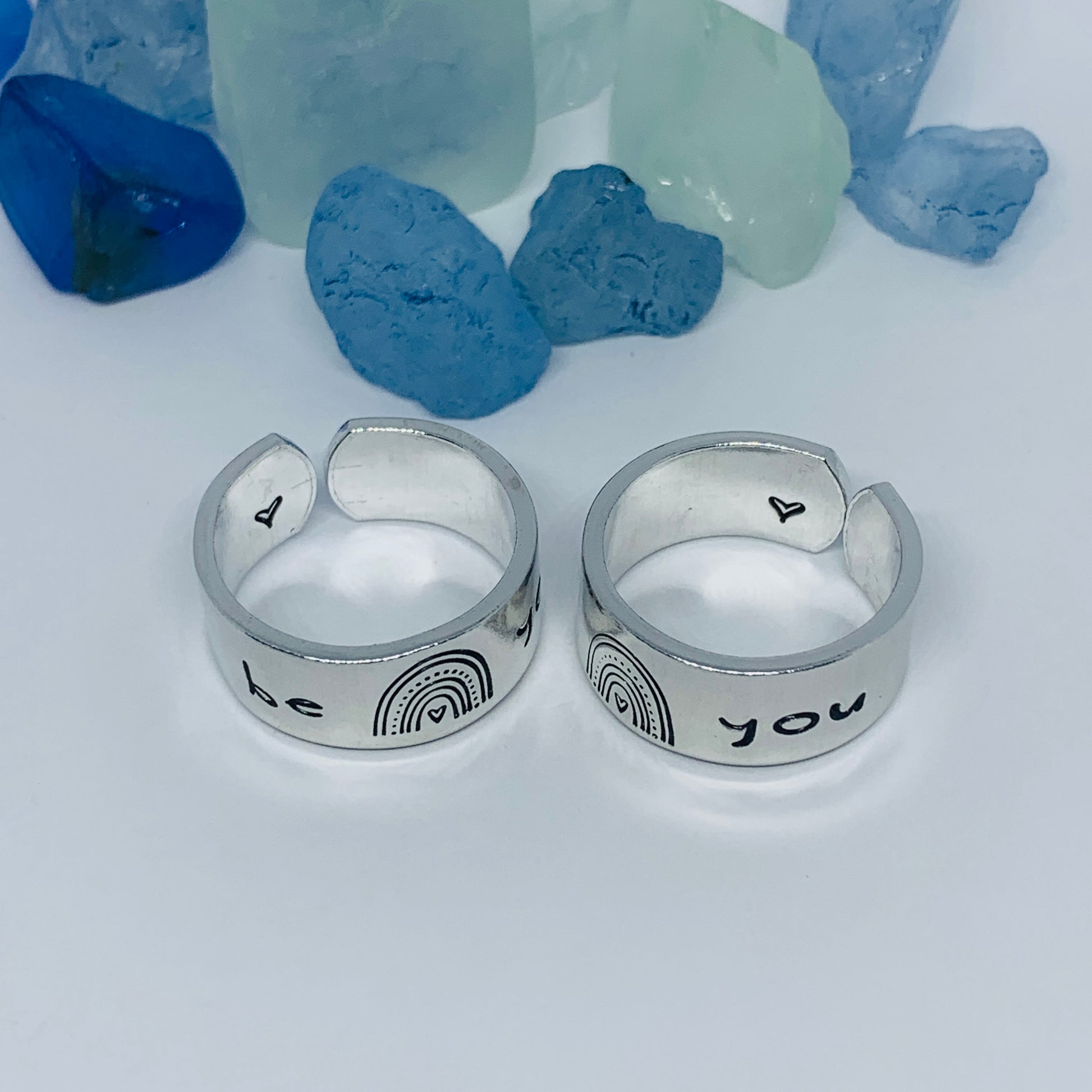 The hand stamped words “be you”, separated by a rainbow design, are featured front and center on this hand crafted ring with a small hand drawn heart design stamped on the far end - one outside, one in.