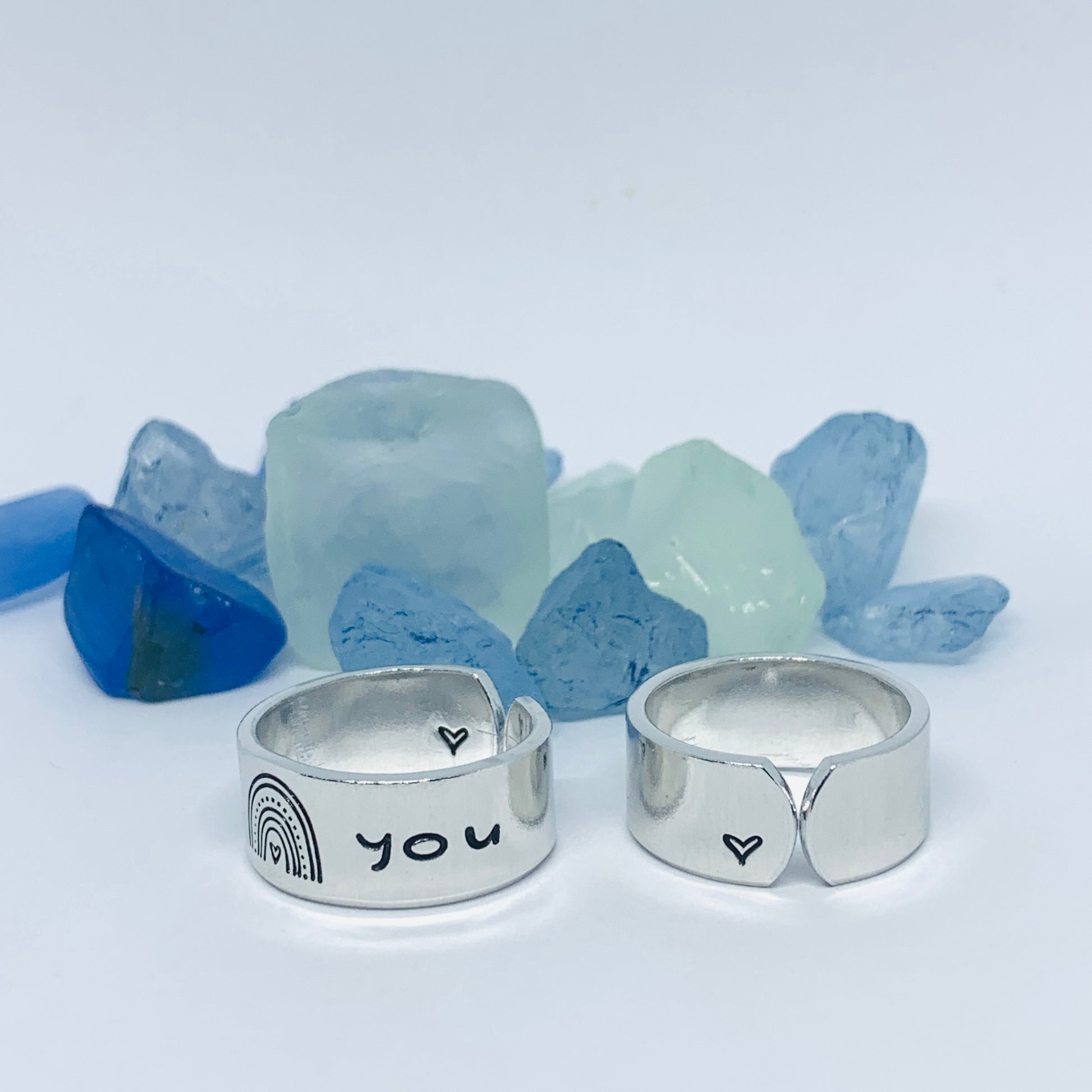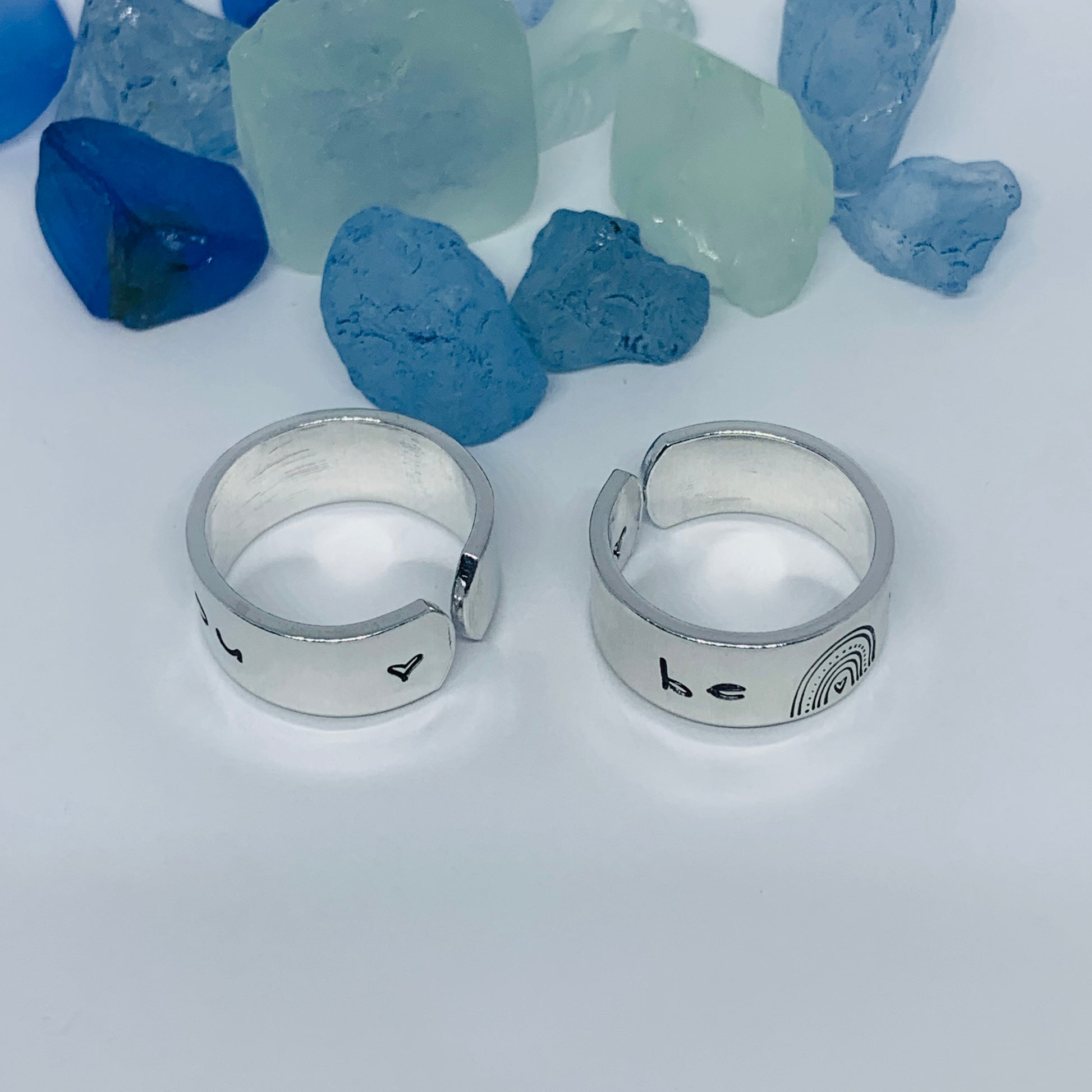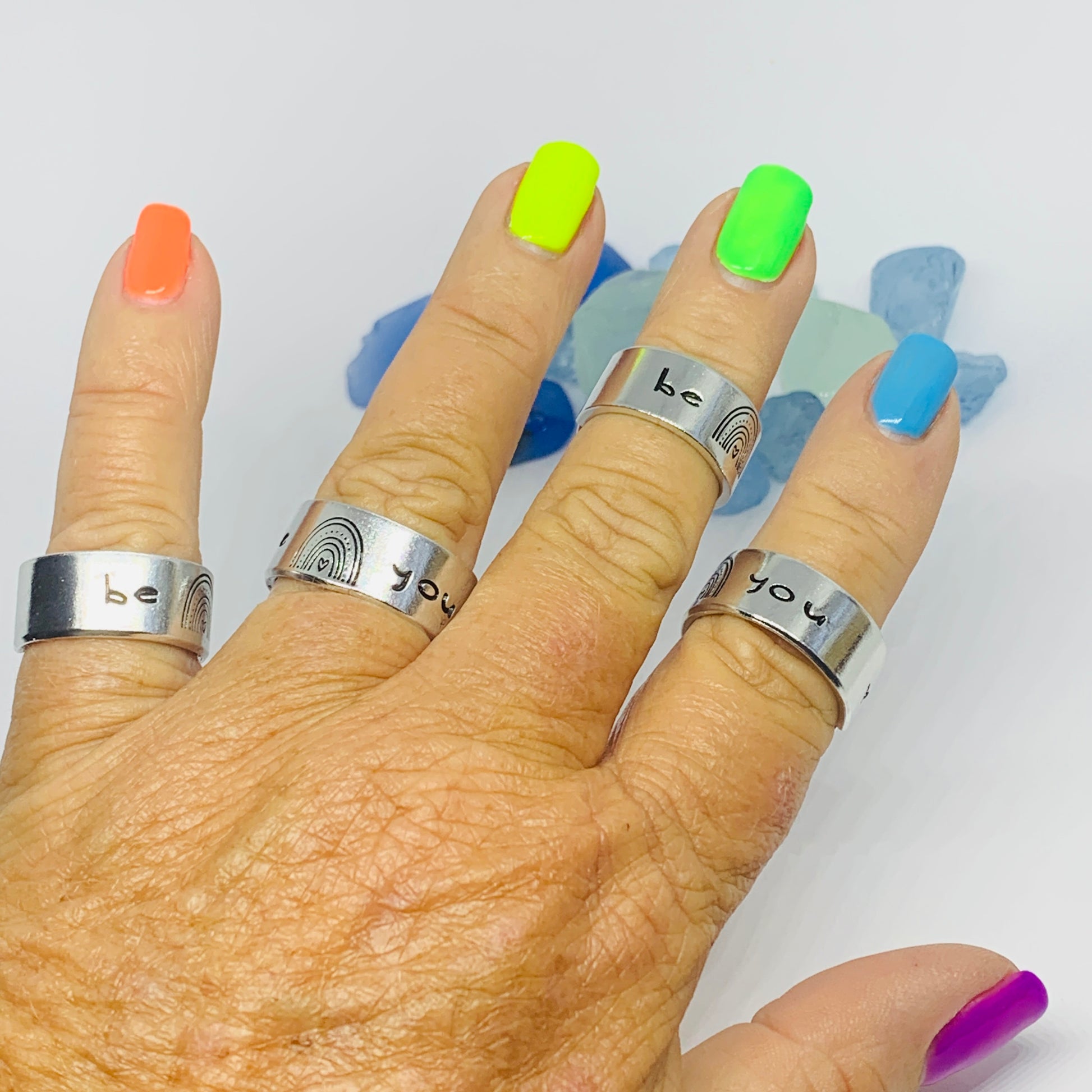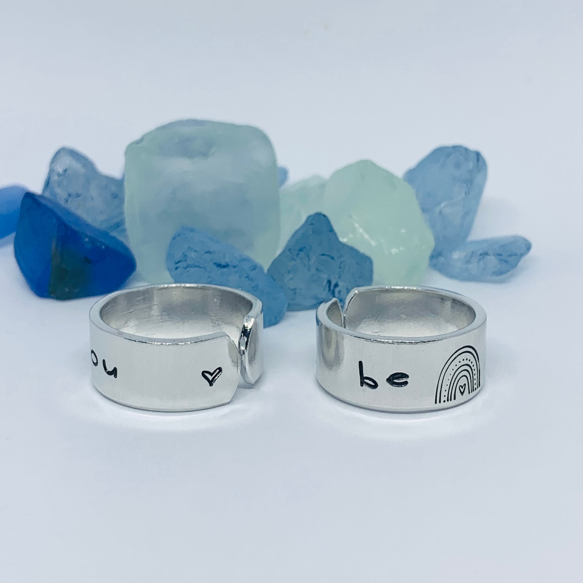 The hand stamped words “be you”, separated by a rainbow design, are featured front and center on this hand crafted ring with a small hand drawn heart design stamped on the far end - one outside, one in.