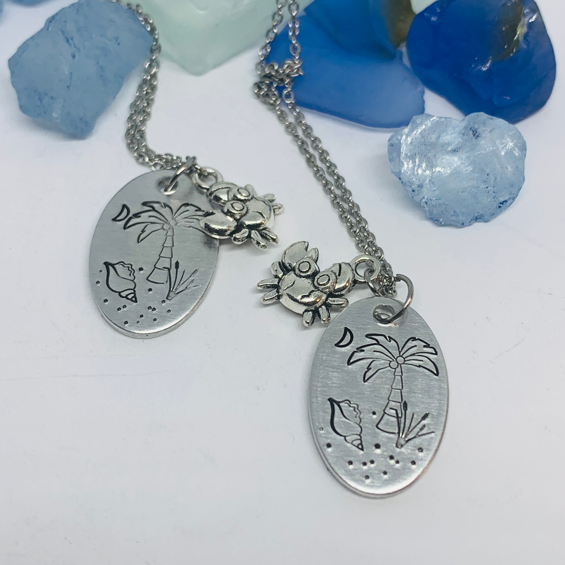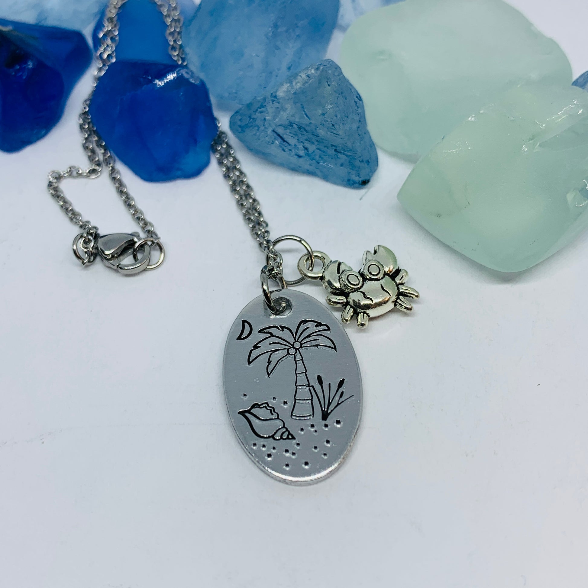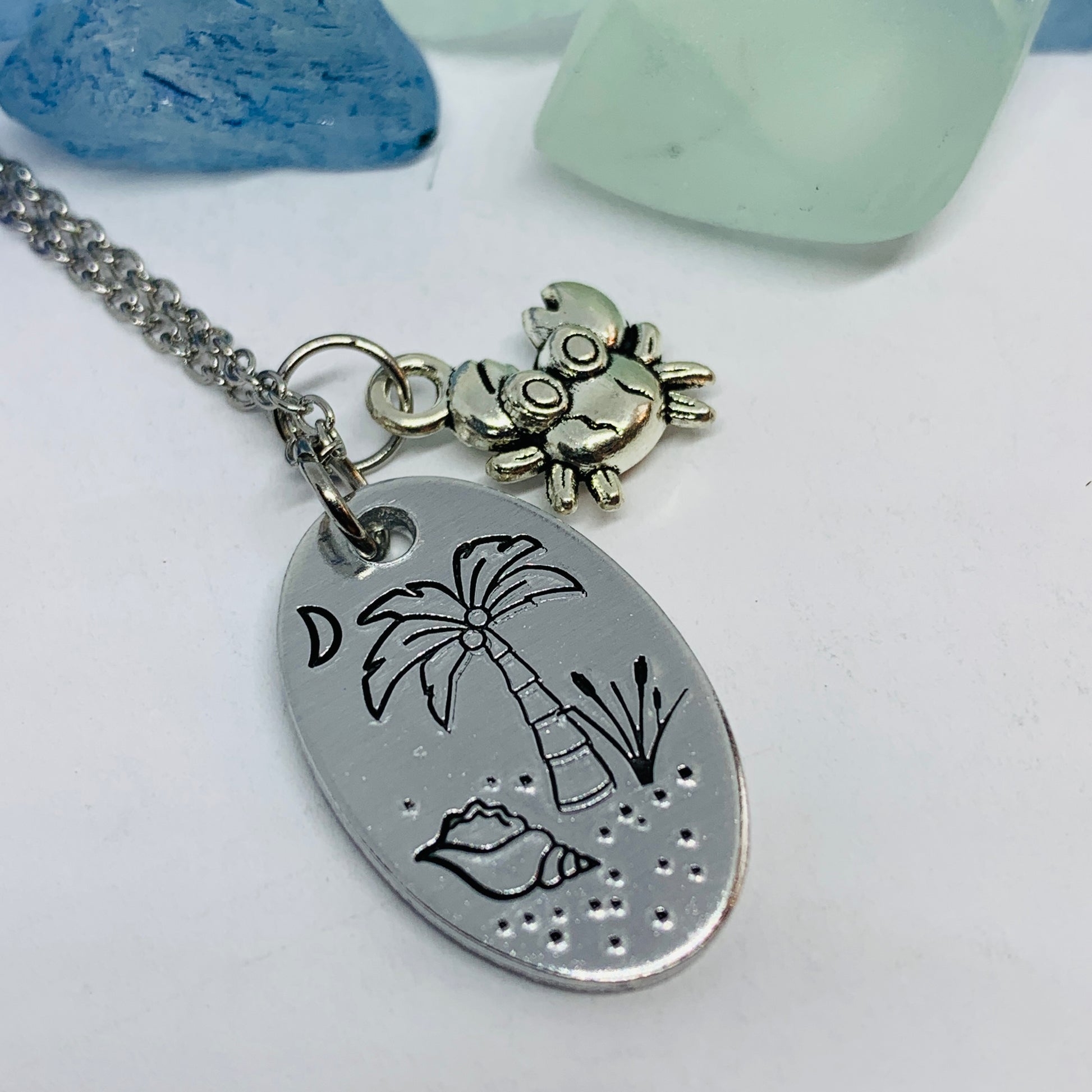 Beach Scene - Hand Stamped Necklace | Tropical | Vacation Jewelry | Crab Charm | Palm Trees Sand Shells Crescent Moon | Cruise | South Carolina