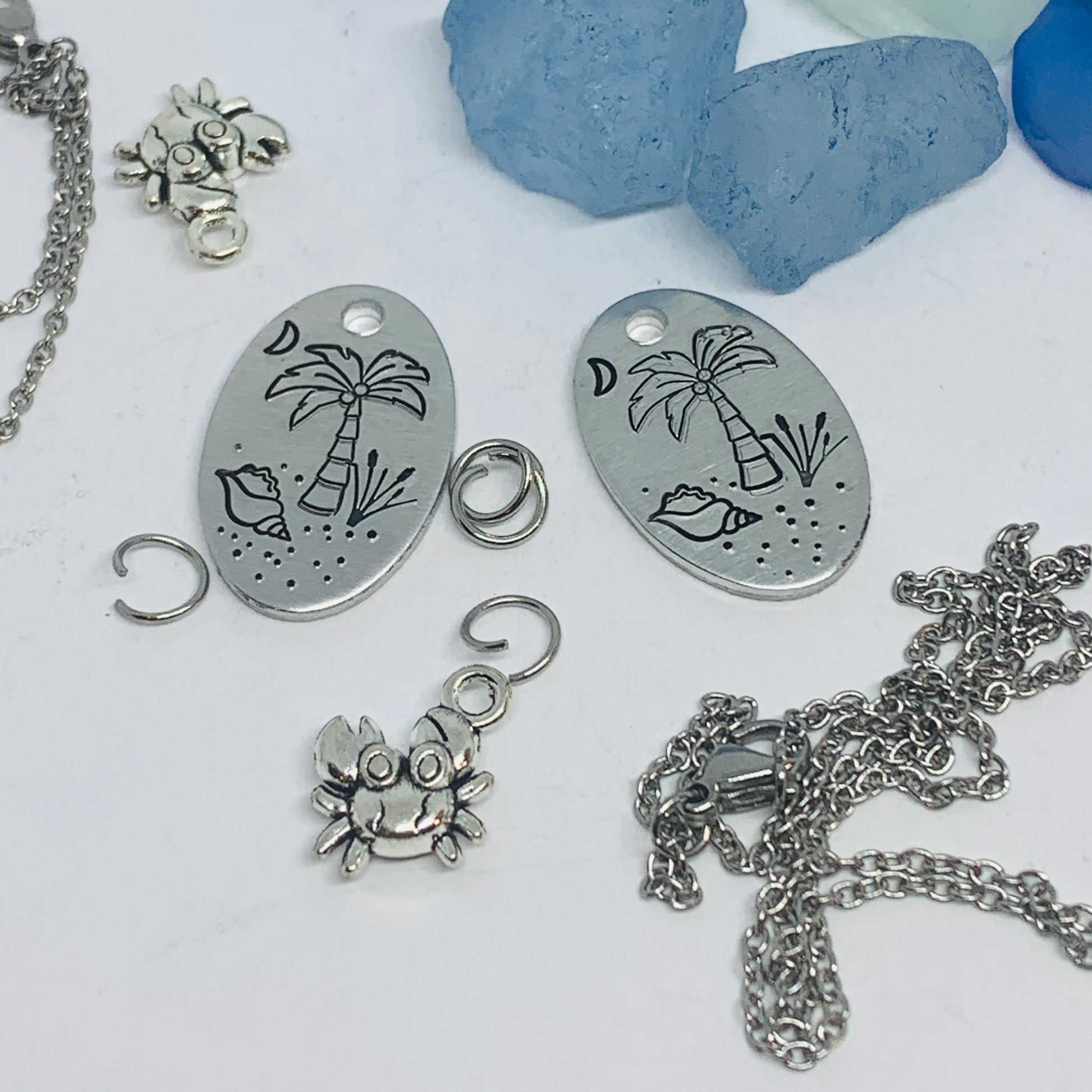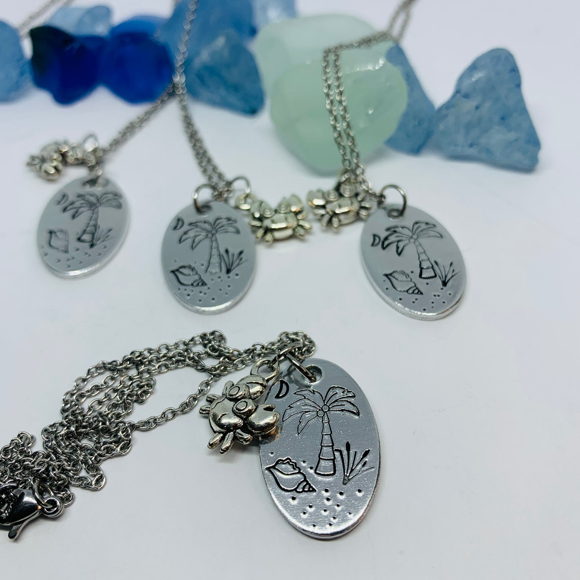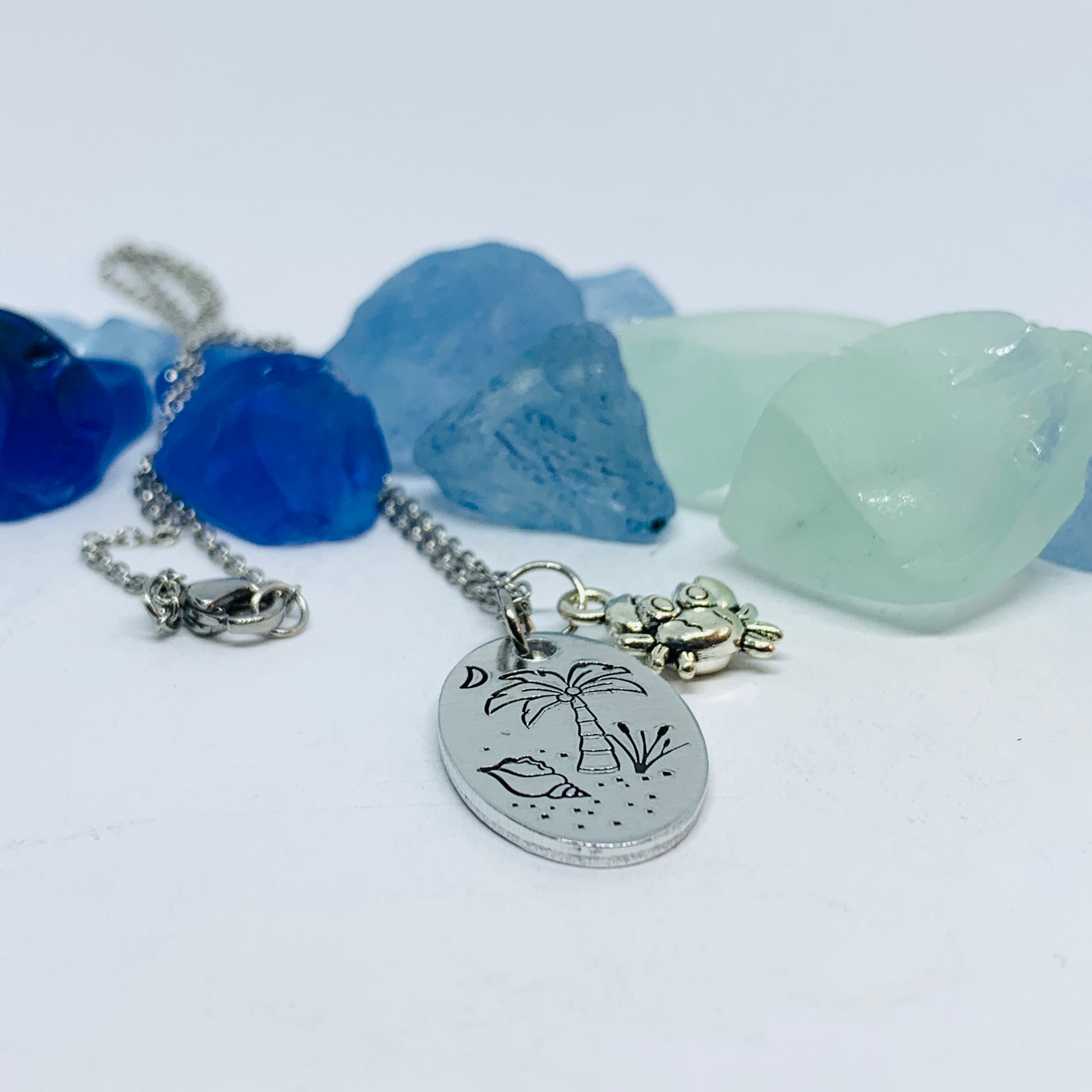 Beach Scene - Hand Stamped Necklace | Tropical | Vacation Jewelry | Crab Charm | Palm Trees Sand Shells Crescent Moon | Cruise | South Carolina