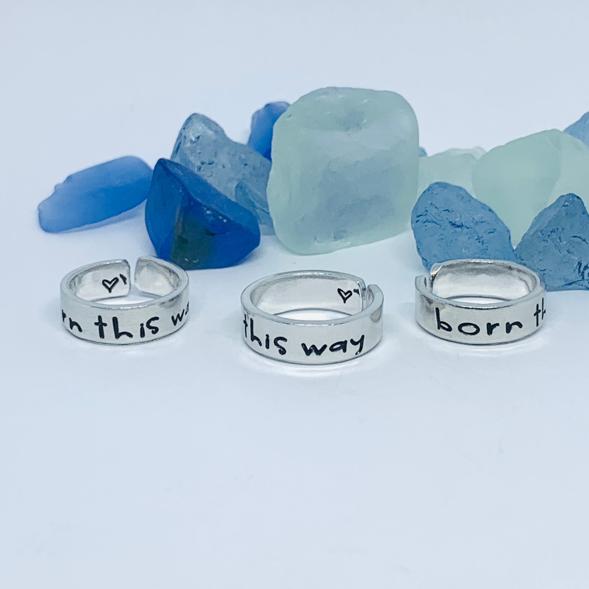 These hand-stamped 1/4” width rings feature the words 'born this way’ front and center with a small hand drawn heart design on the far end - one outside, one in.