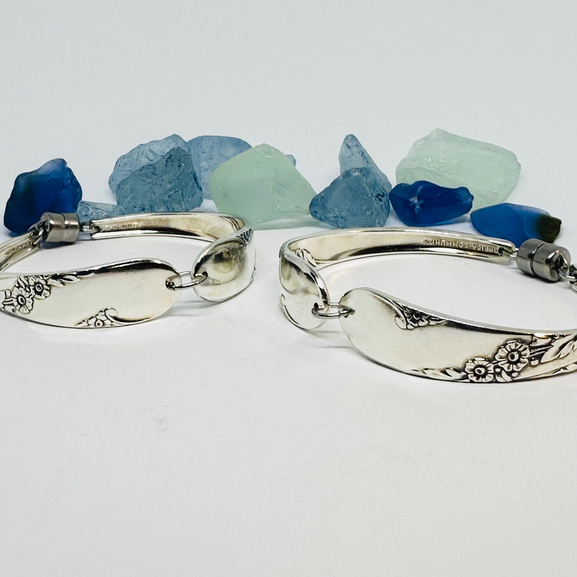 Bracelet created by hand by me from two vintage silver plated spoons known as “Bridal Wreath” introduced in 1950. The pattern is discontinued.
