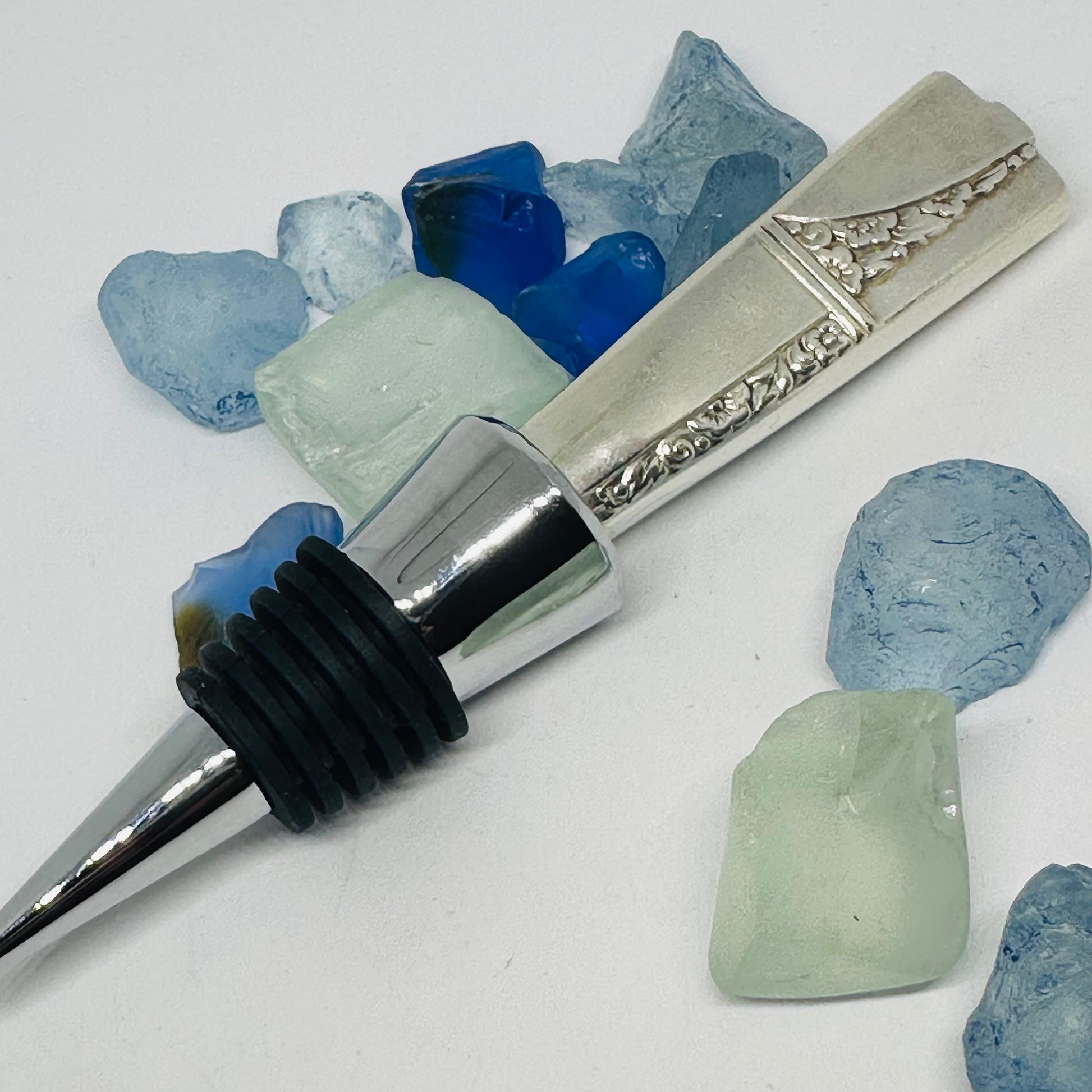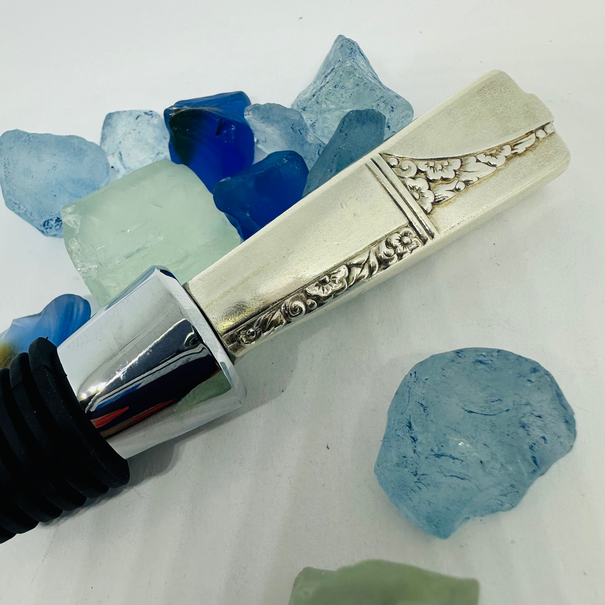 This wine bottle stopper was created by hand by me from a vintage silver plated knife handle known as “Caprice”.