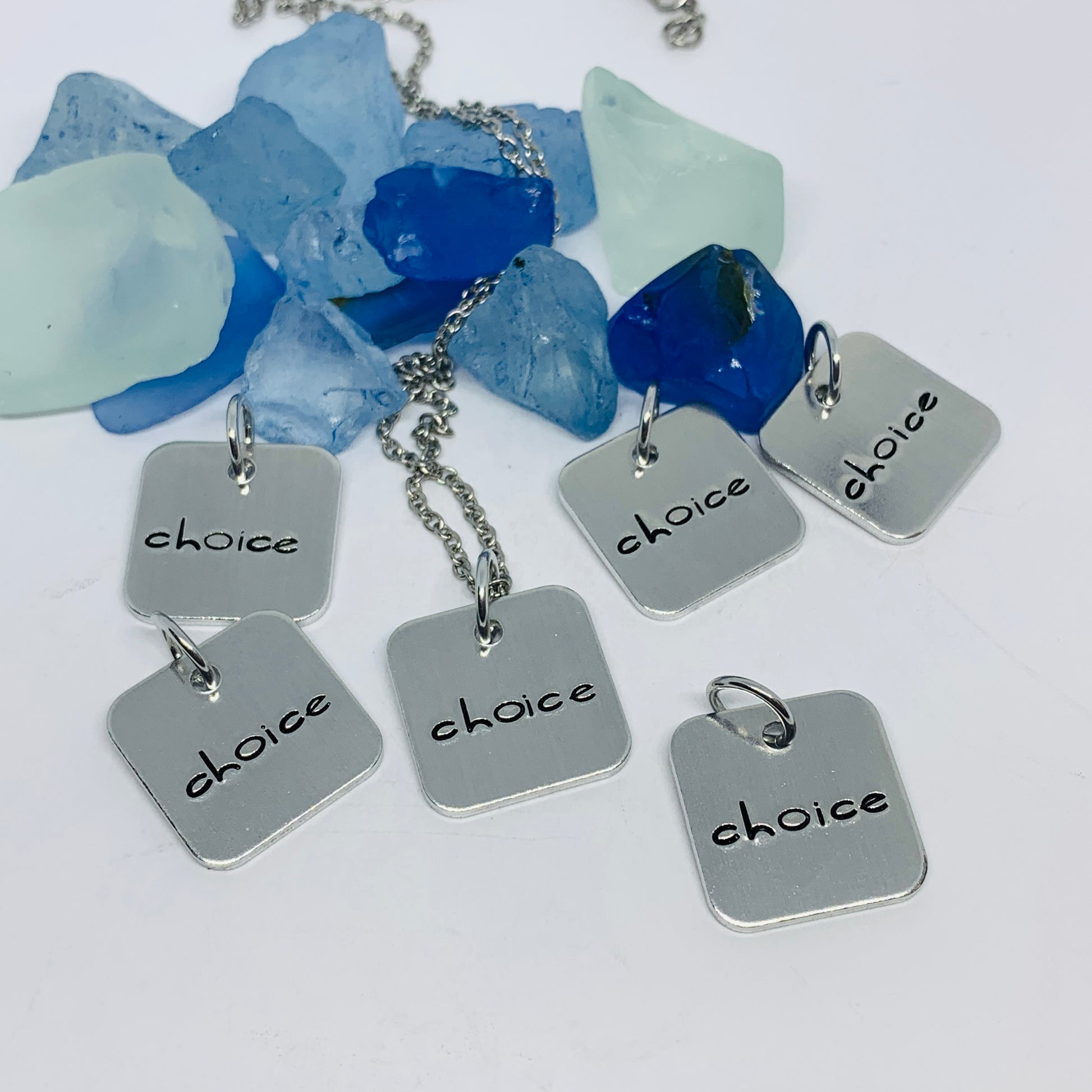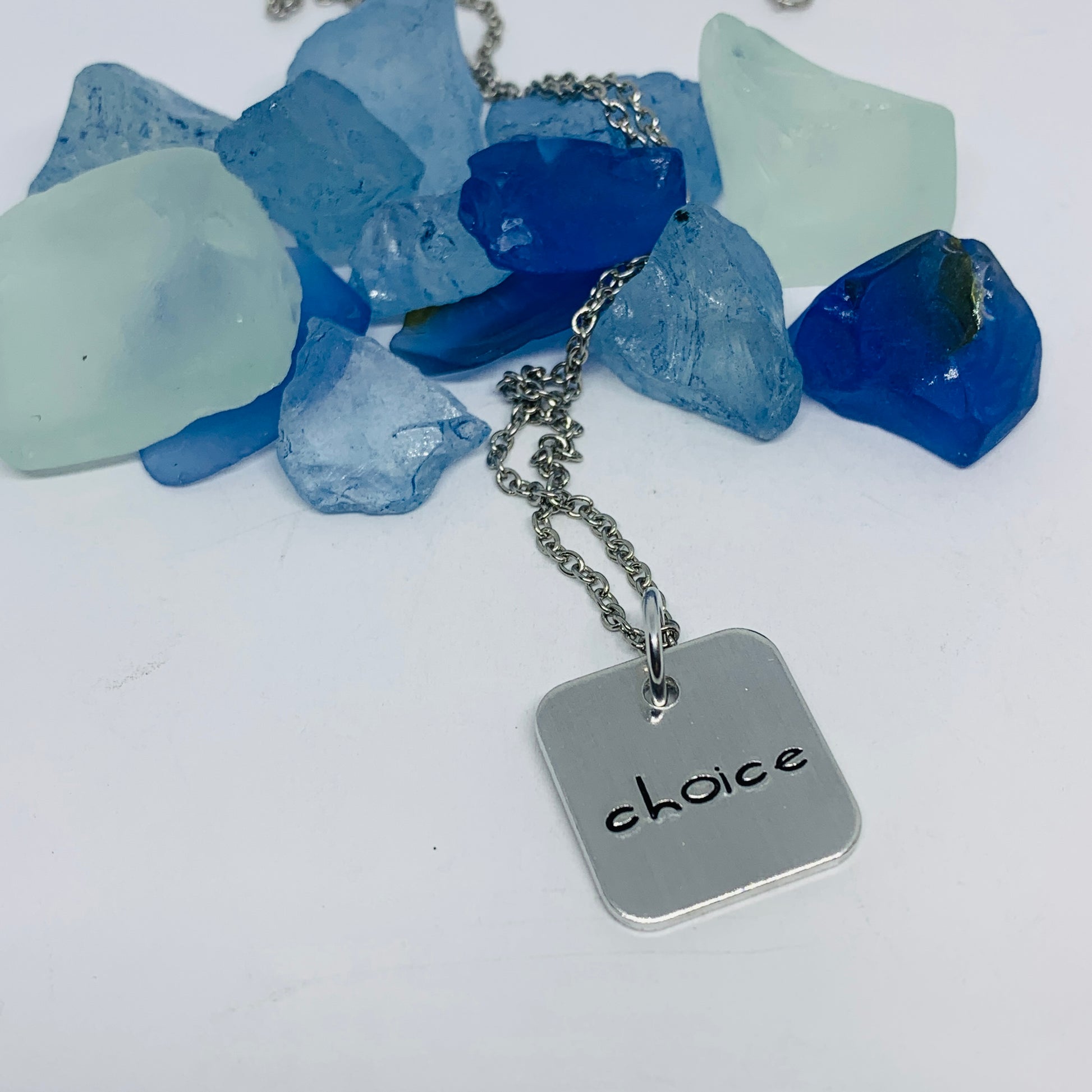 “Choice”. Hand stamped on a 3/4” aluminum square.