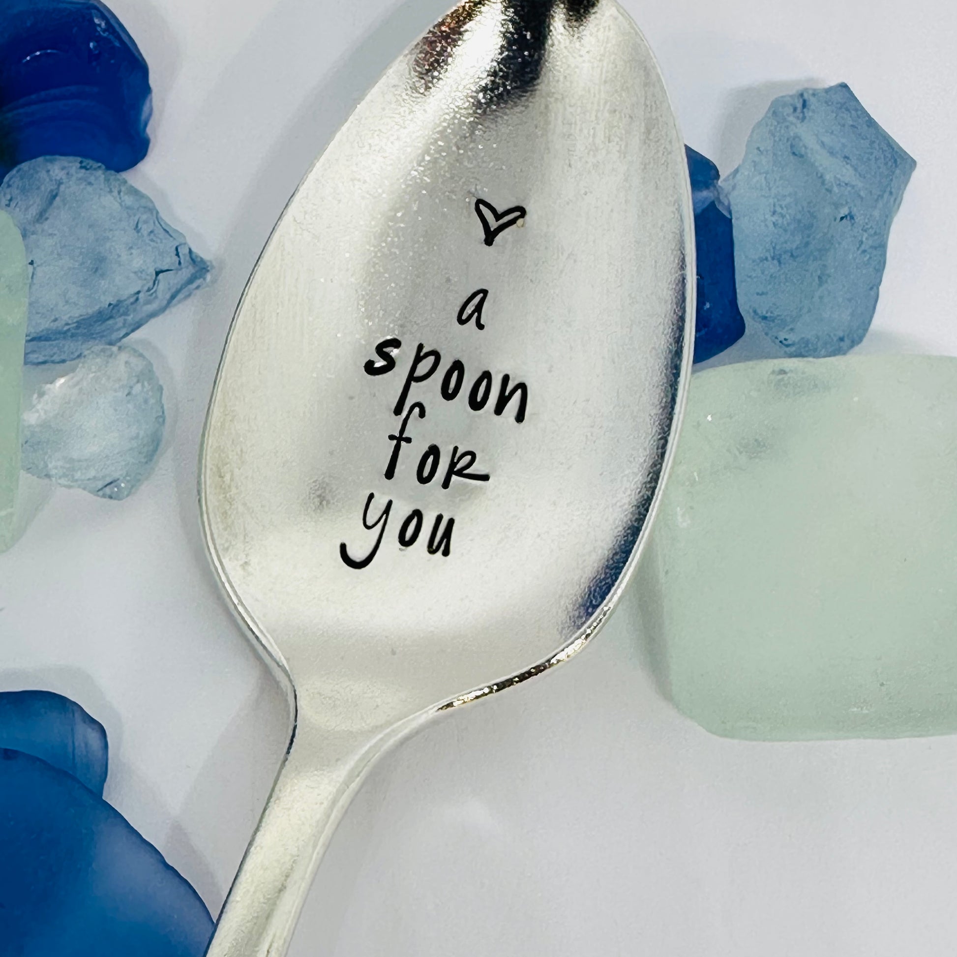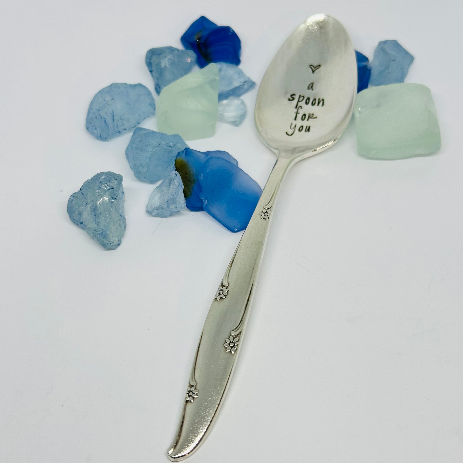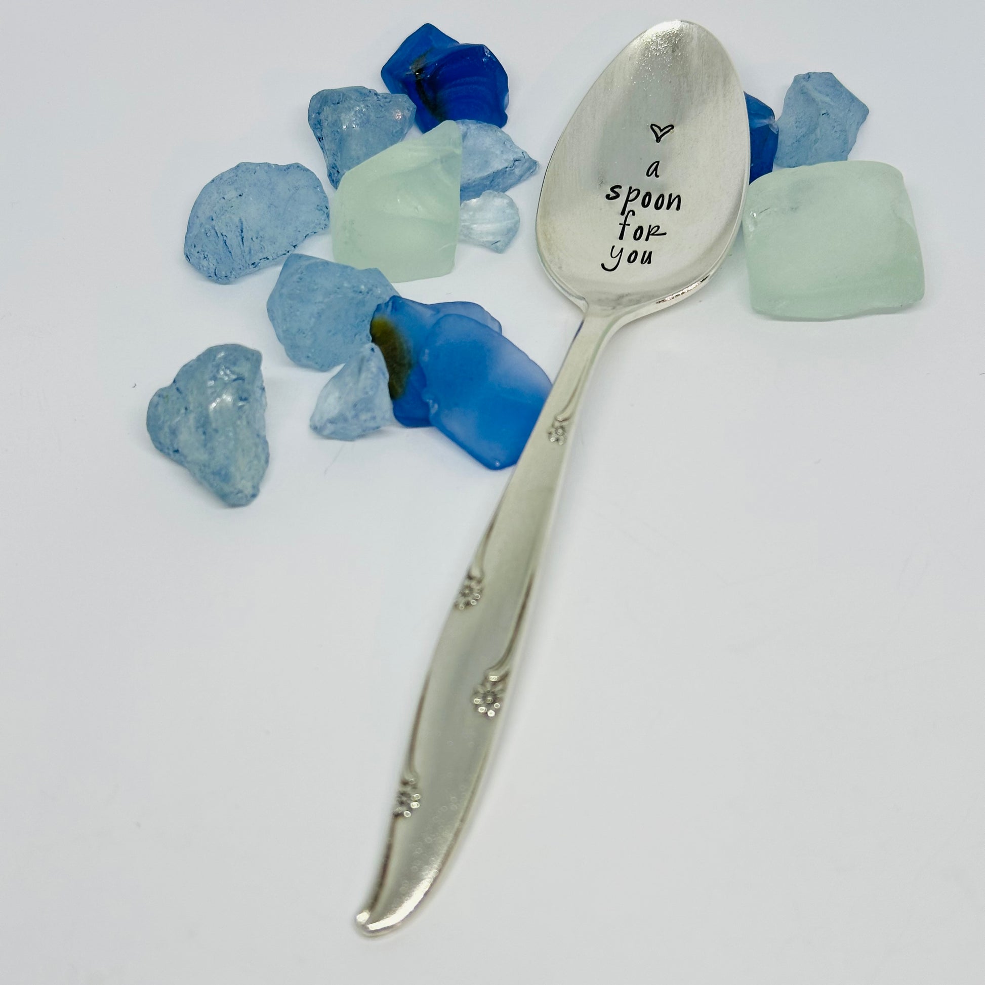 This listing is for one hand stamped vintage silverware spoon with the words "a spoon for you" topped by a cute hand drawn heart design stamped in the center of the spoon bowl.