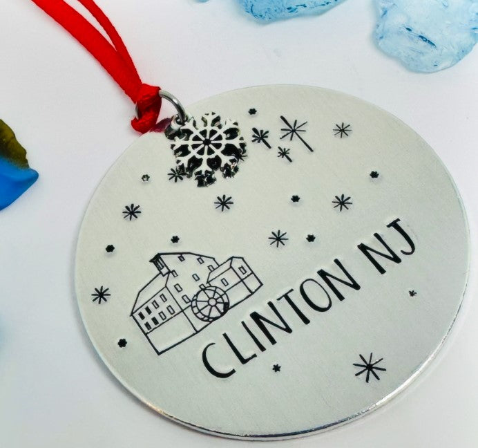 This 2” round aluminum ornament features a hand stamped grist mill design surrounded by stars and includes the words “CLINTON NJ”.