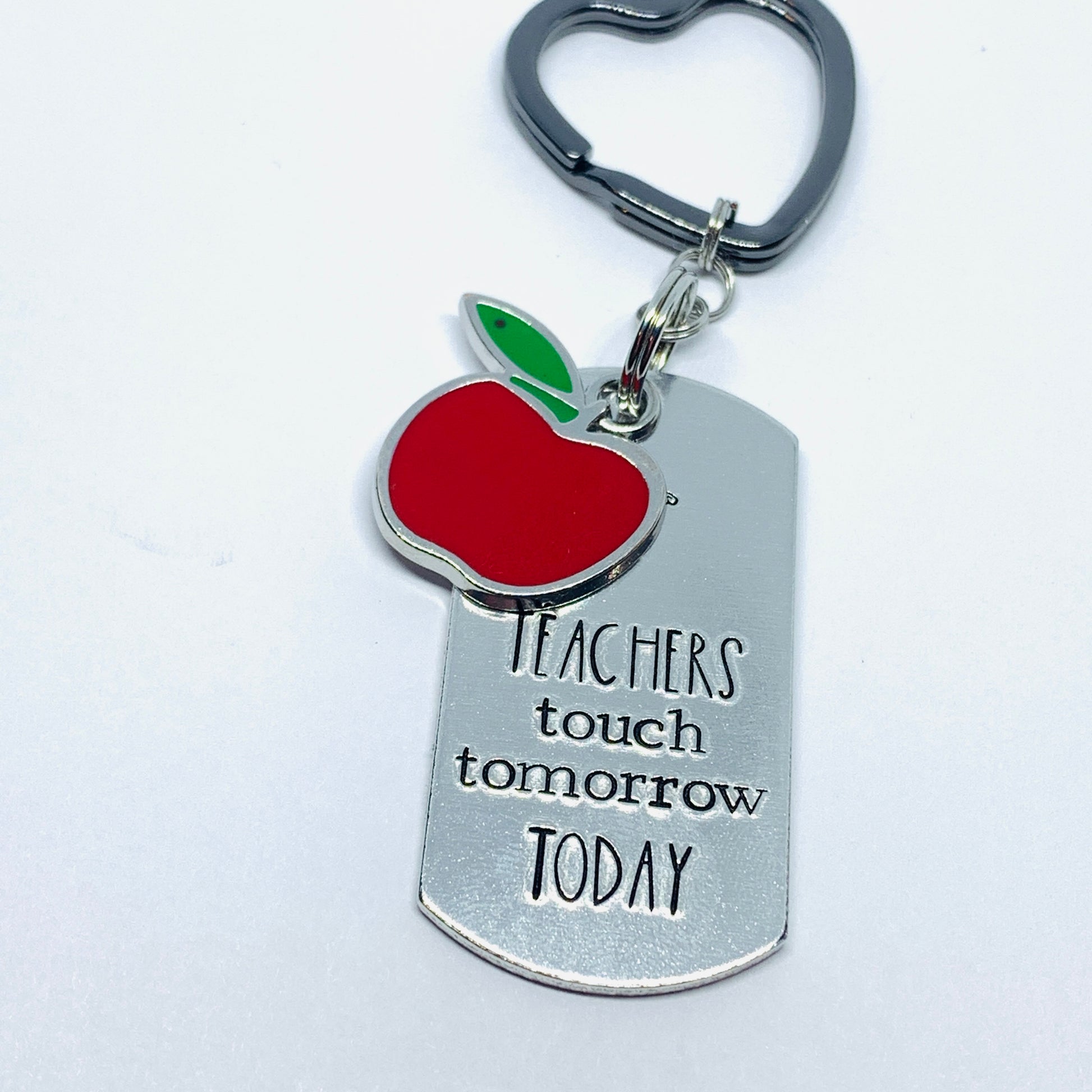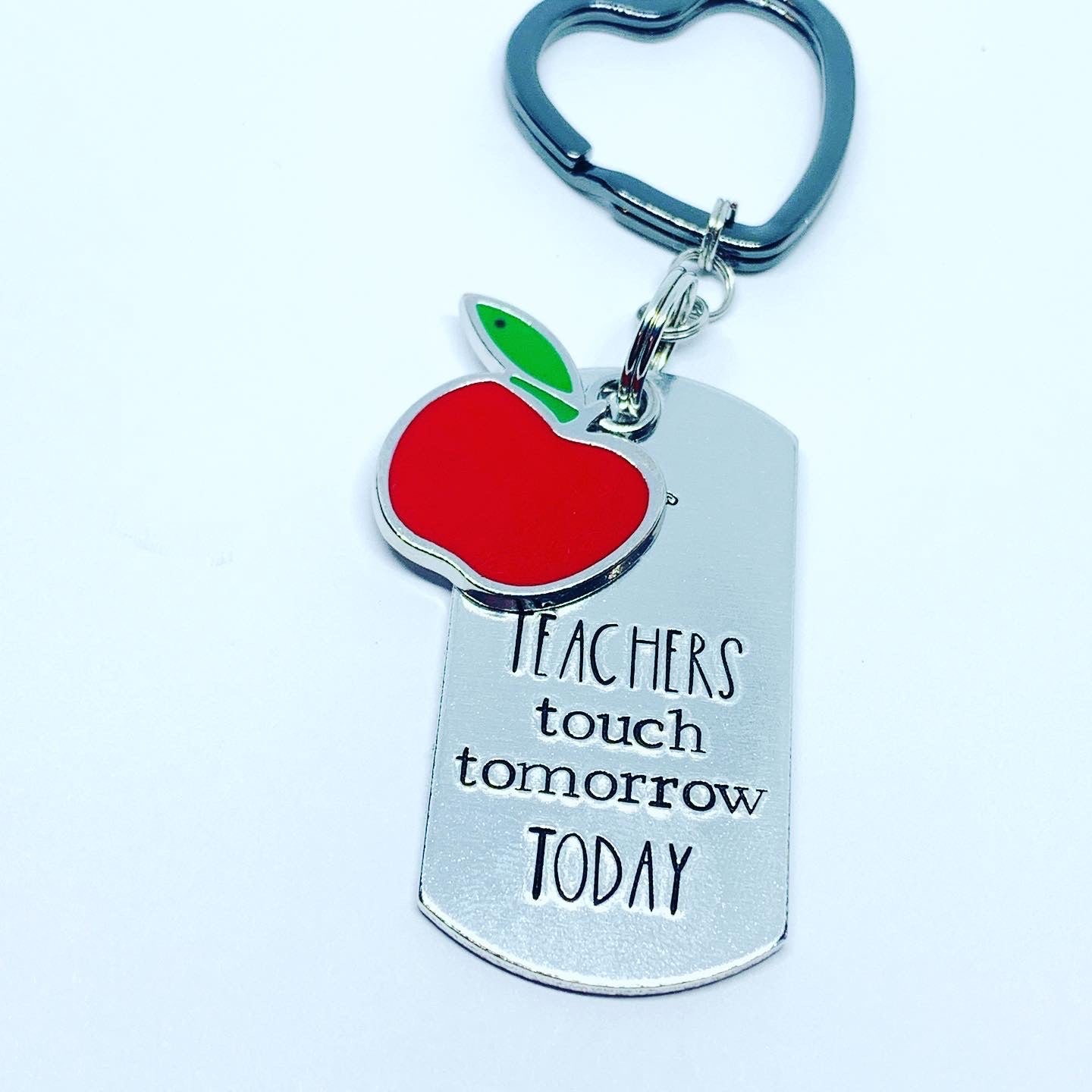 Aluminum dog tag 2x1” features hand stamped words “ teachers touch tomorrow today” with an adorable red apple enamel charm and grey heart (or red apple) shaped key ring!
