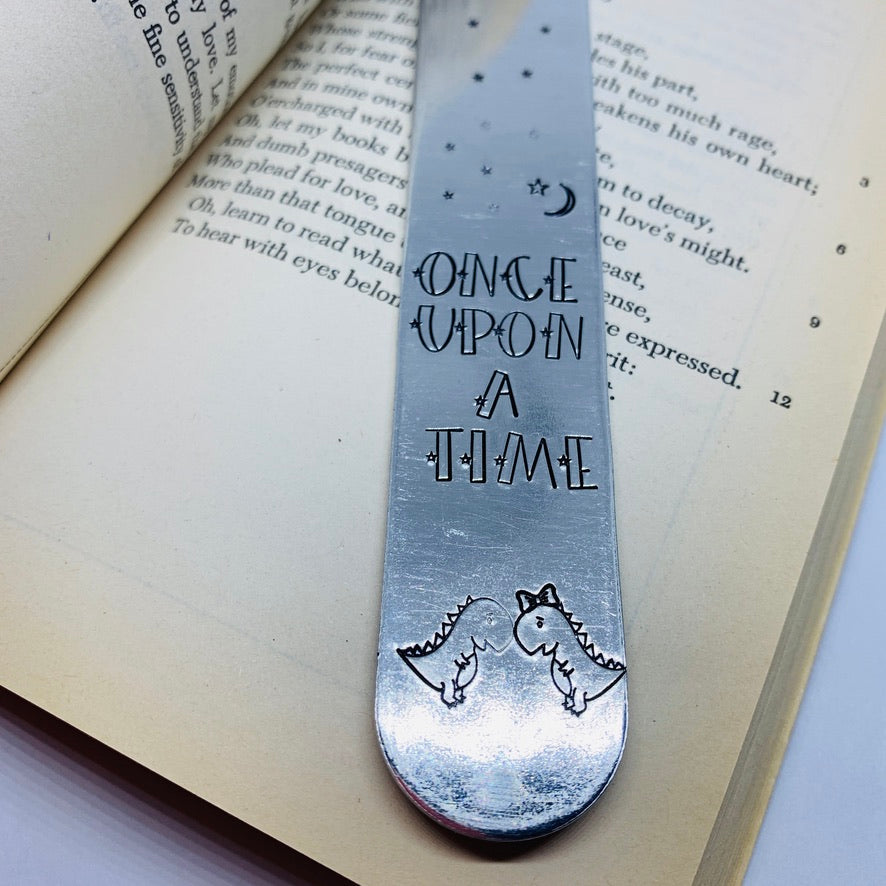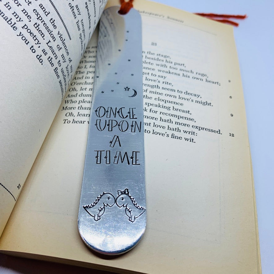 Aluminum 1"x6" bookmark features hand stamped his and her dinosaurs and the words "Once Upon a Time" along with stars and moon designs and a tassel at the top. A great way to encourage reading for kids of all ages!