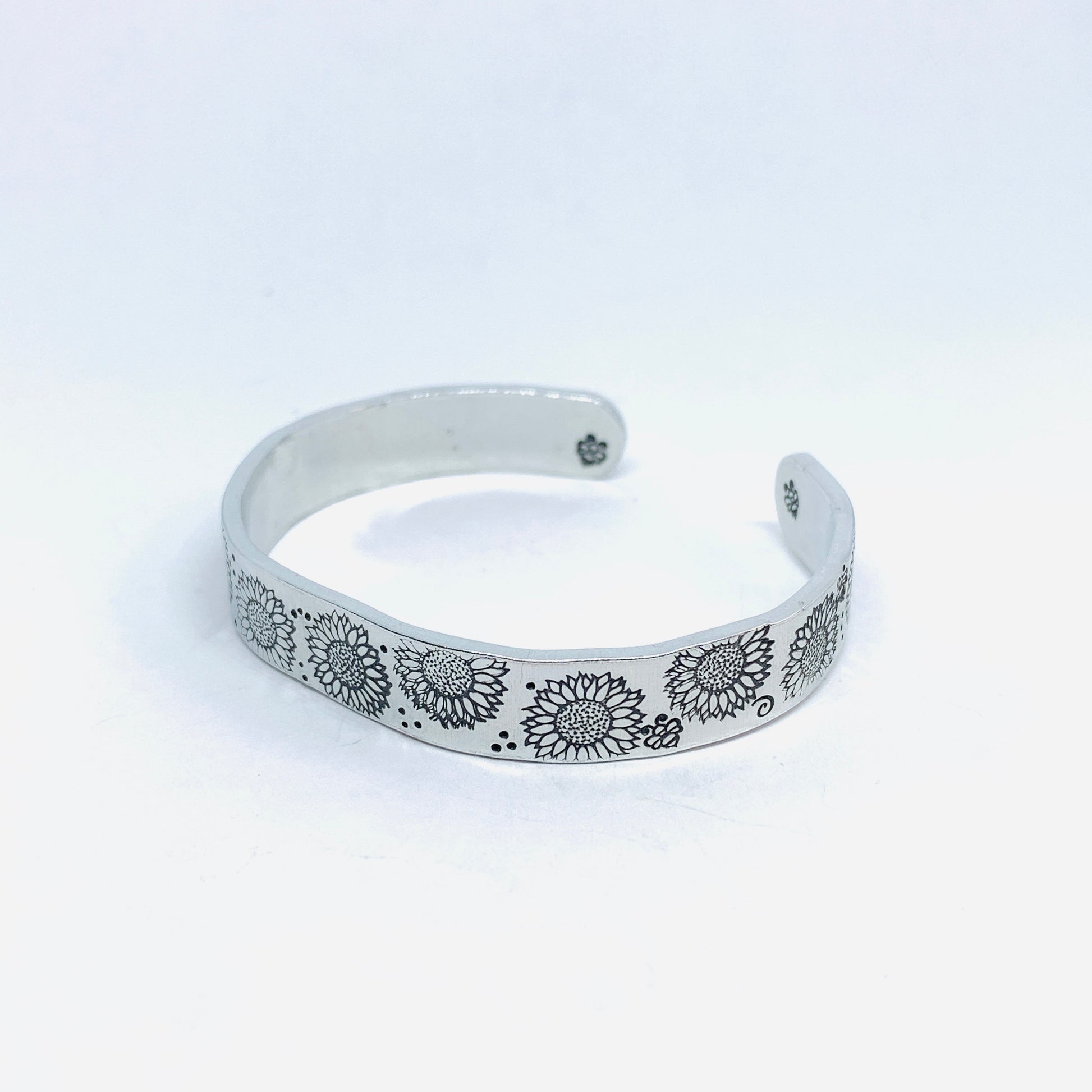 Beautiful sunflowers, bumblebees, dots and swirls fill the outside, while cute bumblebees are stamped on the inside far ends of the 3/8" x 6" cuff.