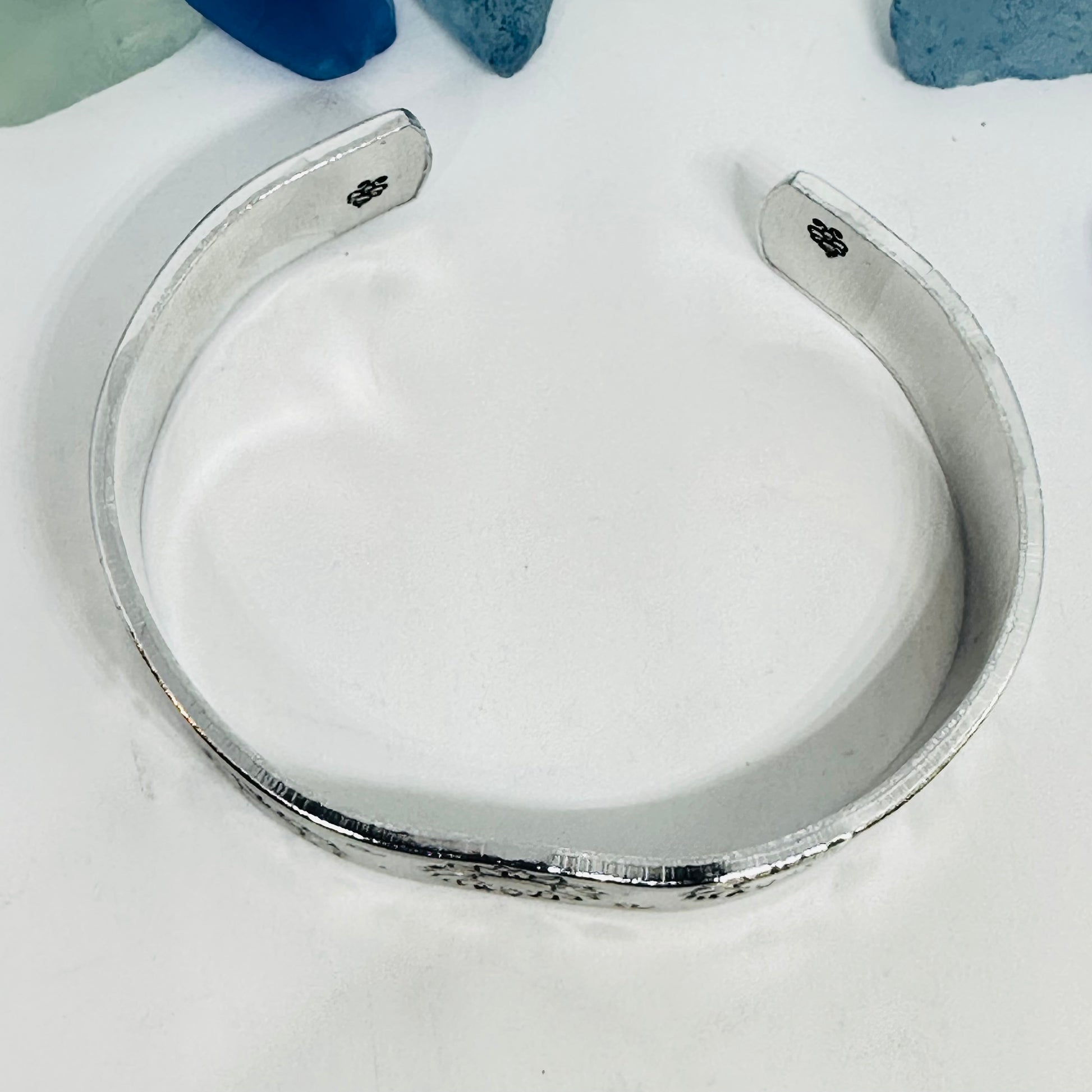 I personally hand stamp all of the lettering and designs in my studio. Each design is hand aligned and punched into the metal, so the placement of the wording and designs will vary slightly from piece to piece. After stamping, I darken the impressions so they stand out. To retain the contrast, it is highly recommended that the piece is not exposed to excessive moisture (bathing, swimming, exercise).