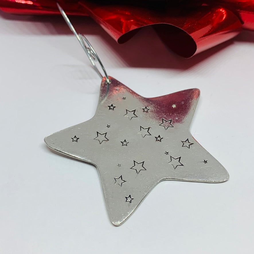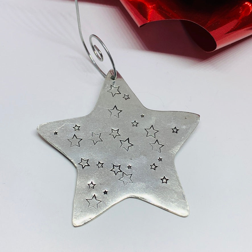 Pewter star-shaped ornament features hand stamped stars and the words "Oh Holy Night" on one side and various sized star designs on the back.