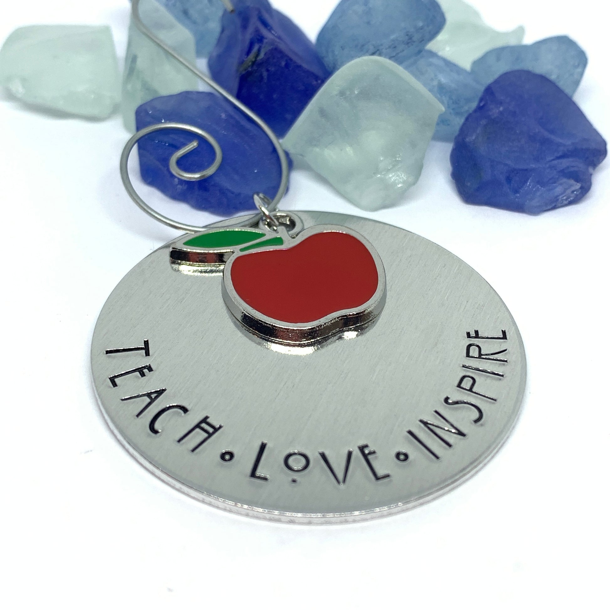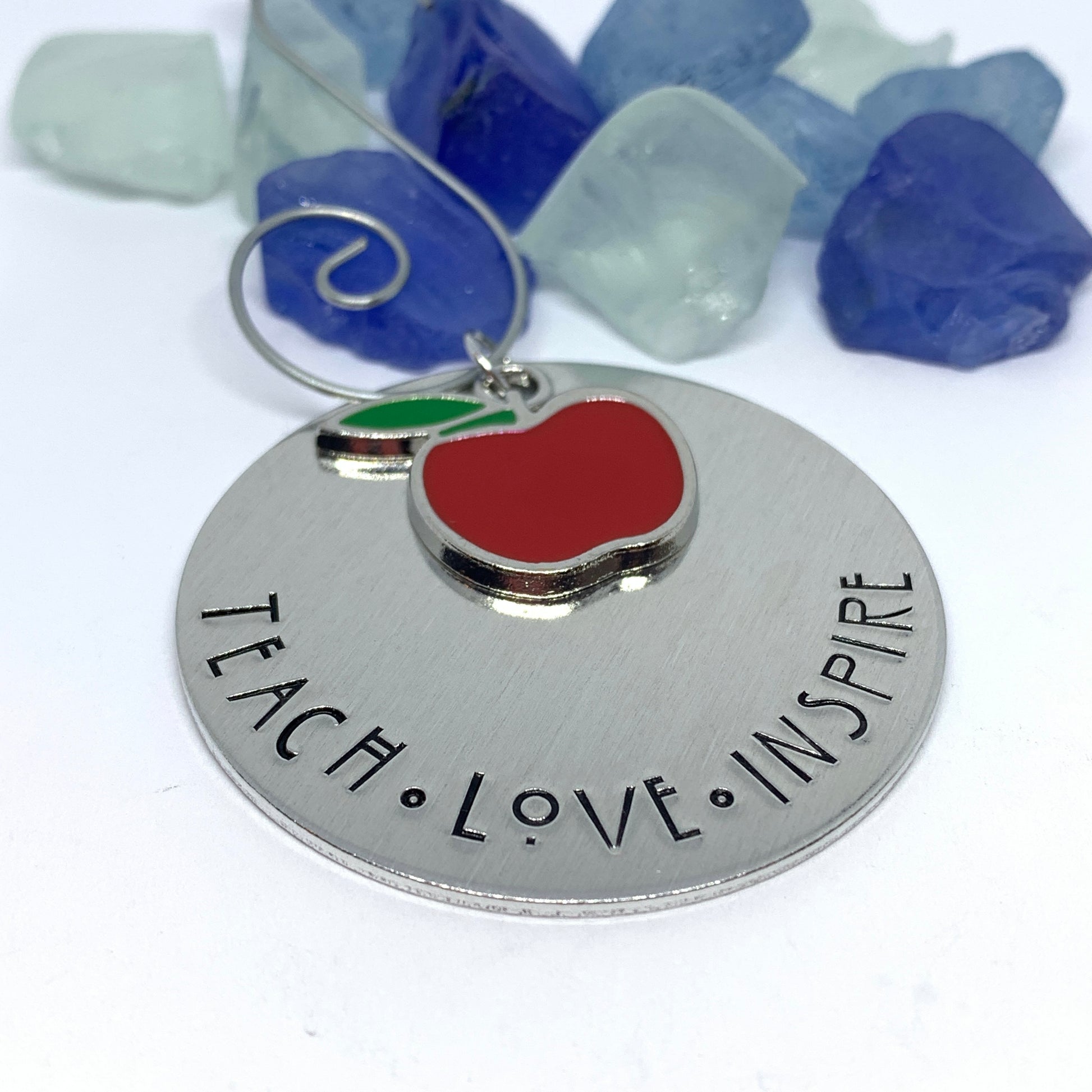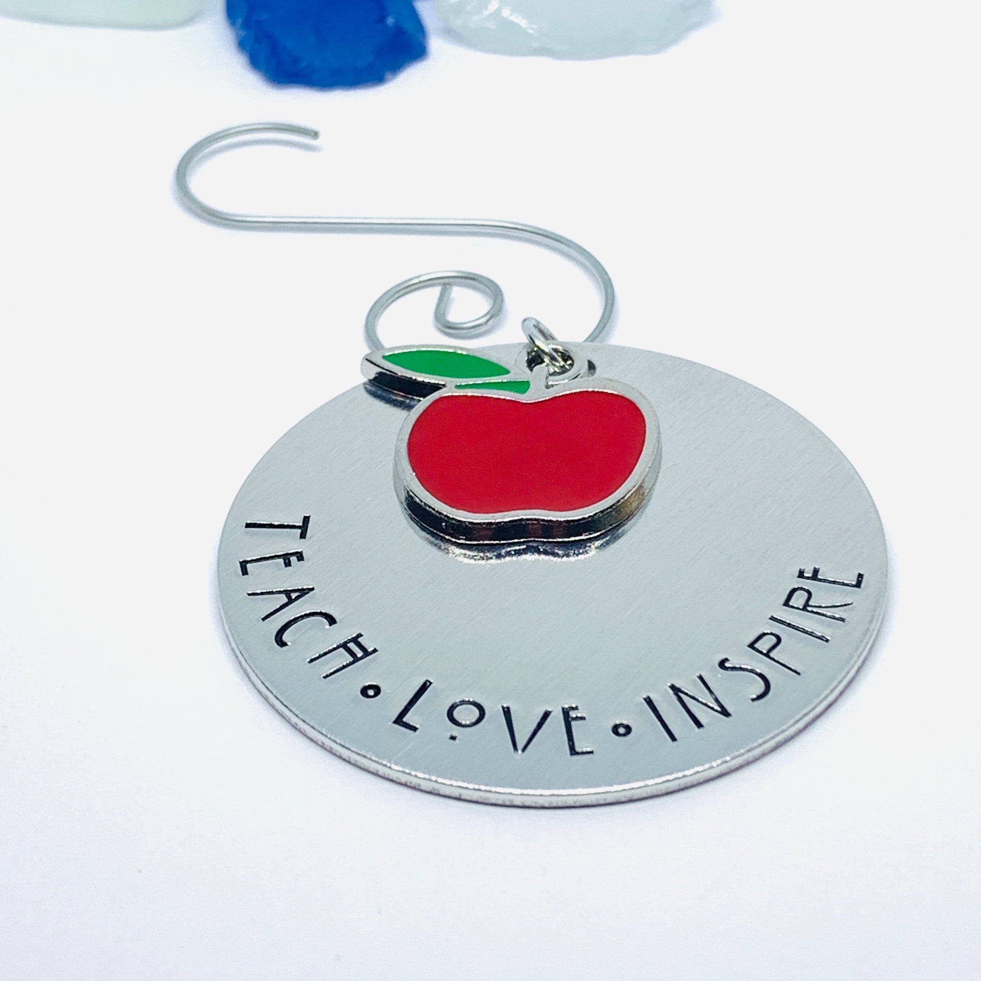 Two inch round aluminum ornament features hand stamped words “Teach * Love * Inspire”. The star of the show is the adorable red apple enamel charm!