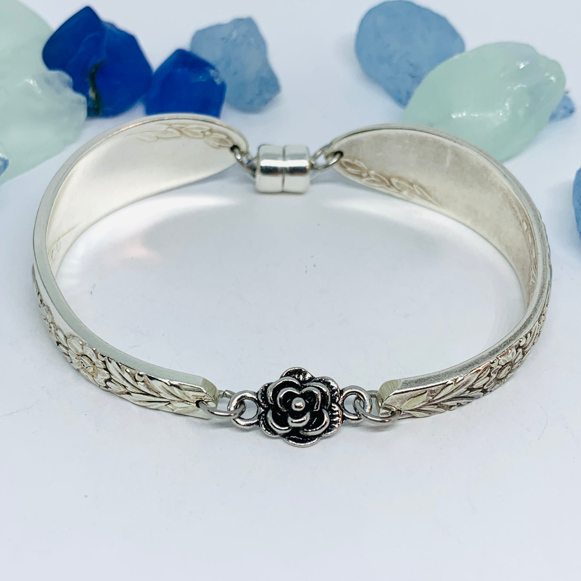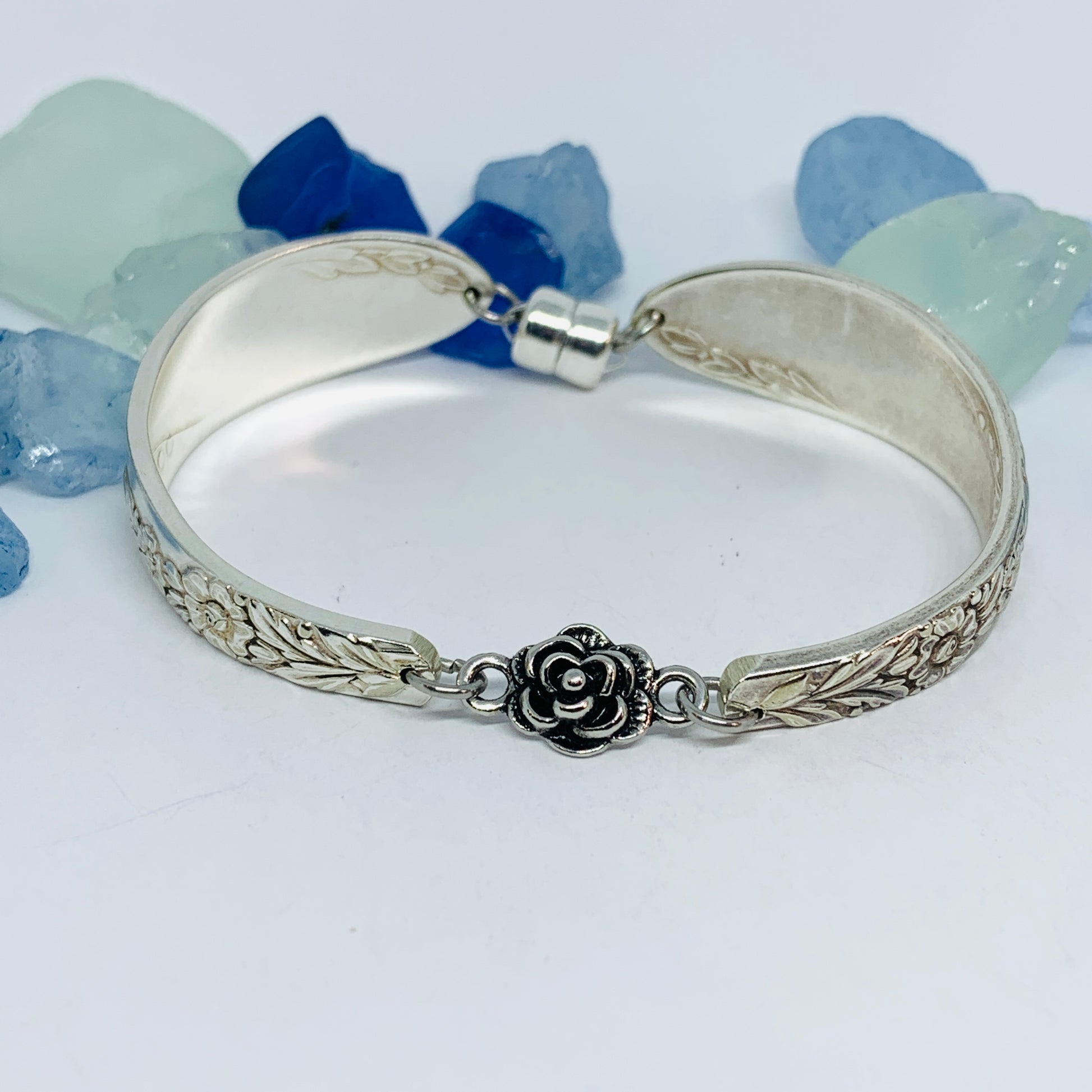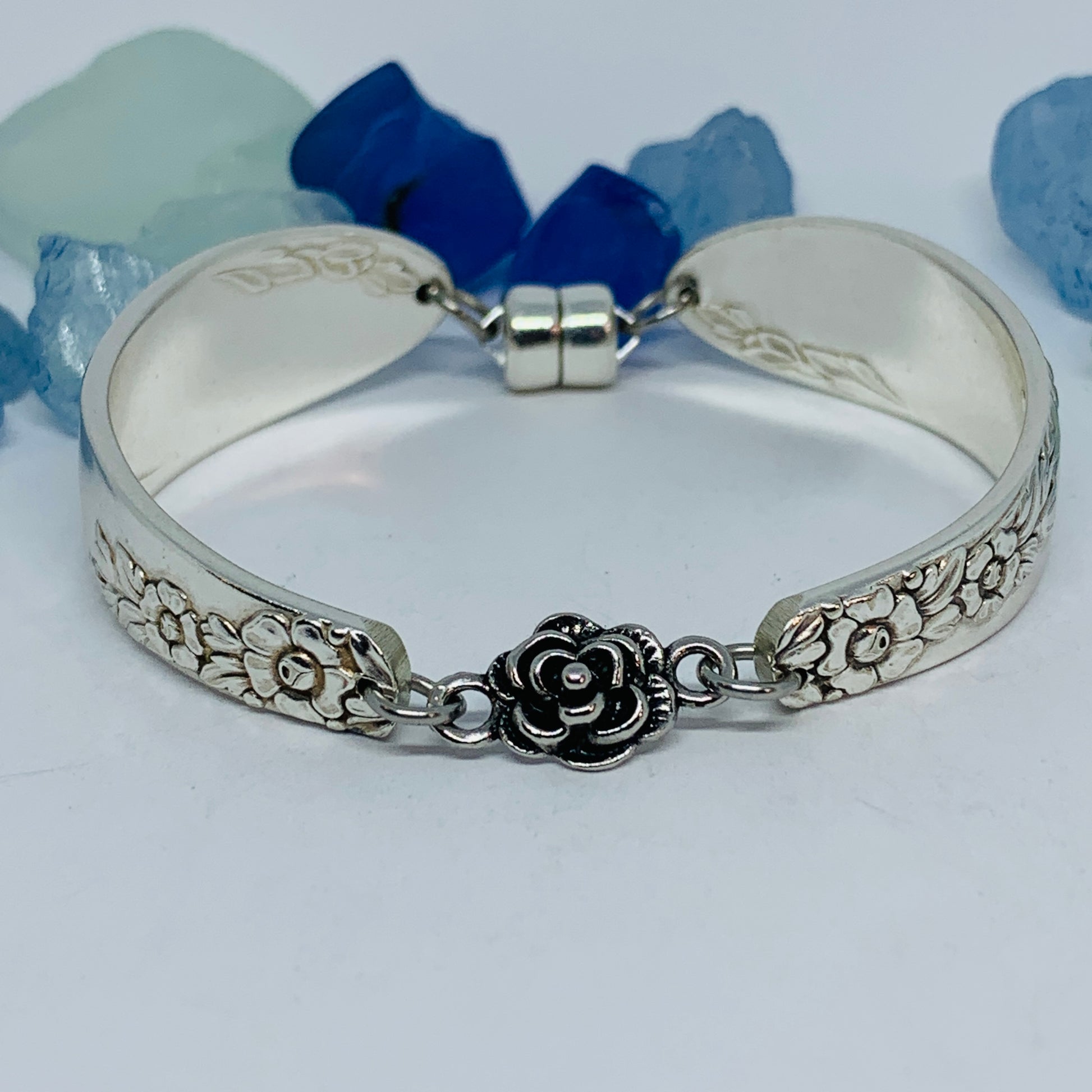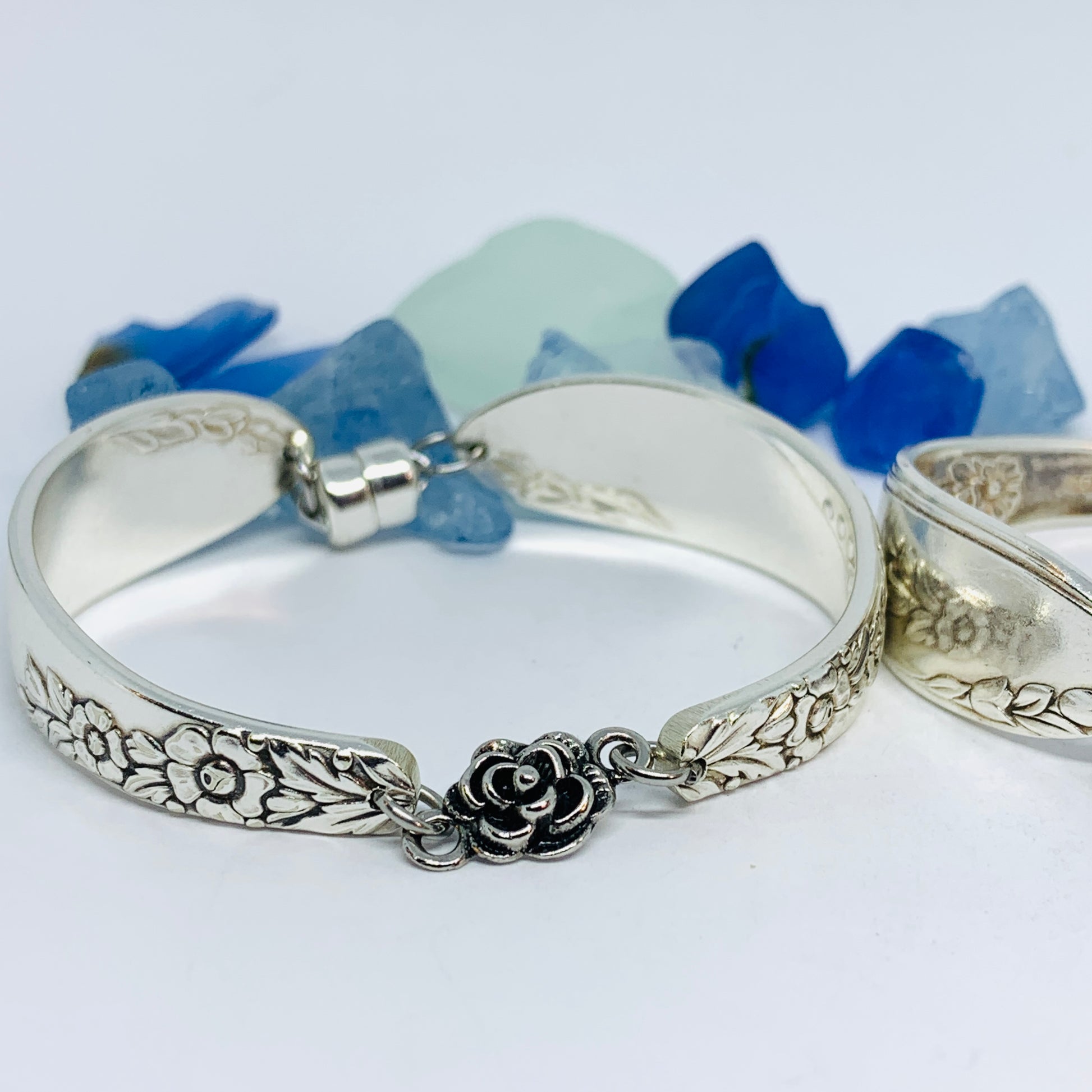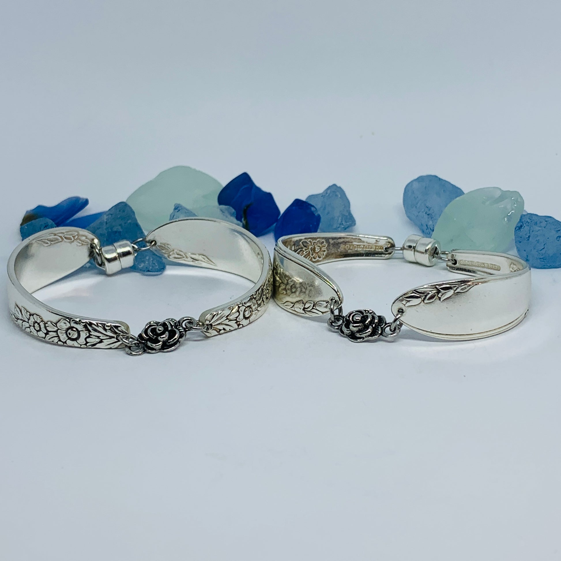 Bracelet created by hand by me from two vintage silver plated spoons known as “Country Lane” introduced in 1954 by Oneida. These also have a beautiful floral connector charm between the two pieces atop the bracelet.