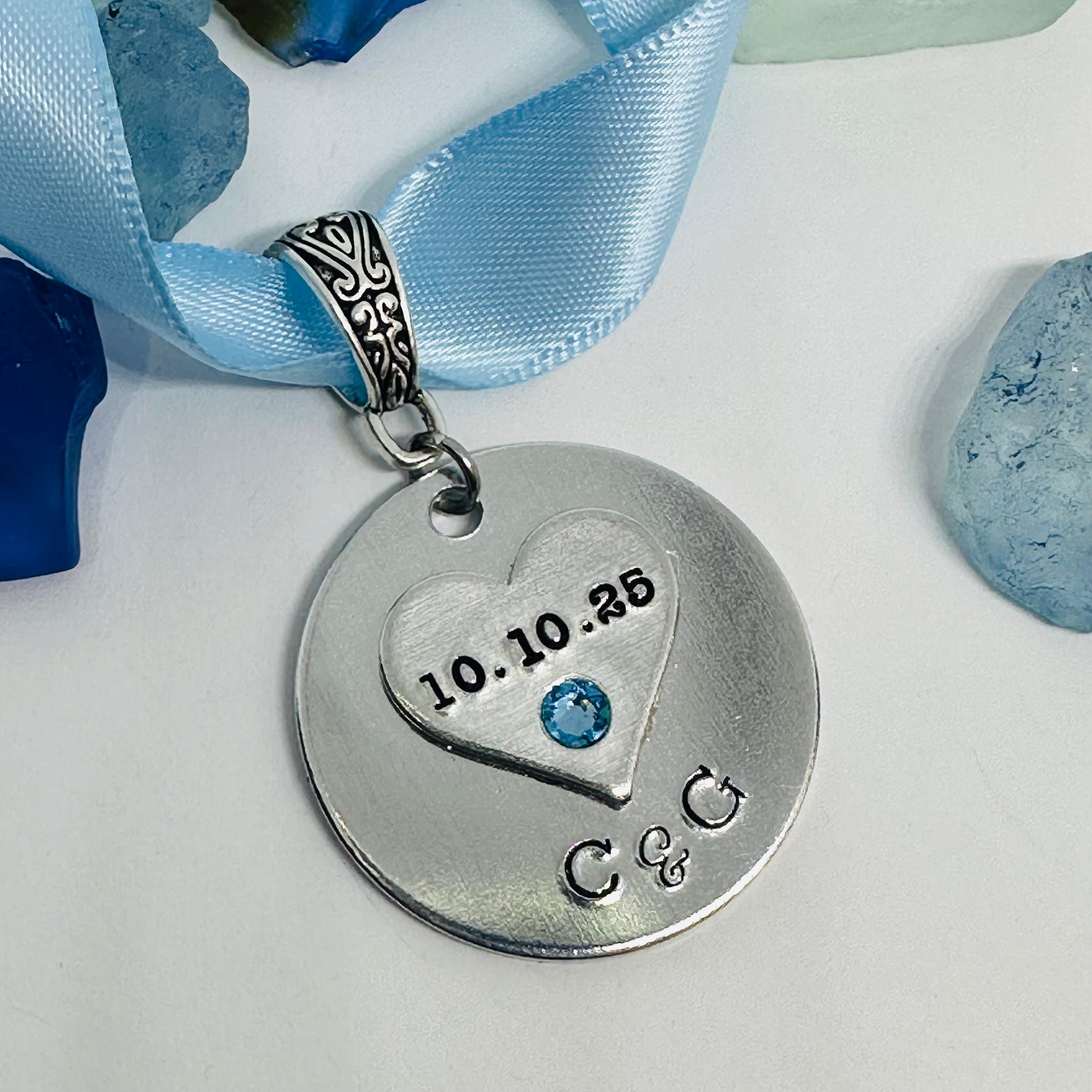 Small heart stamped with 10.10.25 and a blue crystal - attached atop a 1.25" round disk, stamped with "C & G". Together, they are attached to a filigree pendant clasp slider bail, complete with a light blue ribbon.