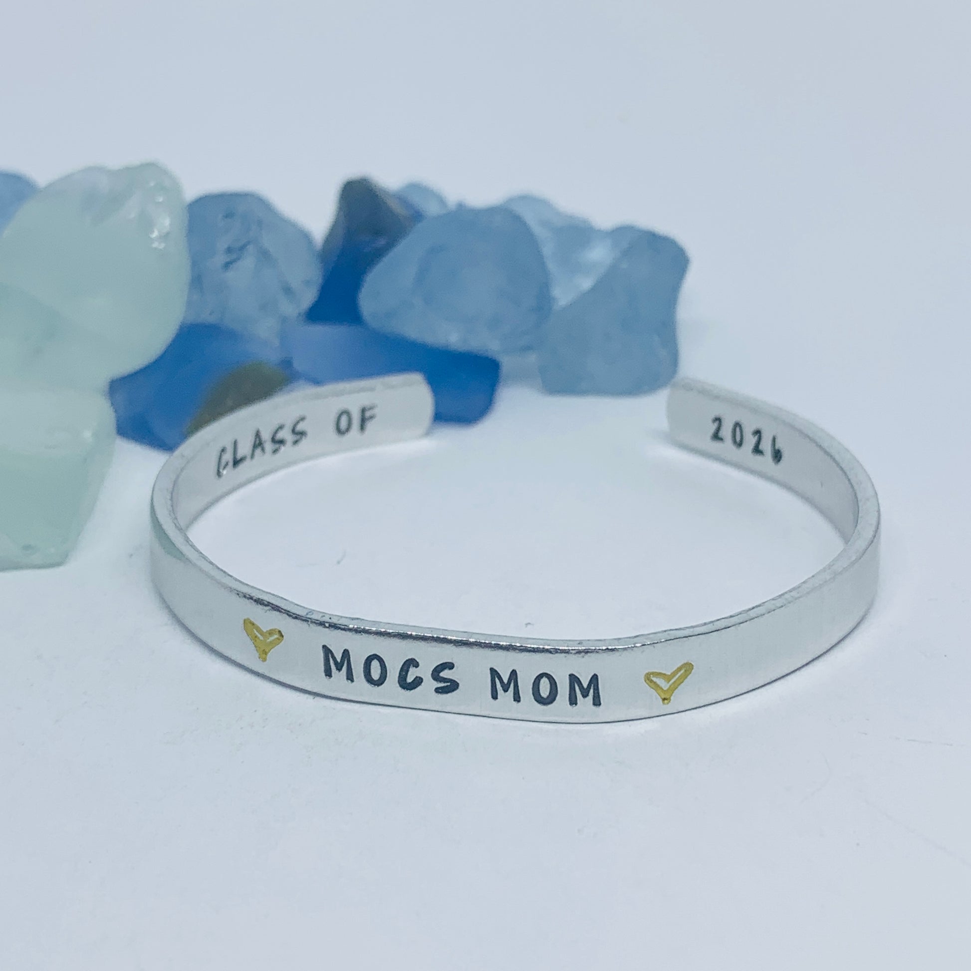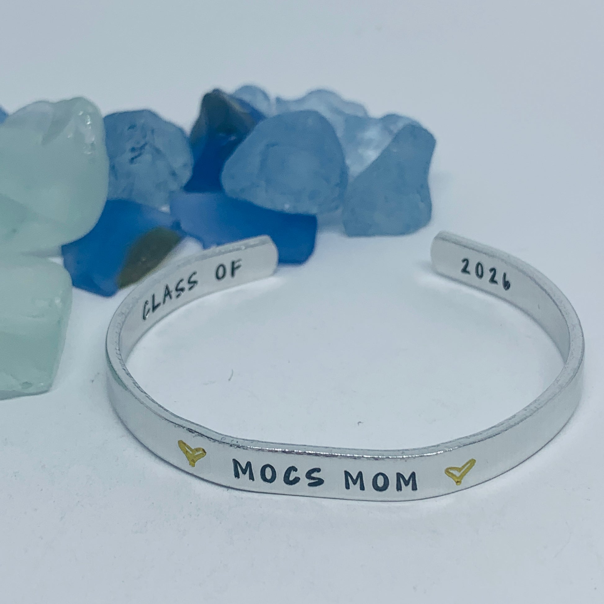 Custom order for Nicole. One hand stamped aluminum cuff bracelet with “MOCS MOM” with two hearts on either side centered on the outside and CLASS OF xxxx on the inside. Similar to photo