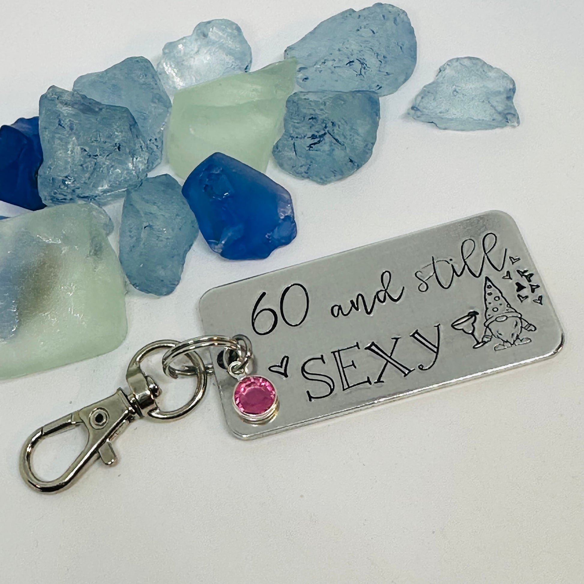 Custom order for Tara - a hand stamped “60 and still sexy” - purse tag with a Swarovski crystal October birthstone charm and stamped margaritas, hearts (and gnome?) designs.