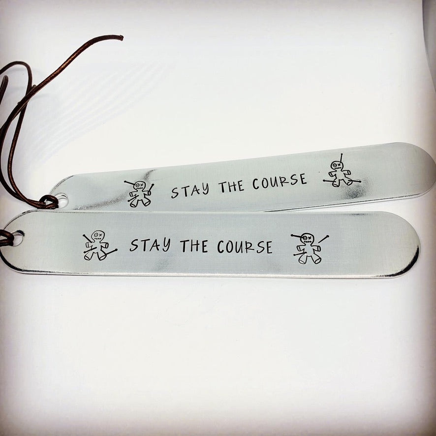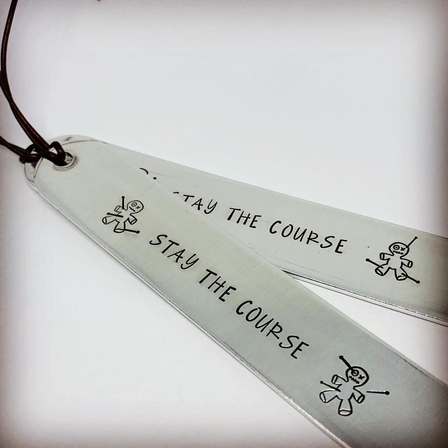 Aluminum 1"x6" bookmark ready for you to personalize! Includes a tassel at the top t make it easy to find your spot in the book. A great way to encourage reading for kids of all ages! Featured here is an example of a custom order.