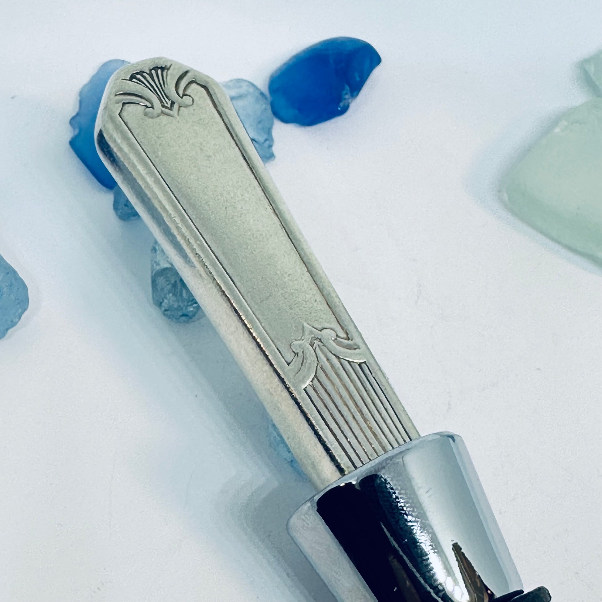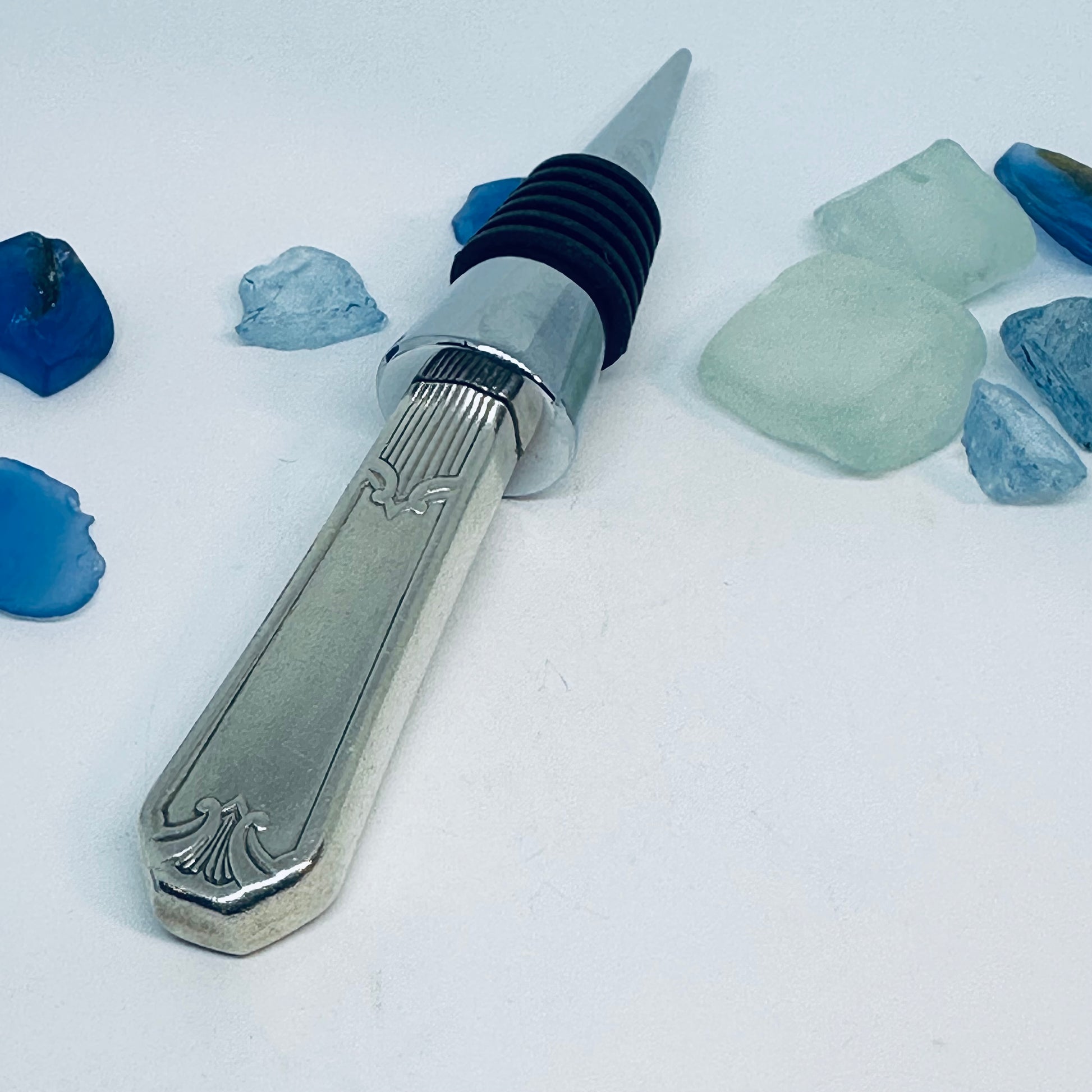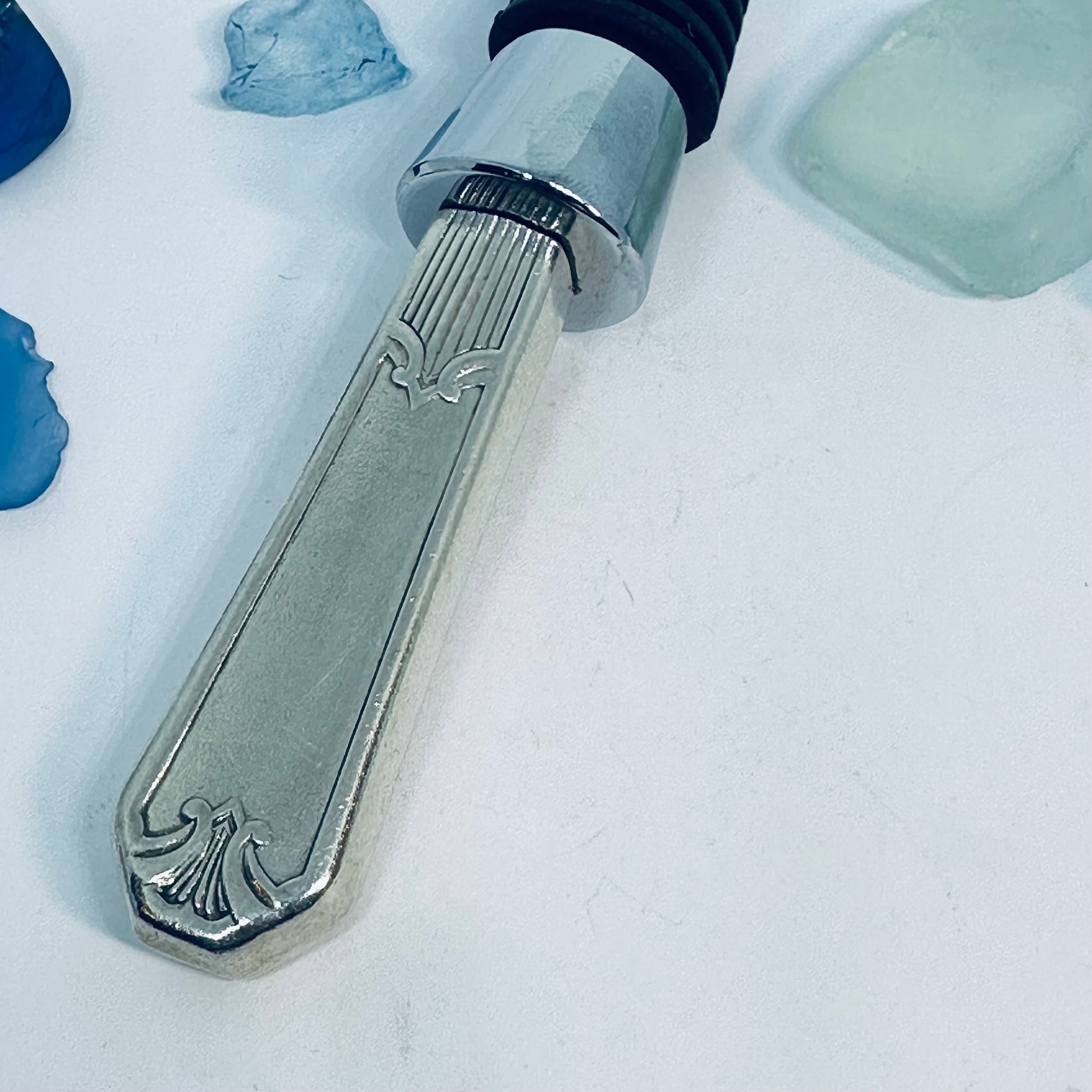 This wine bottle stopper was created by hand by me from a vintage silver plated knife handle known as “Daffodil”.