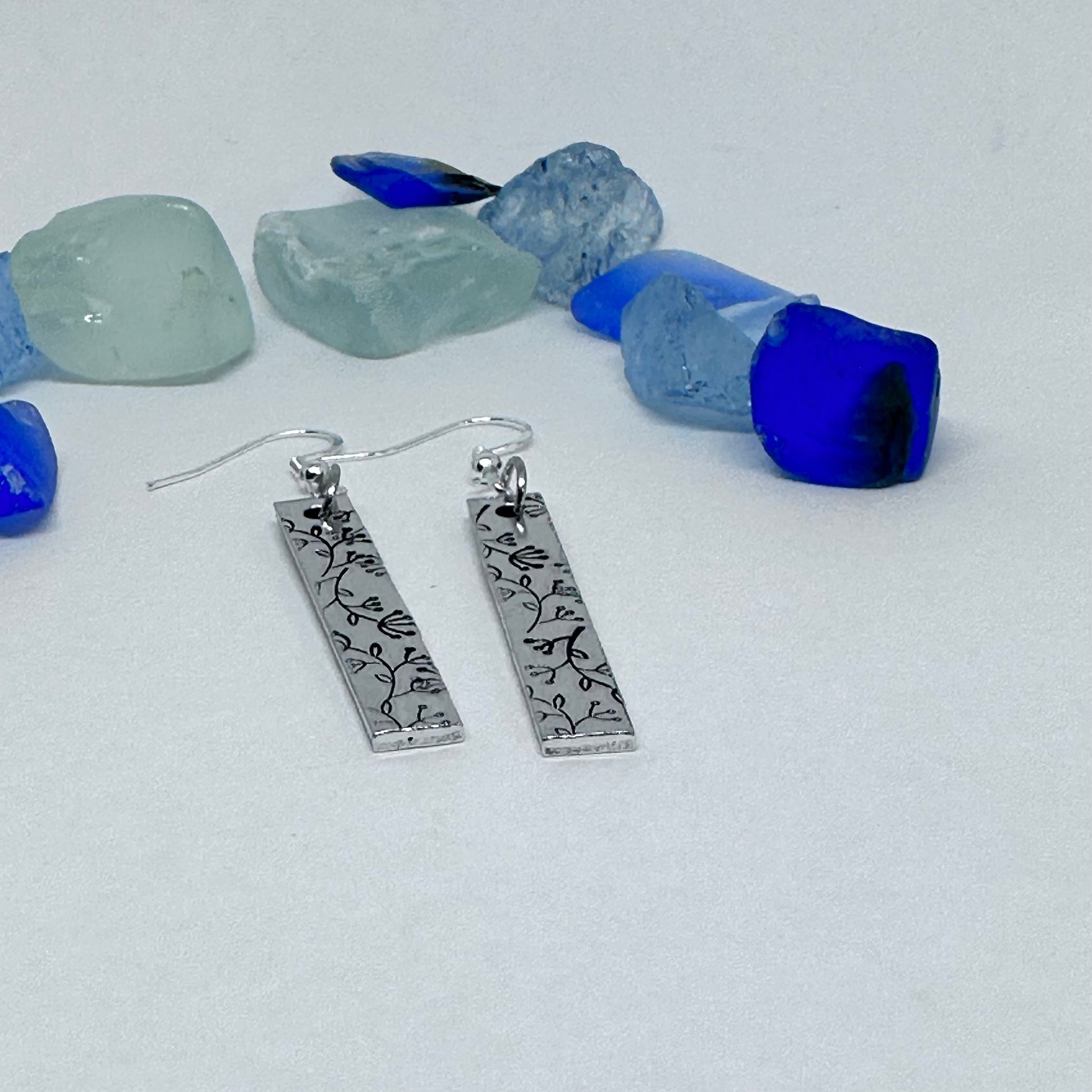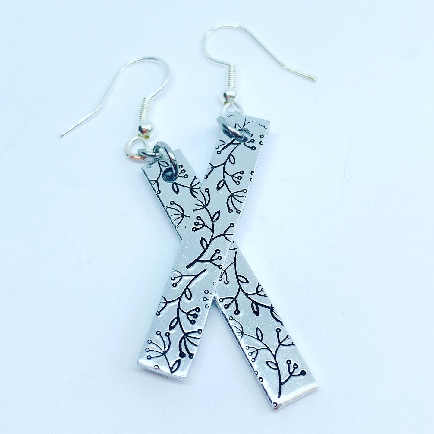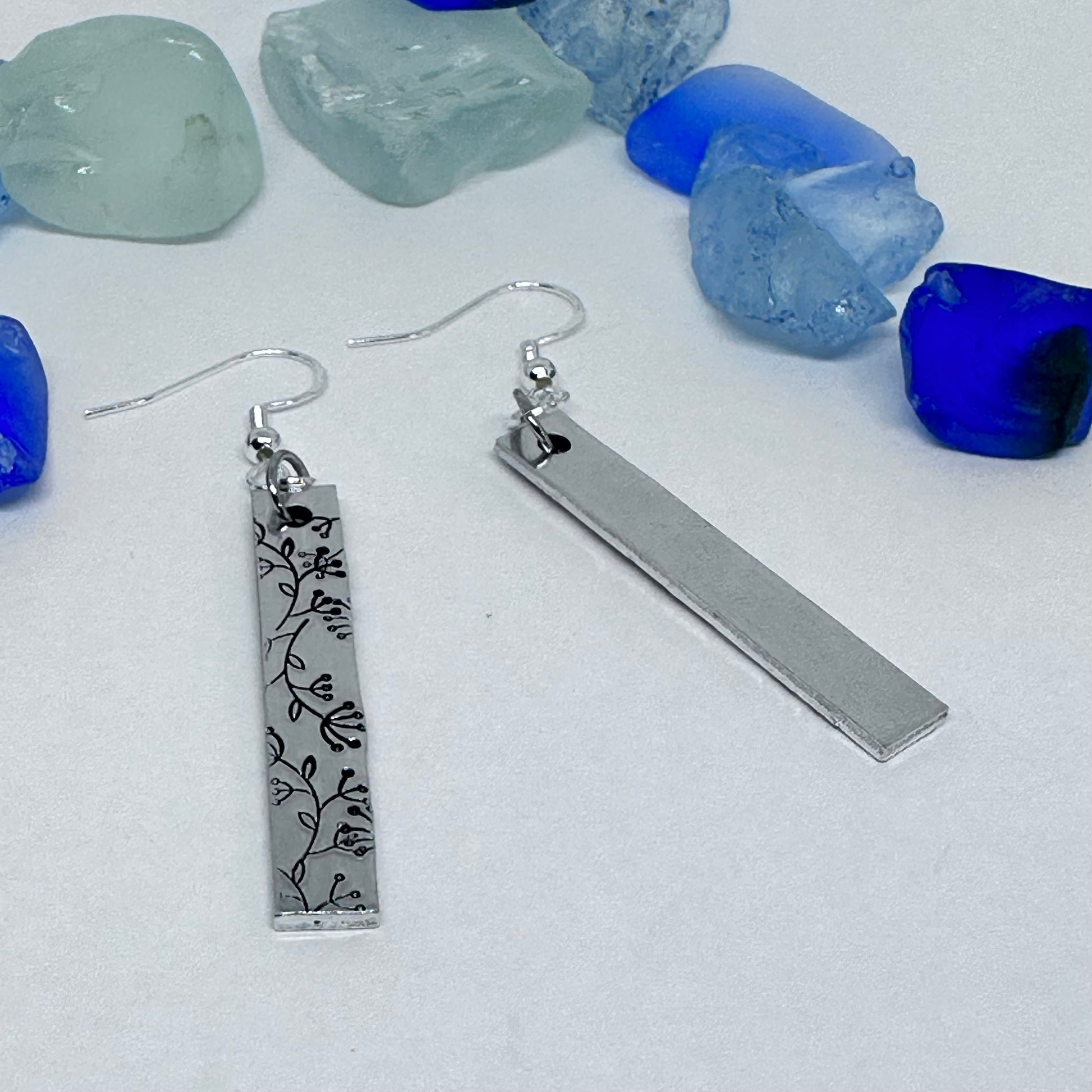 These hand stamped earrings are attached to silver plated ear wires by a silver jump ring and a stainless steel jump ring. They come with clear earring backs to prevent loss!