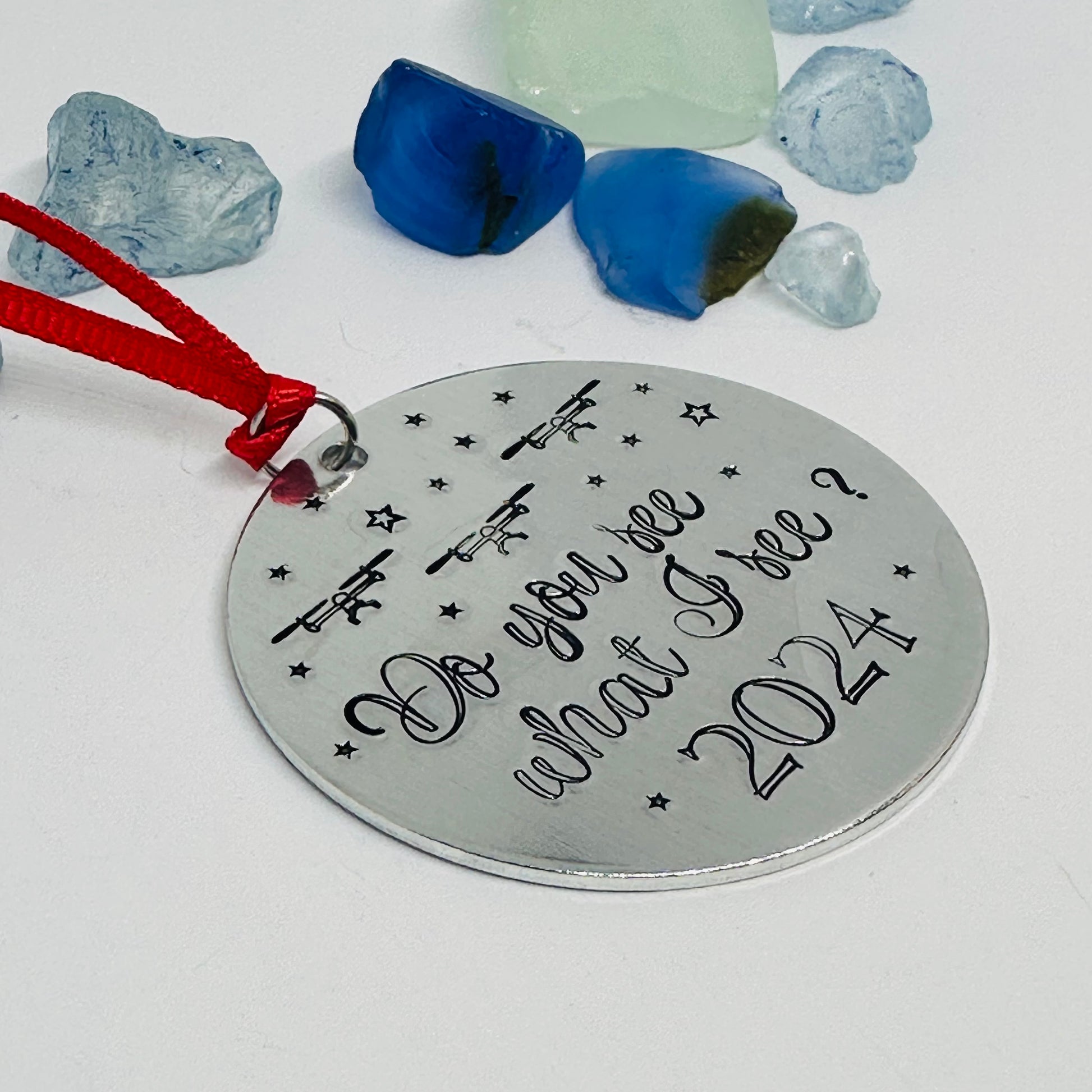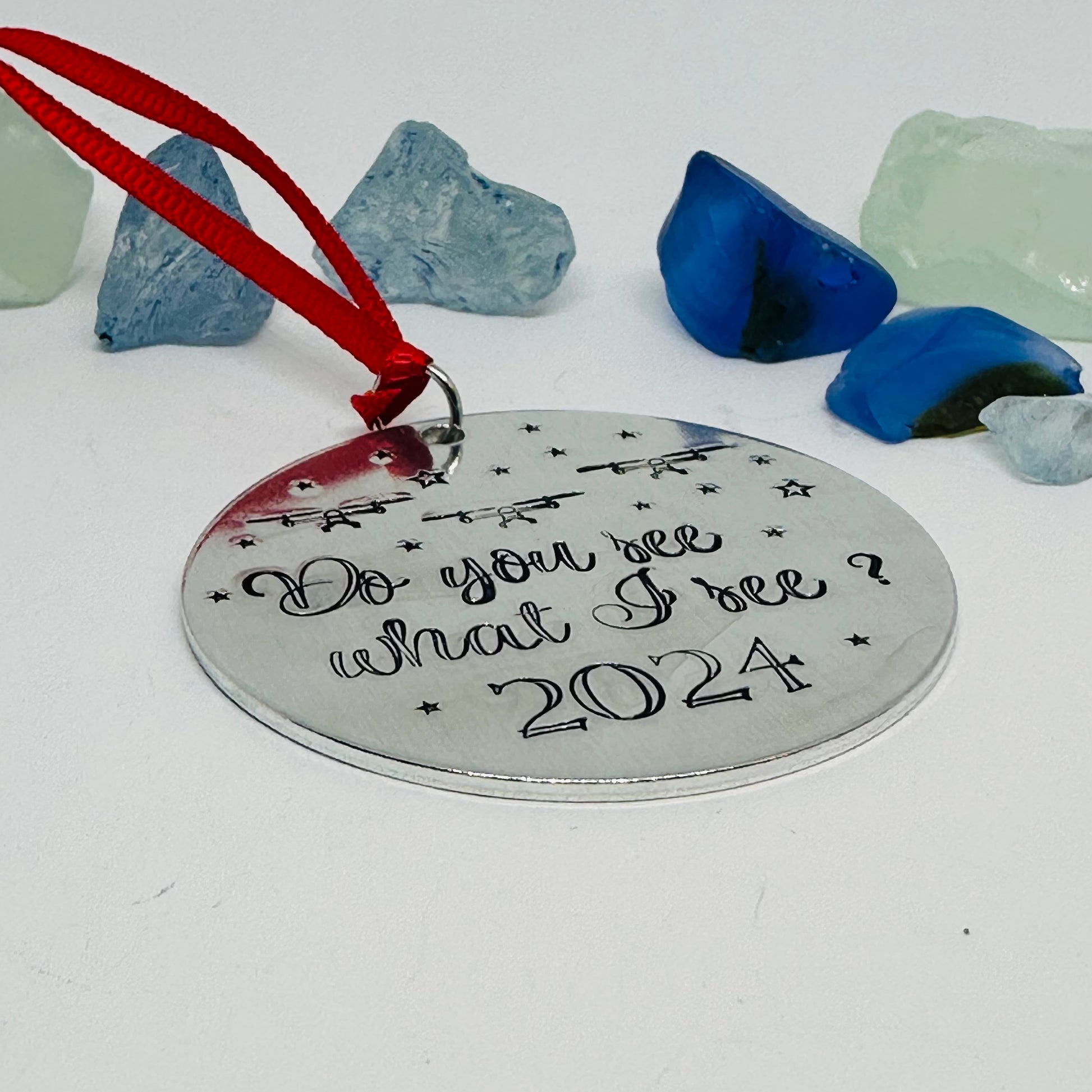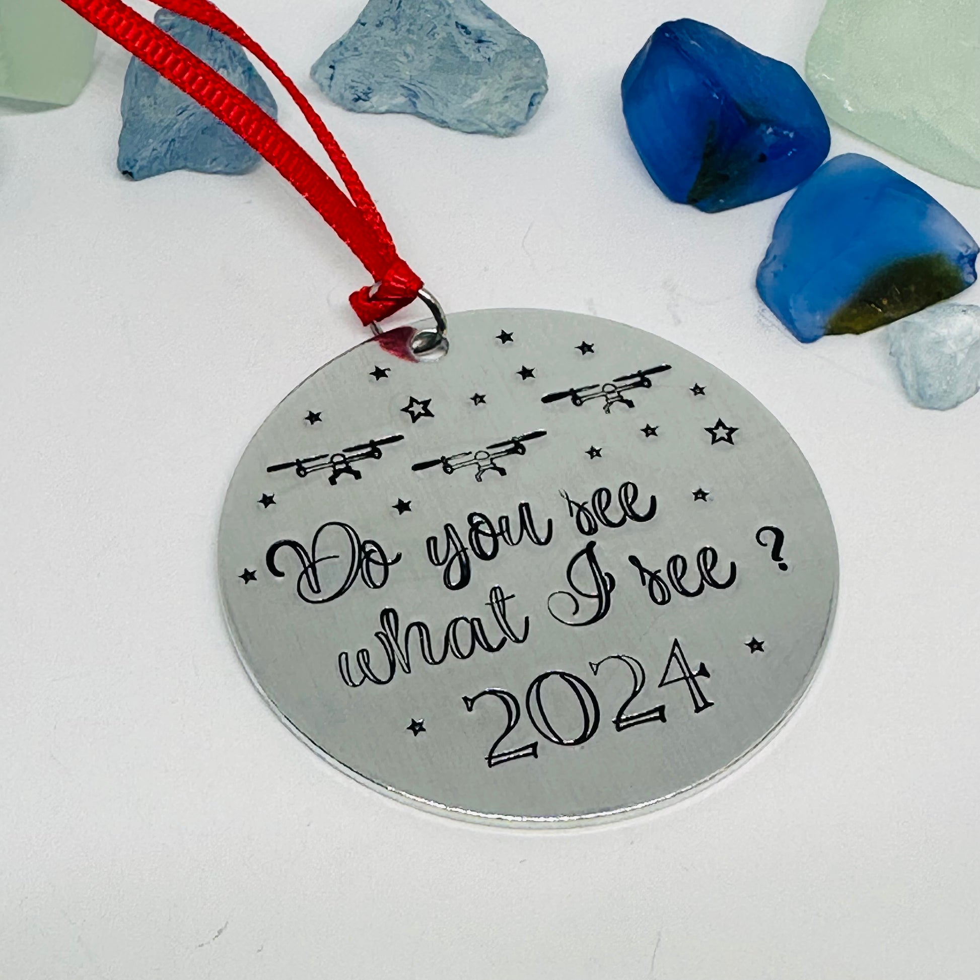 This 2” round aluminum ornament features hand stamped year of your choice and “ do you see what they see?” along with drone and star designs!