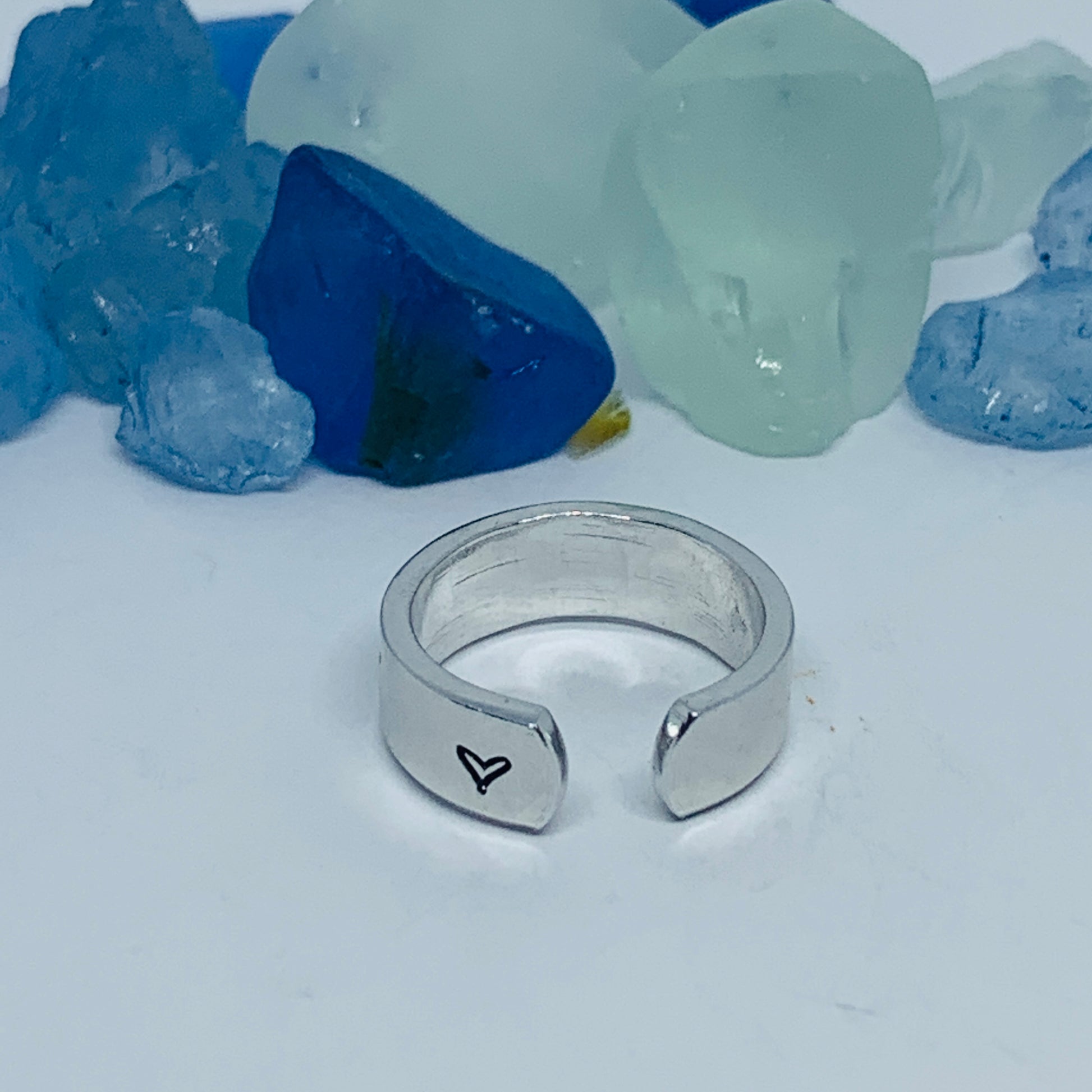This hand-stamped ring has the word ENOUGH! front and center with a small hand drawn heart design on the far end - one outside, one in - upside down - like the lives of those affected by these senseless murders! But haven’t we all been affected?