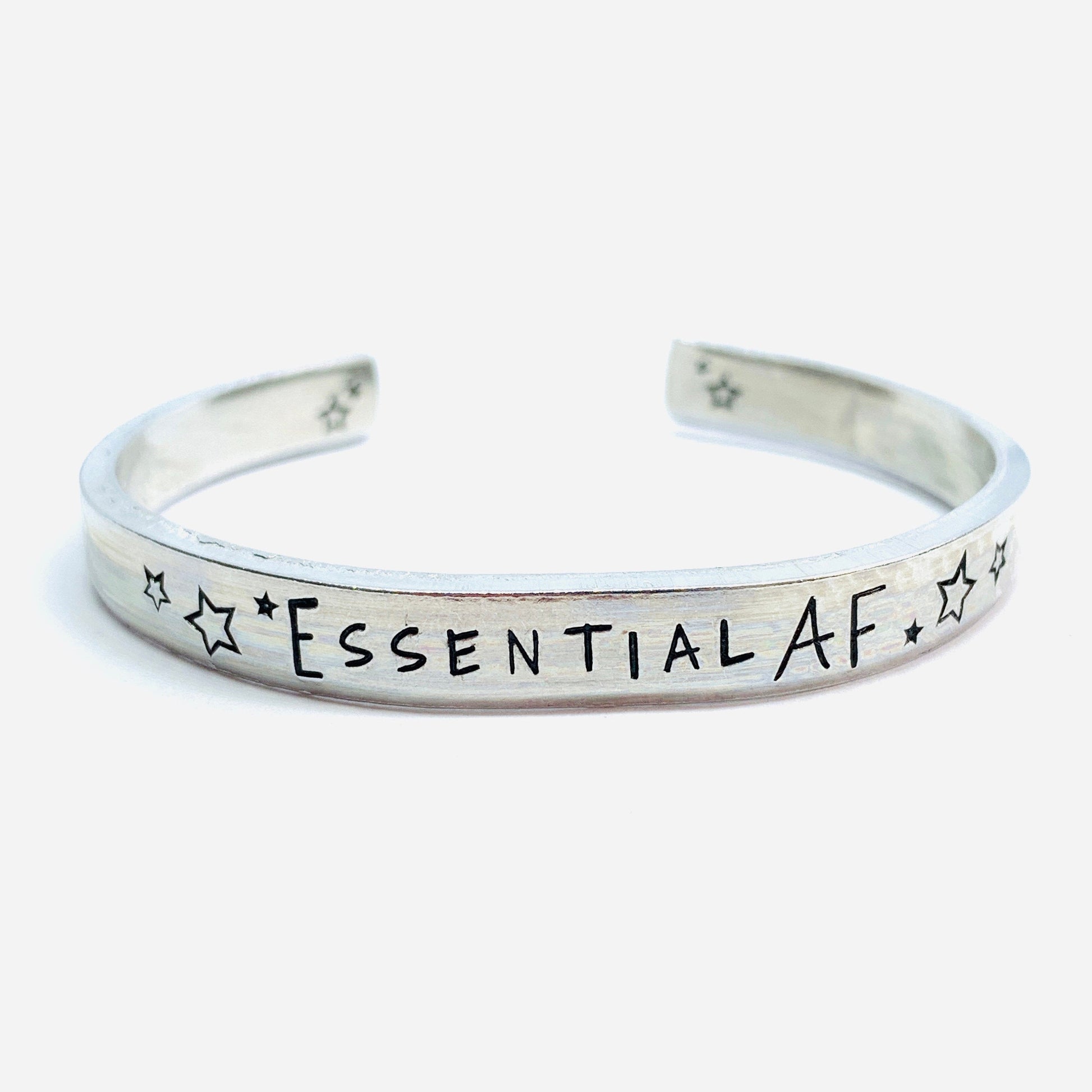 Let's honor our heroes! The essential workers who are risking their lives for us! The word "ESSENTIAL" and heart beat symbols adorn this hand stamped cuff bracelet.