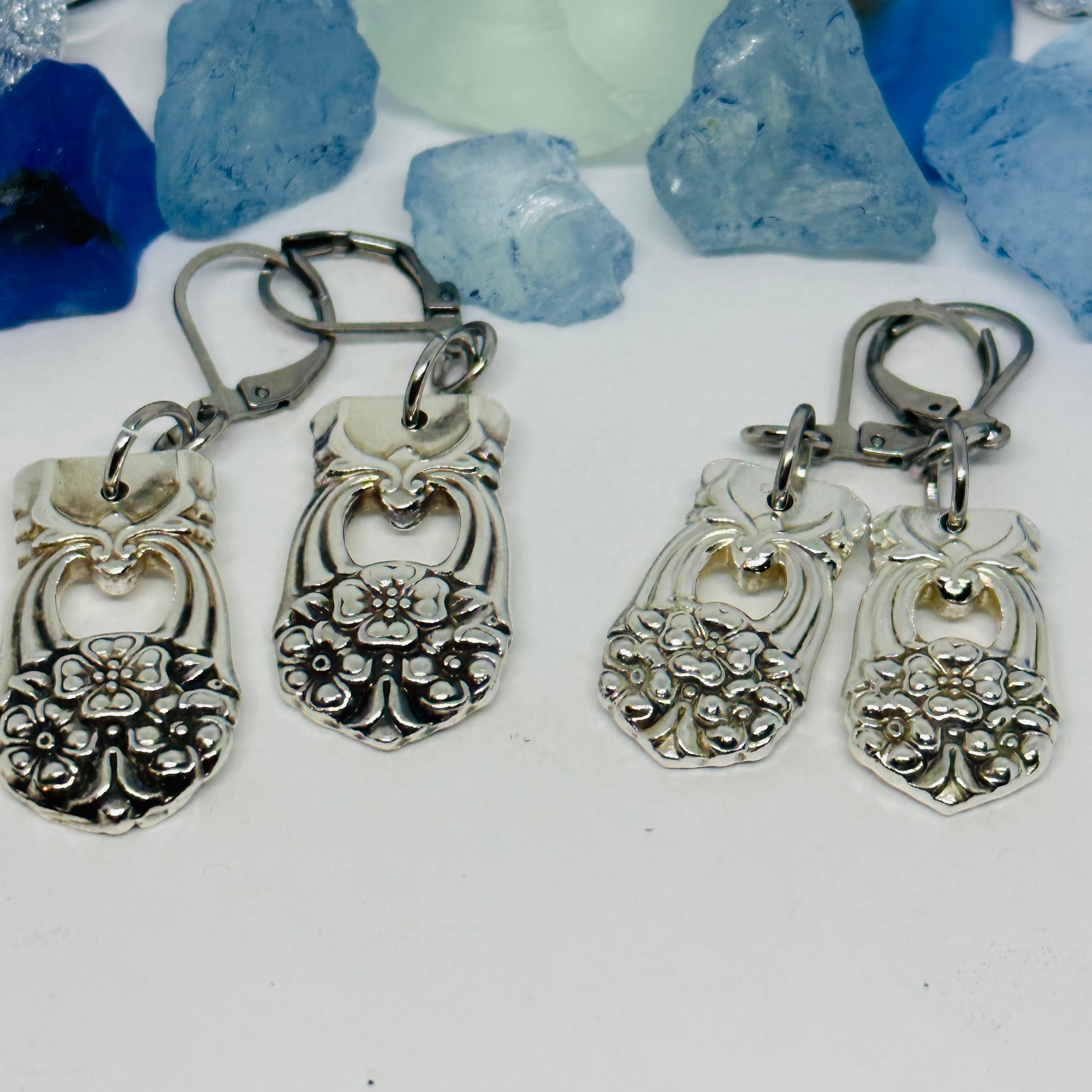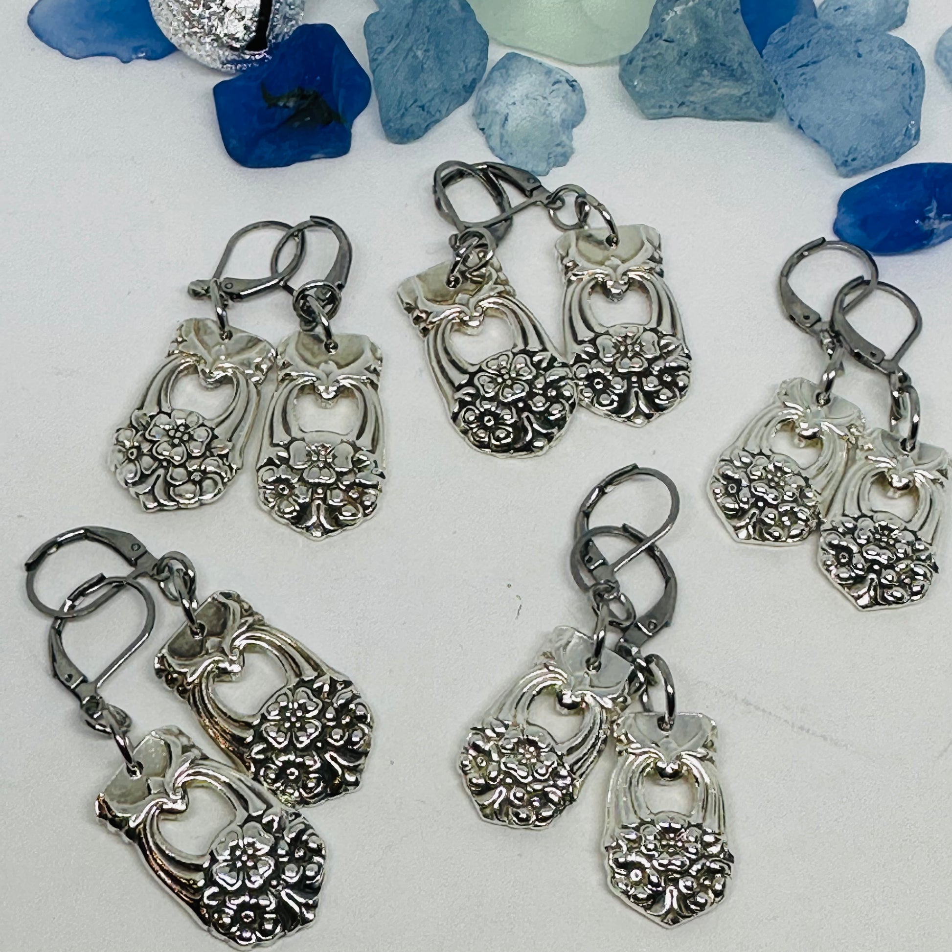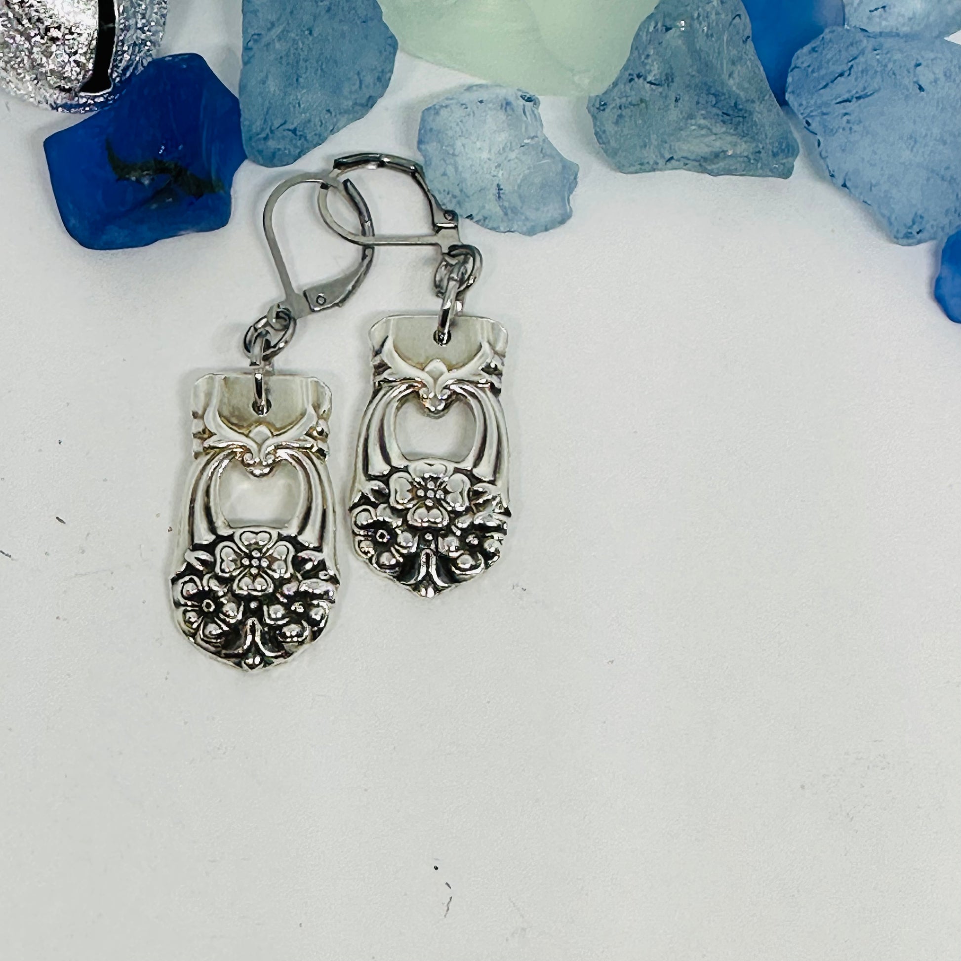 Earrings created by hand by me from two vintage silver plated spoons (with hypoallergenic lever backs) known as “Eternally Yours” introduced in 1941 by International Silver.
