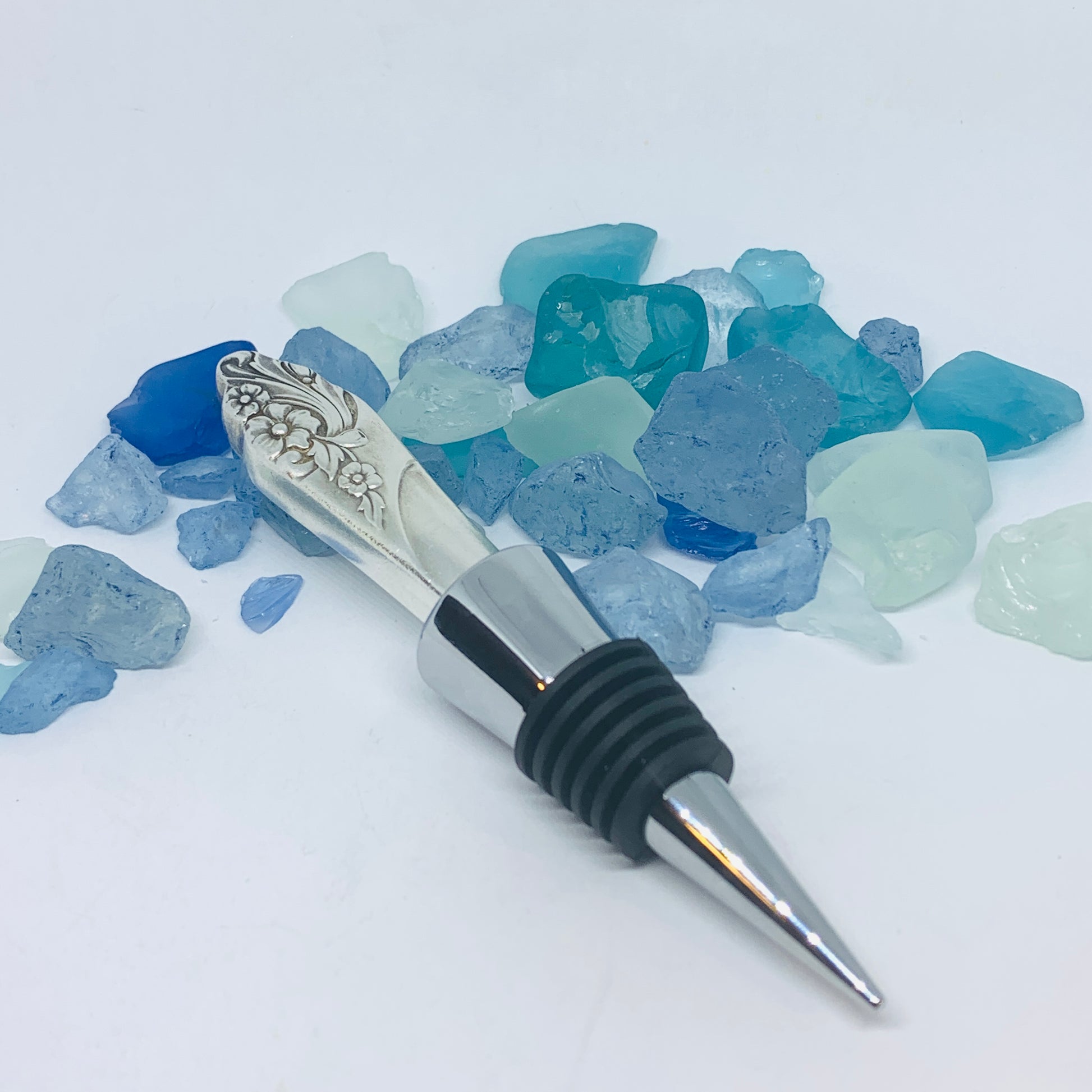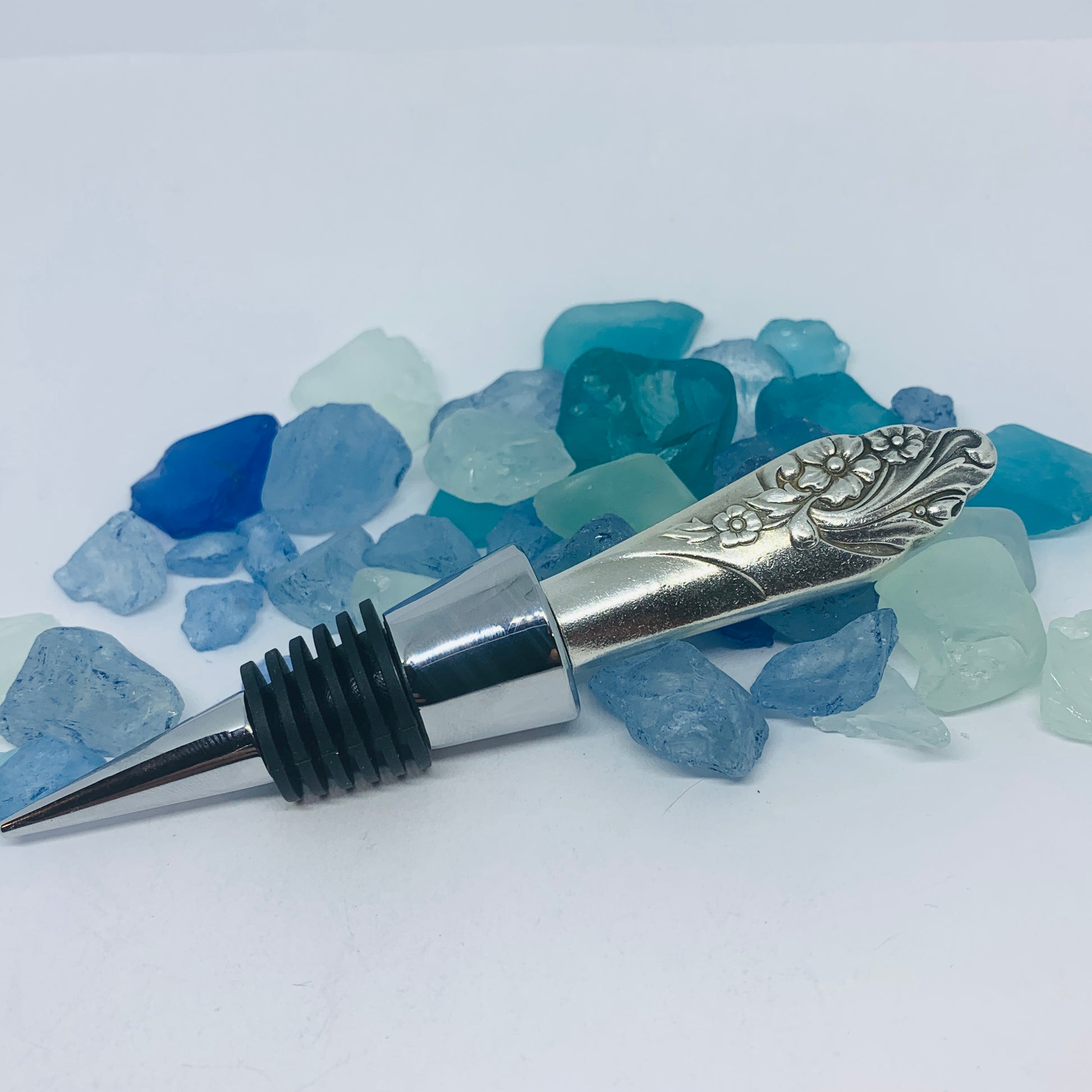 This wine bottle stopper was created by hand by me from a vintage silver plated knife handle known as “Evening Star”.