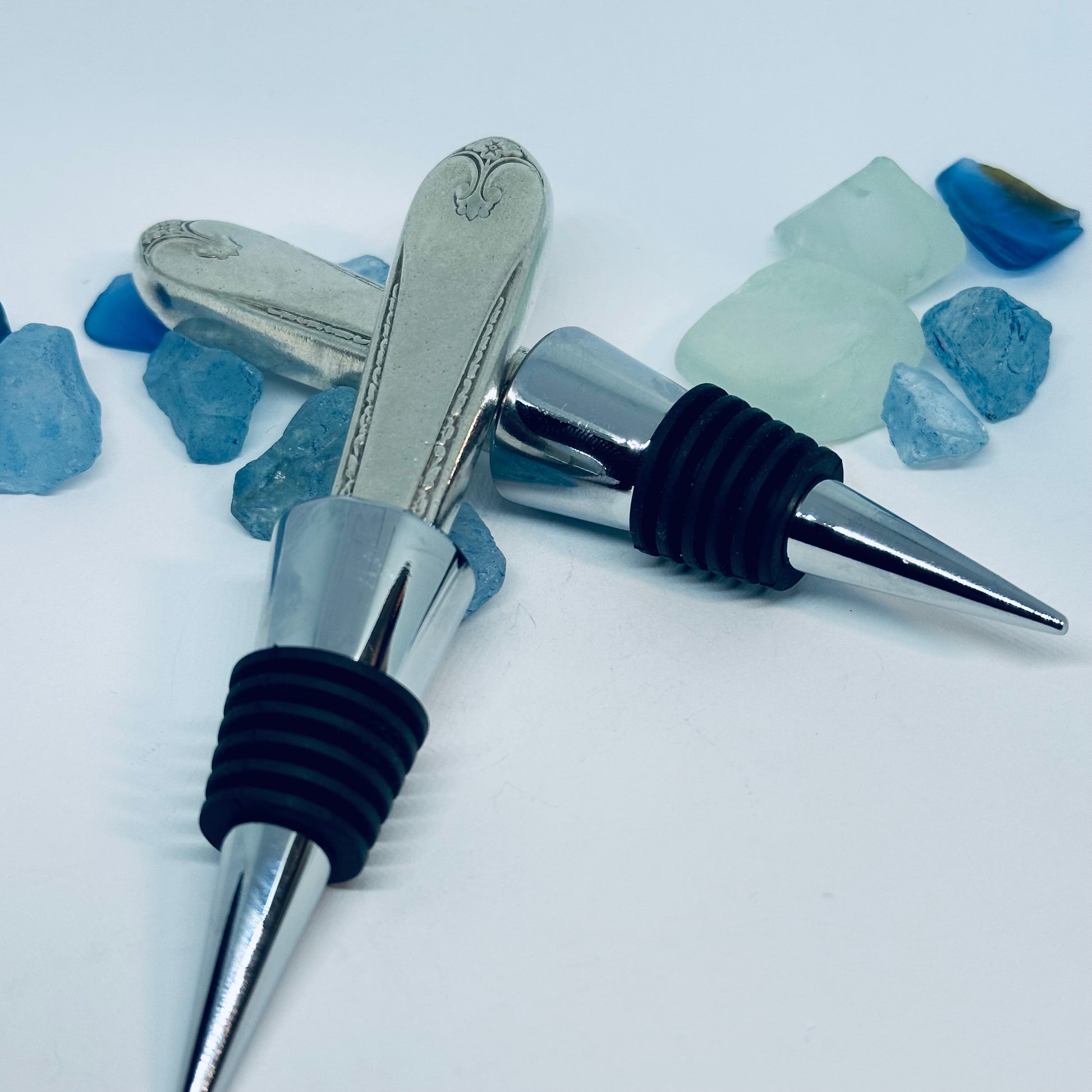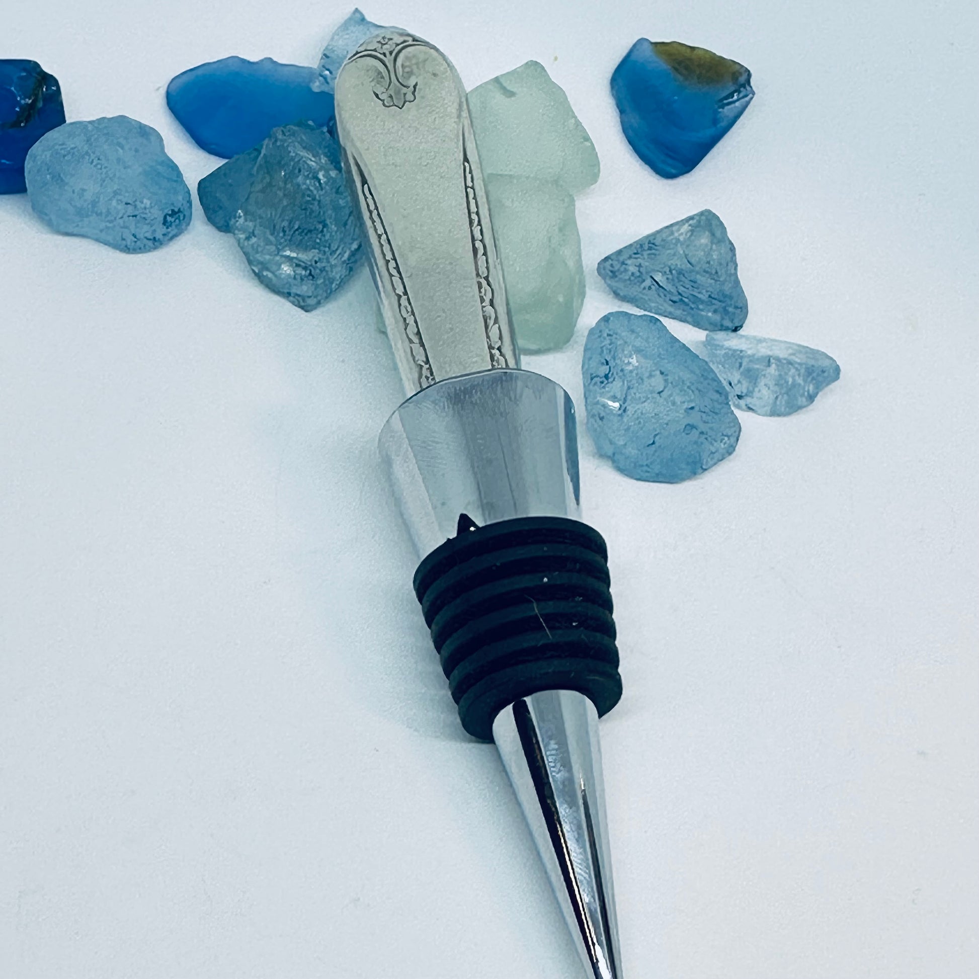 This wine bottle stopper was created by hand by me from a vintage silver plated knife handle known as “Exquisite”.