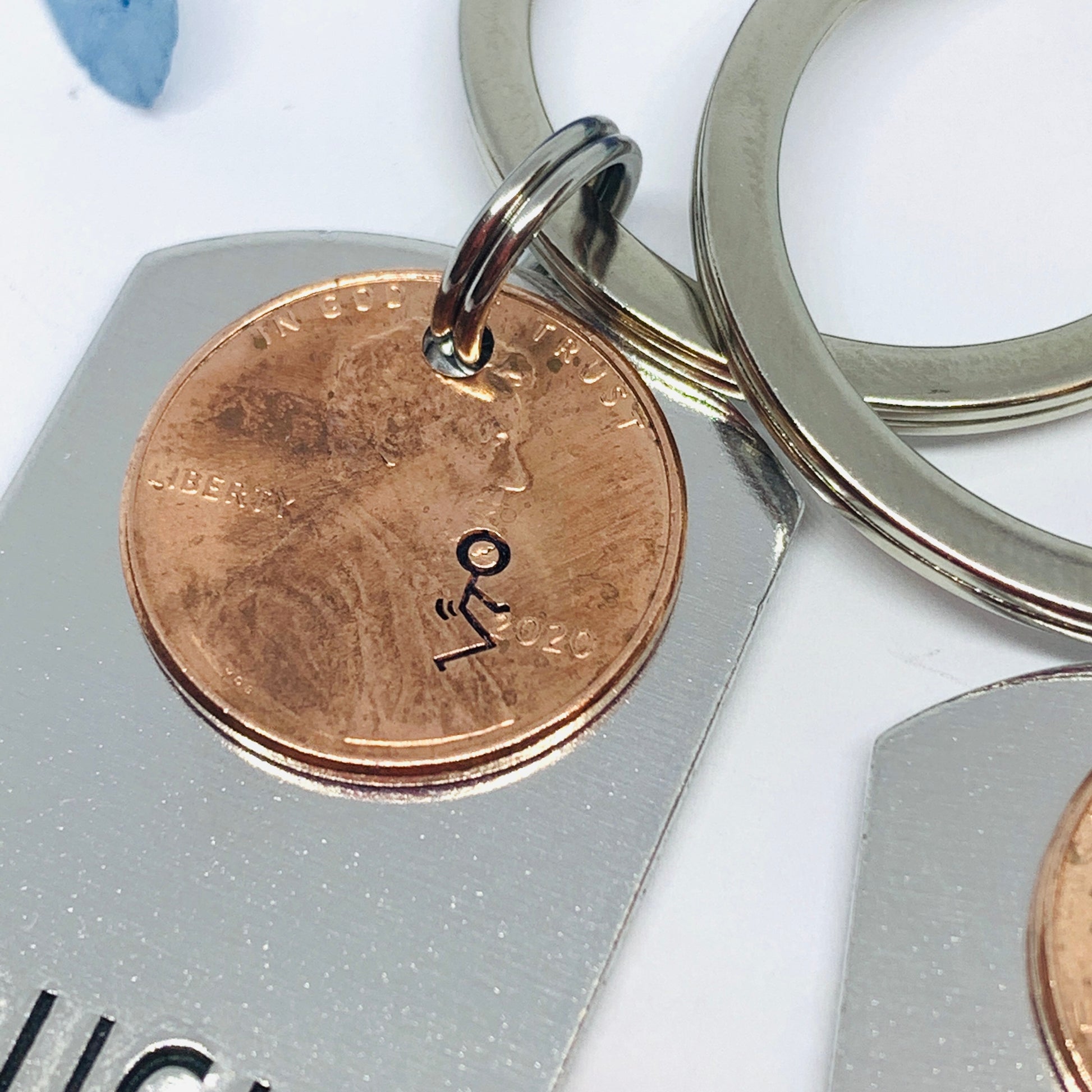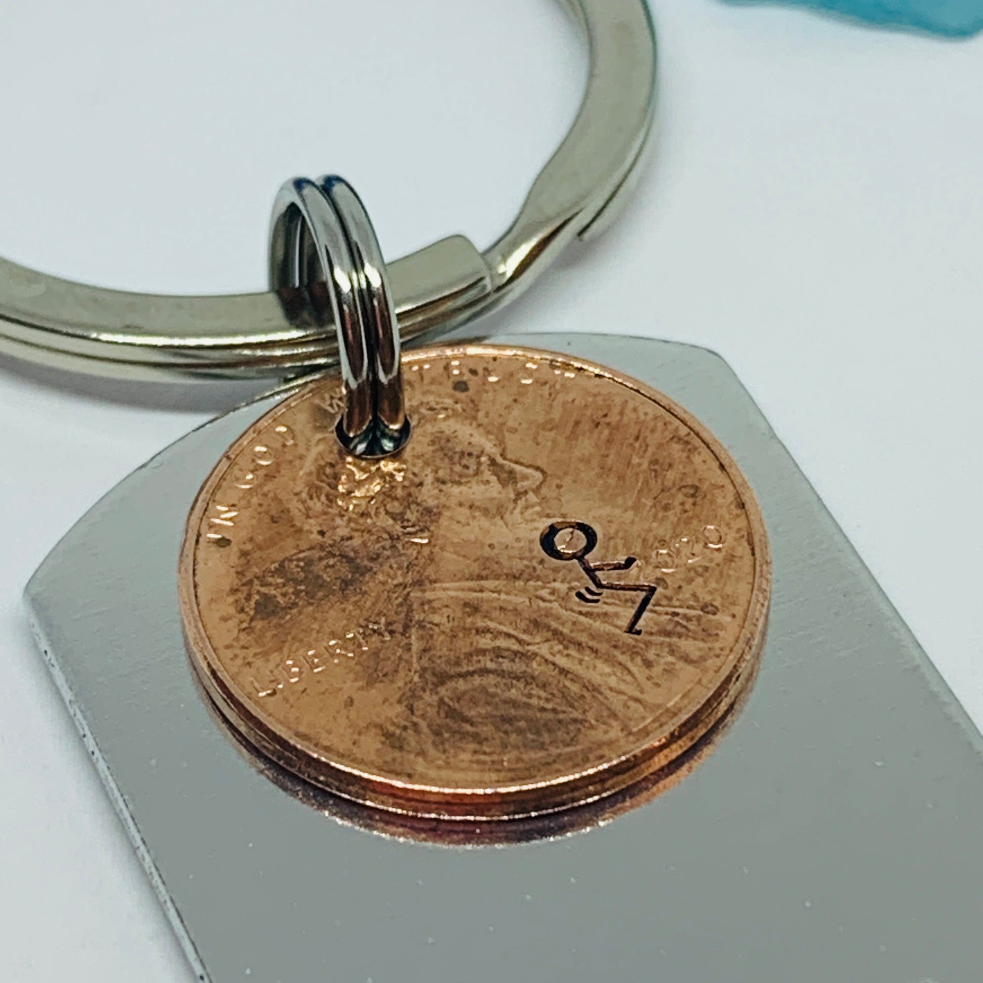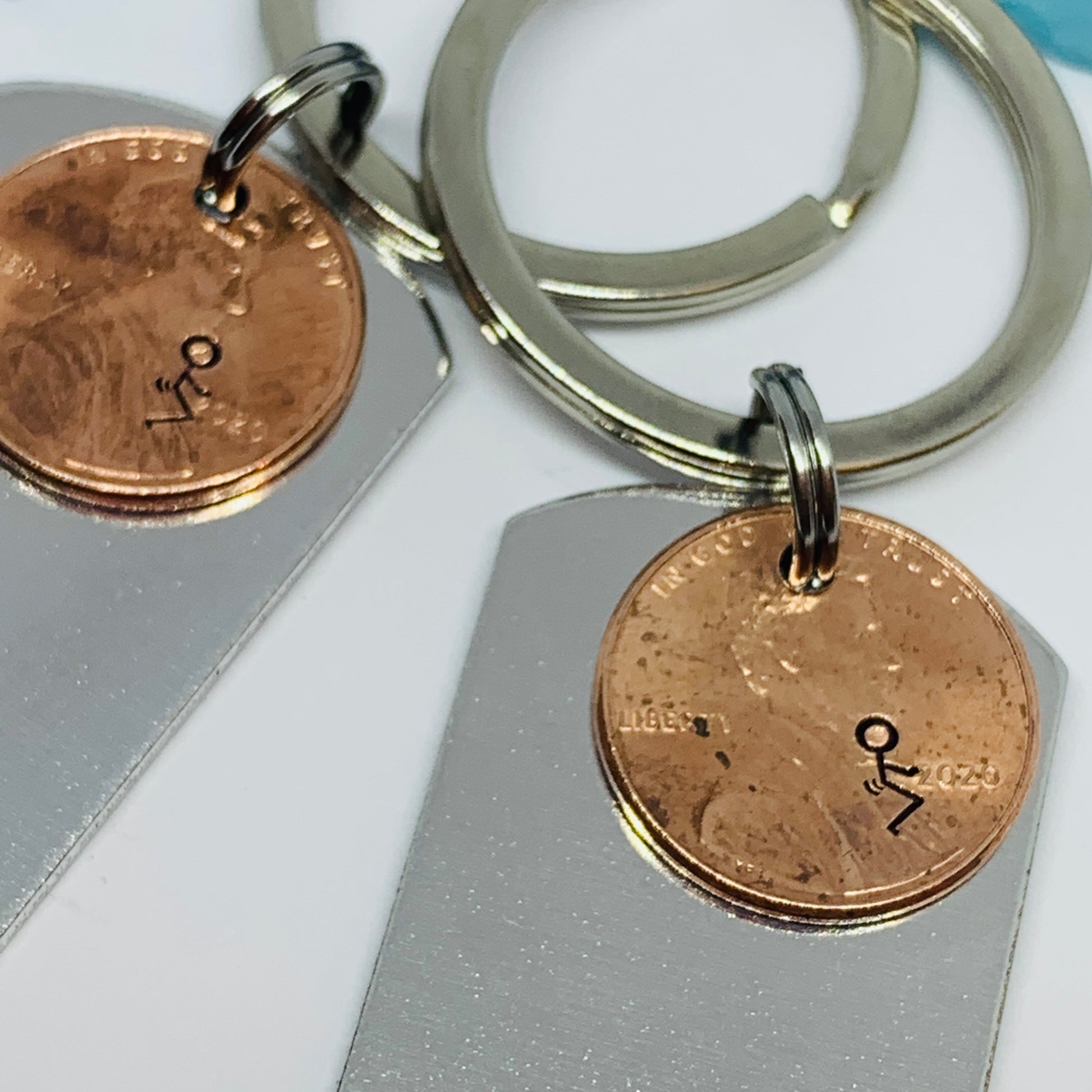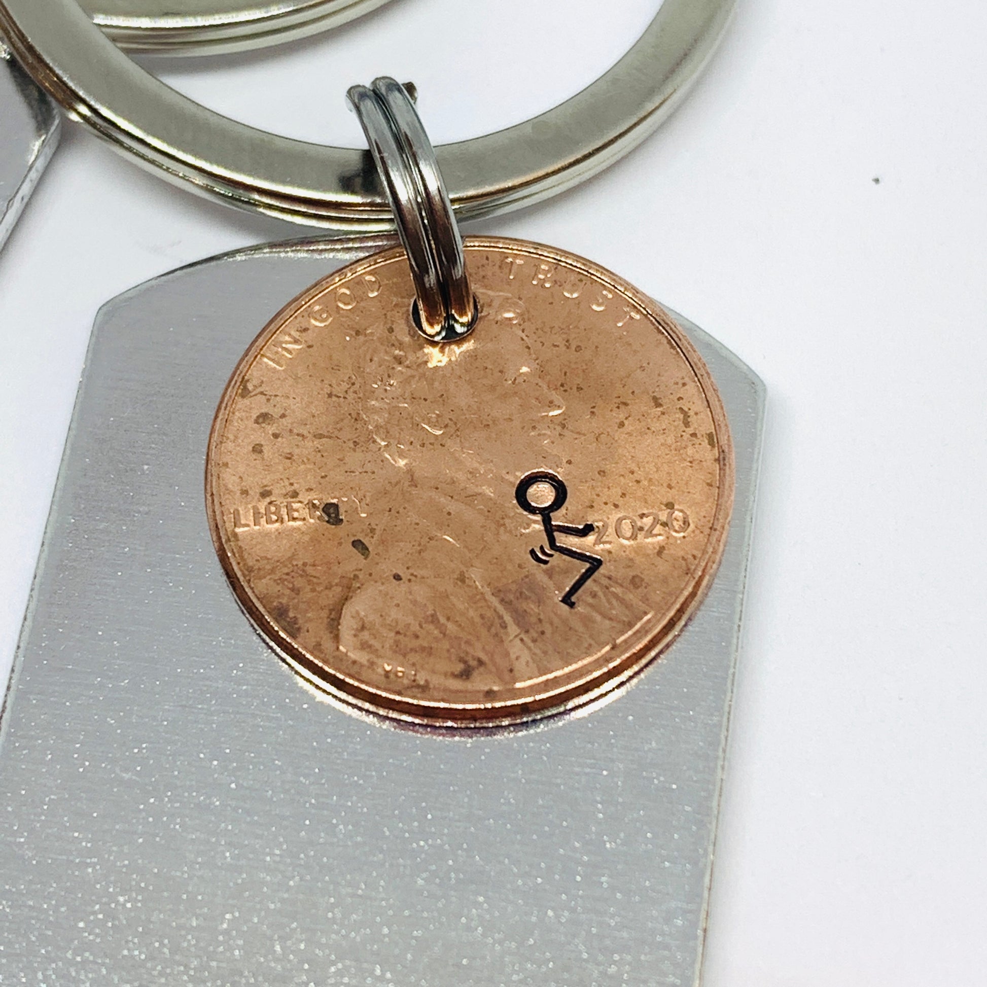 Materials: 12 gauge 1" x 2" aluminum dog tag and stainless steel key ring include a 2020 penny with a little “fuck it guy” humping the 2020!
