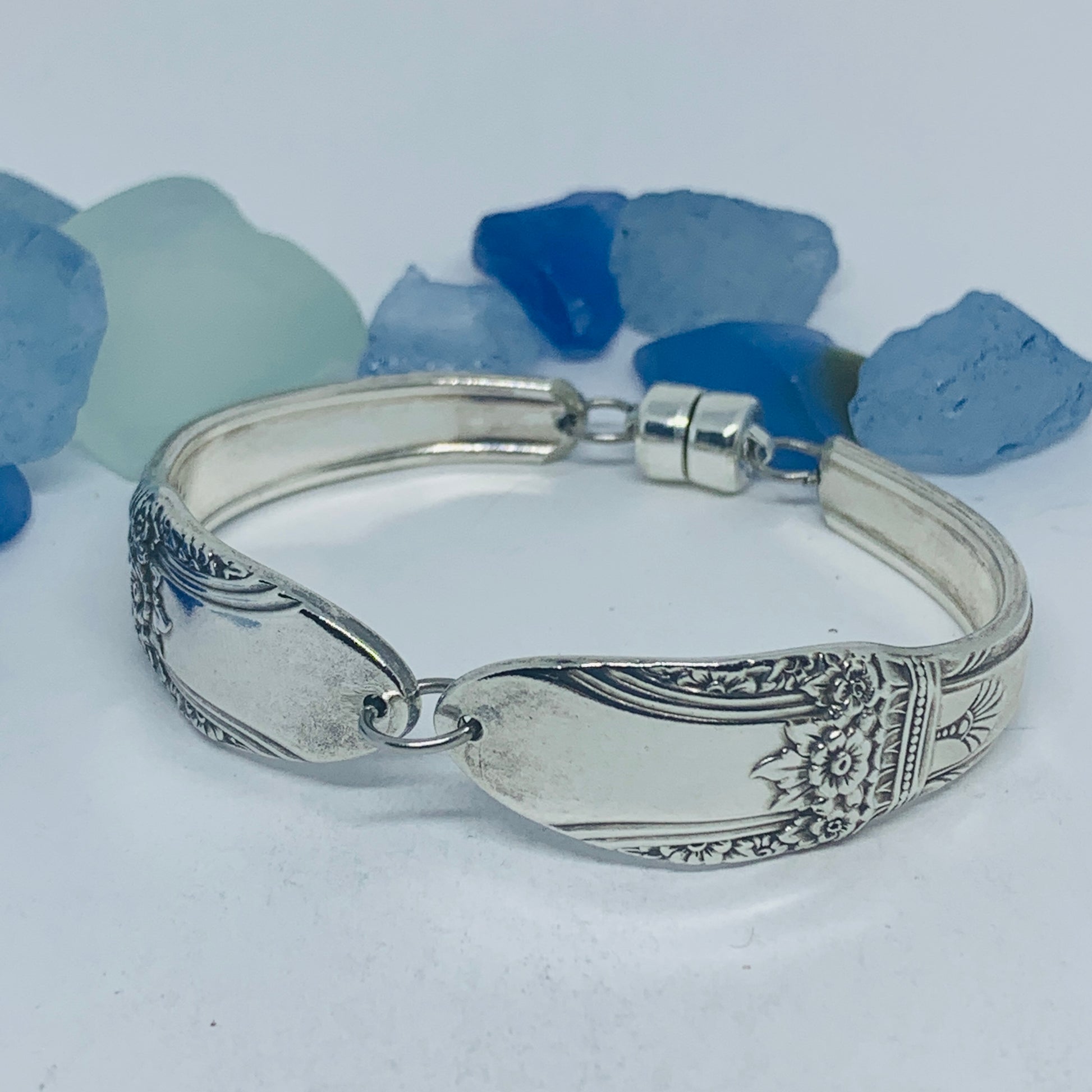 Bracelet created by hand by me from two vintage silver plated spoons whose pattern is known as “First Love” introduced in 1847 Rogers Bros IS, International Silver Company. It was designed in 1937 and discontinued in 1973. This is a very classic look that will bring out the best in a formal décor. The lines and beads are accented with cascading floral blossoms. The pattern is always on the list of top 25 popular flatware patterns.