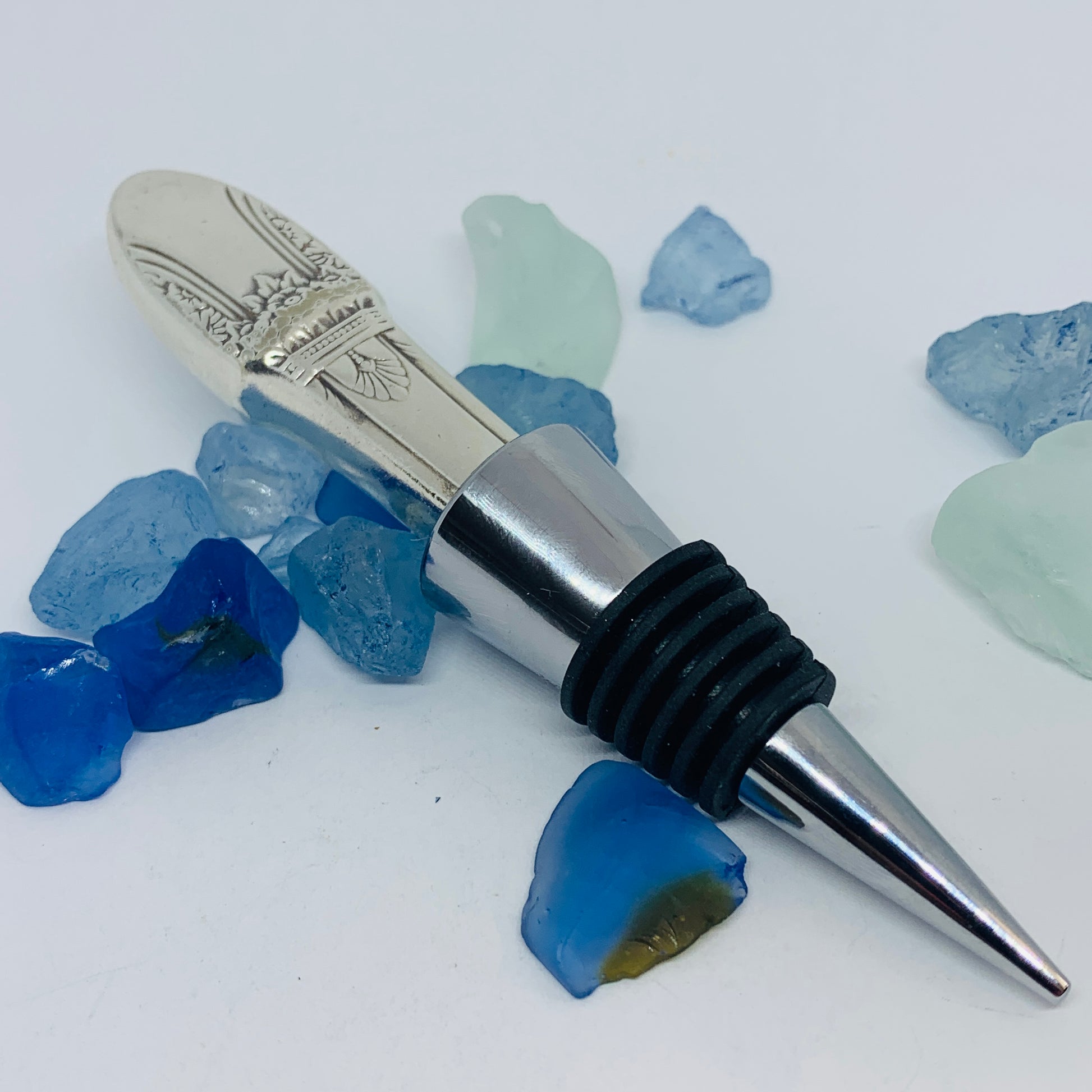 This bottle stopper was created by hand by me from a vintage silver plated knife handle known as "First Love”.