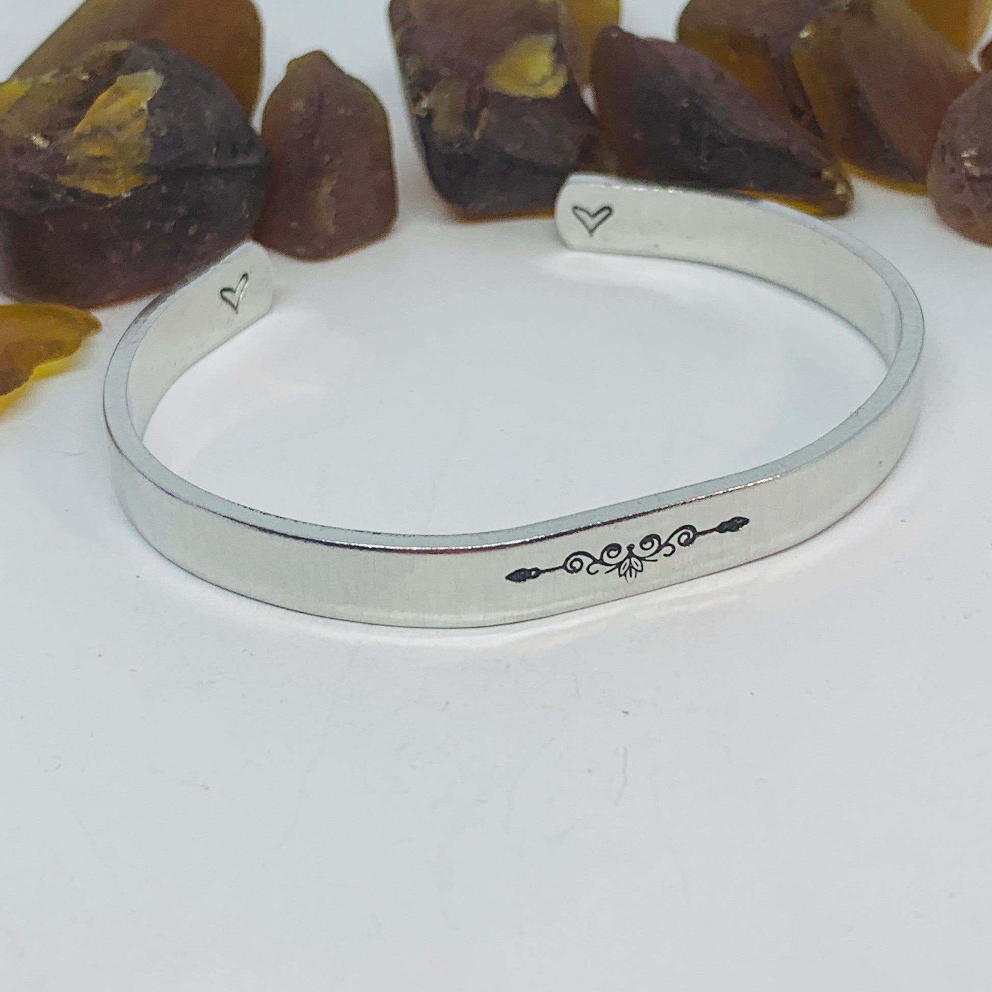 The words “Fuck This Shit” adorn this hand stamped cuff bracelet on the inside, away from view (but YOU know it’s there) with a beautiful scroll design centered on the outside! It’s a favorite of teachers and nurses for some reason!