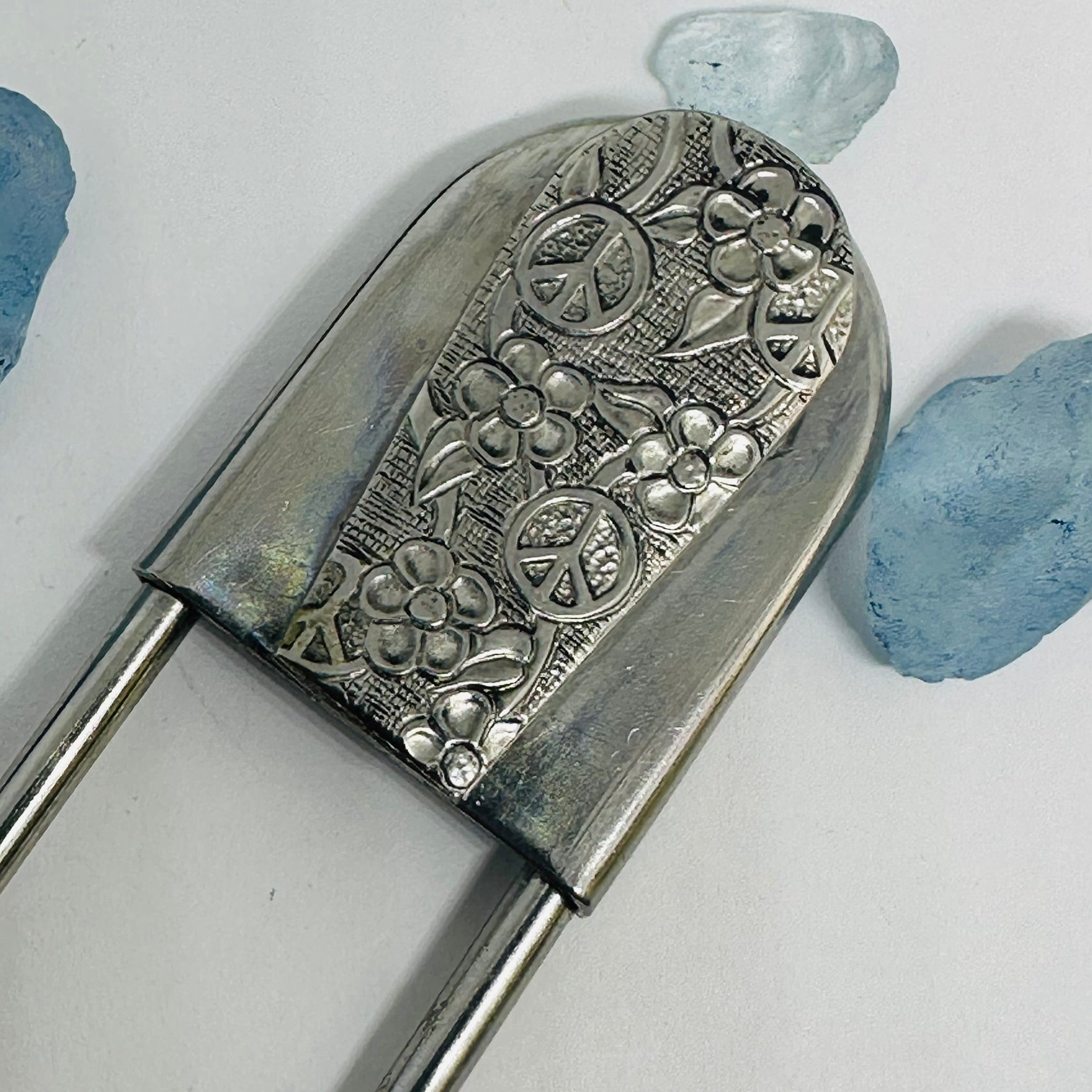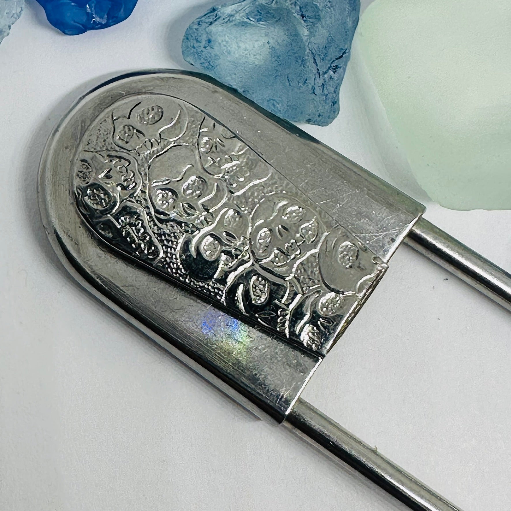 Giant safety pin key fobs/kilt brooches/horse blanket pins. These are great for that person who is always losing their keys ... hook them to purse handles so you aren't searching for keys at the bottom of your bag, on a gym bag so you never miss keys while you are working out or right on your belt loop for easy access. Each is adorned with a stainless steel calavera (skull) or groovy Woodstock design.