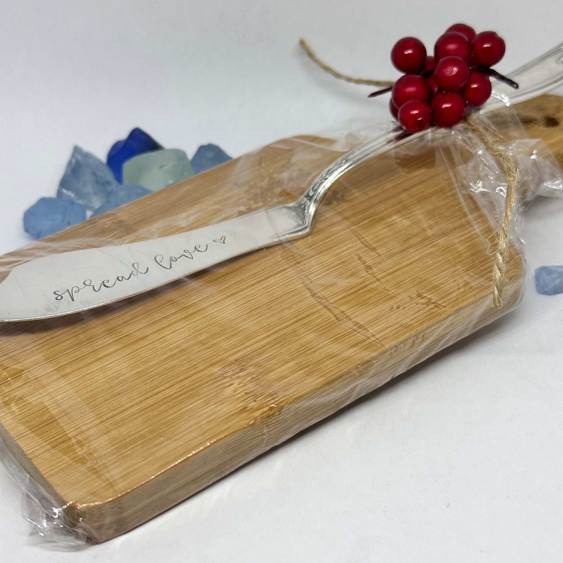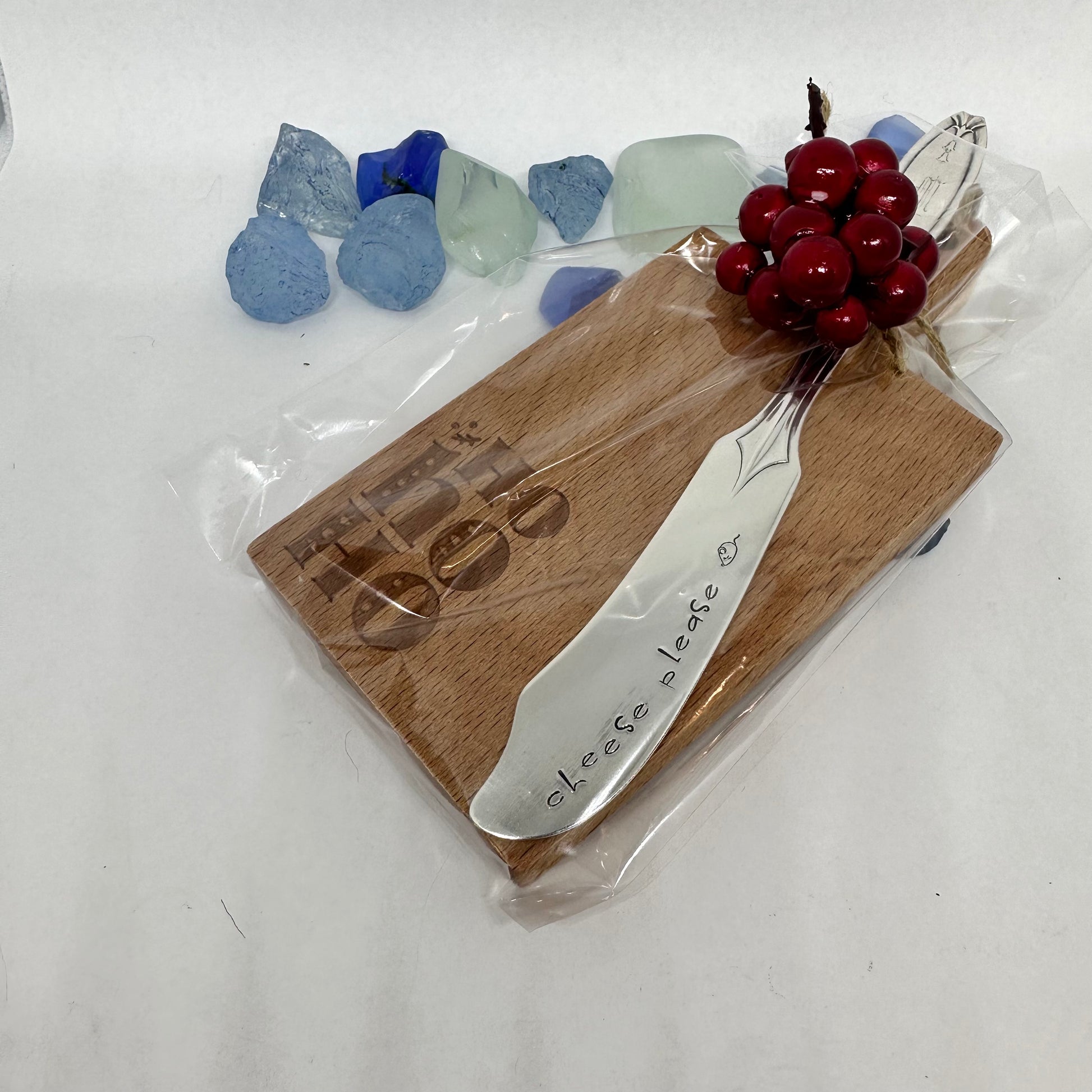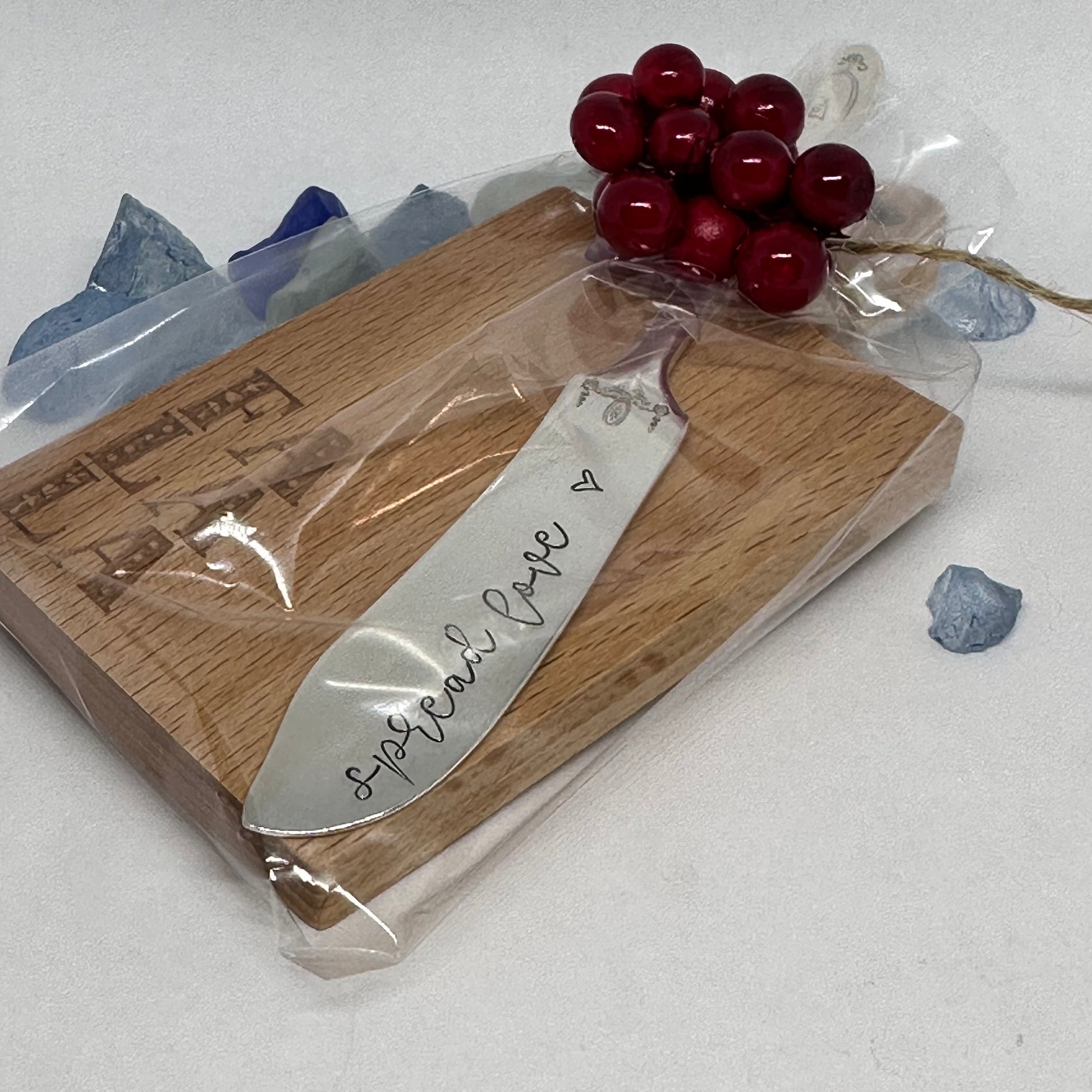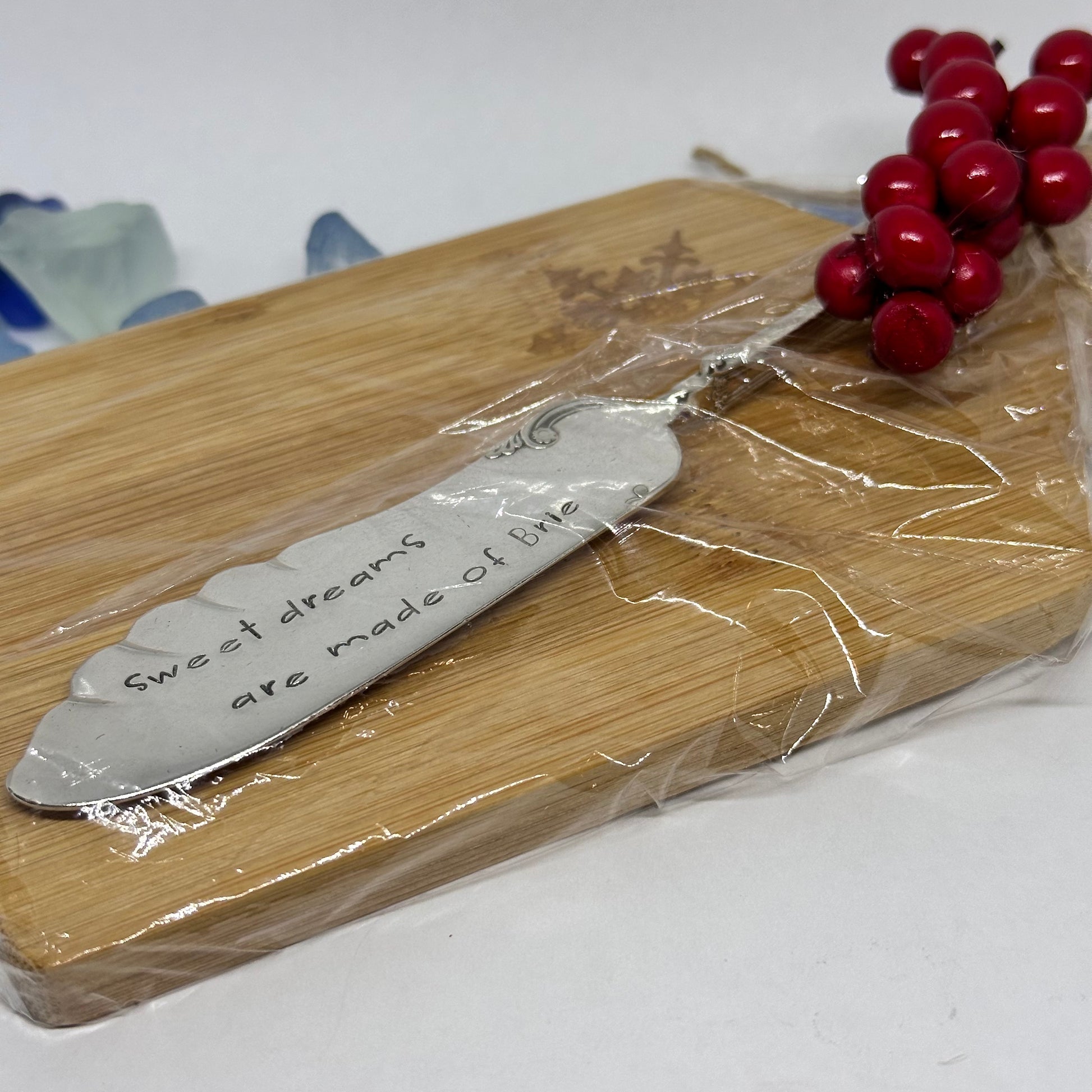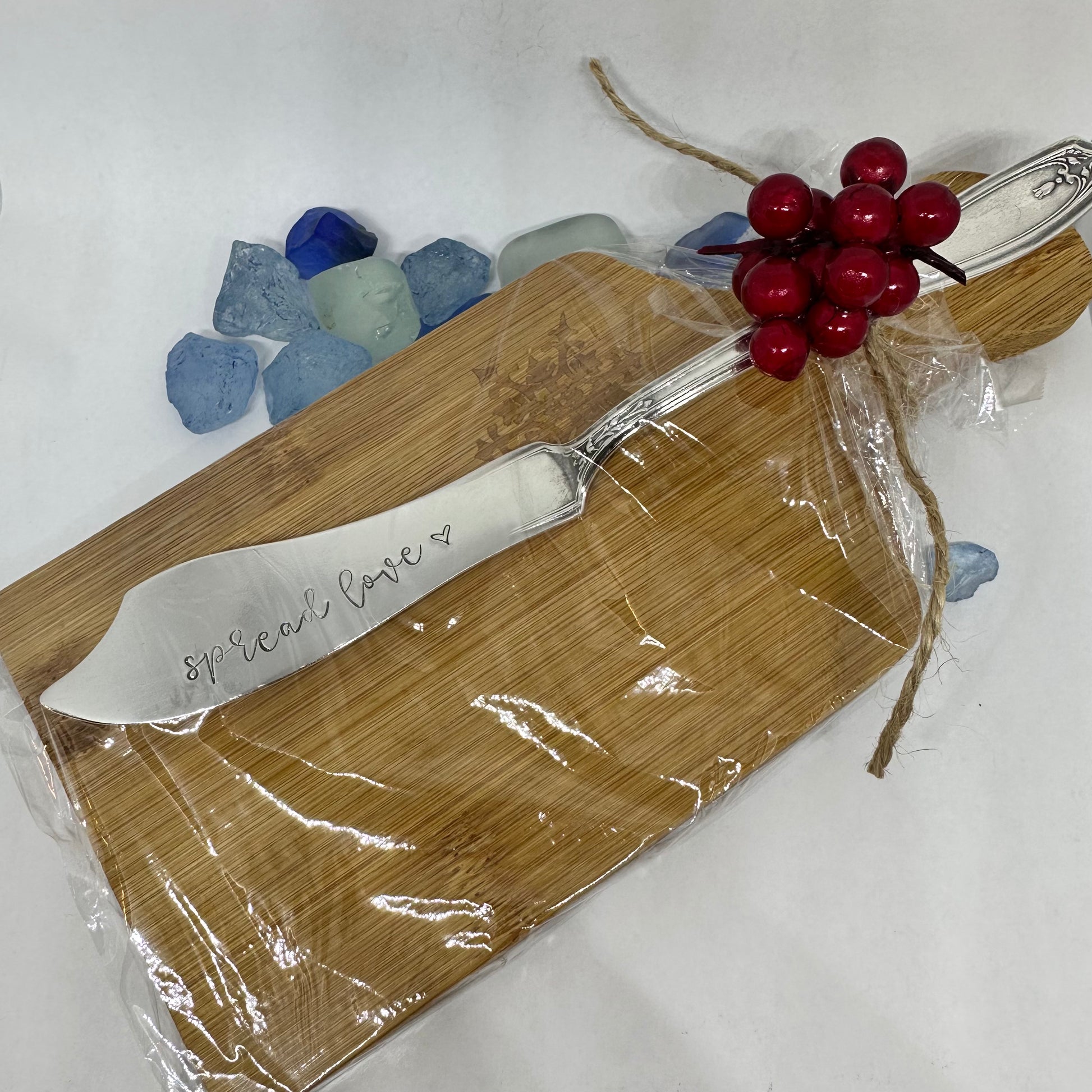 Hand stamped cheese spreaders/butter knives made from vintage silverware (patterns will vary) paired with a food safe decorative board. Both are nicely wrapped together with a festive decoration. Perfect for gift-giving! Think teachers, letter carriers, besties, neighbors, and last minute hostess gifts! Keep a few on hand for “emergency” gift giving!