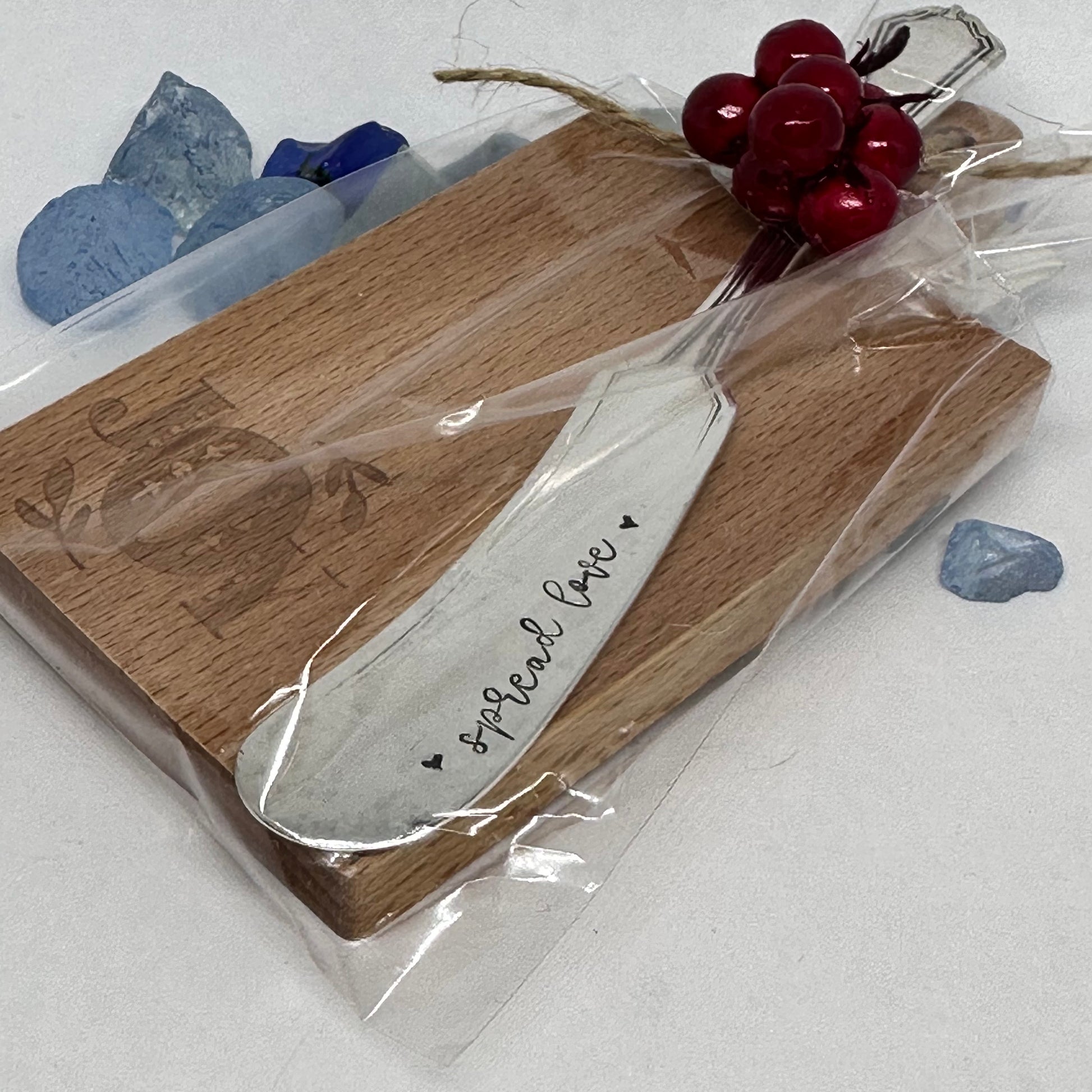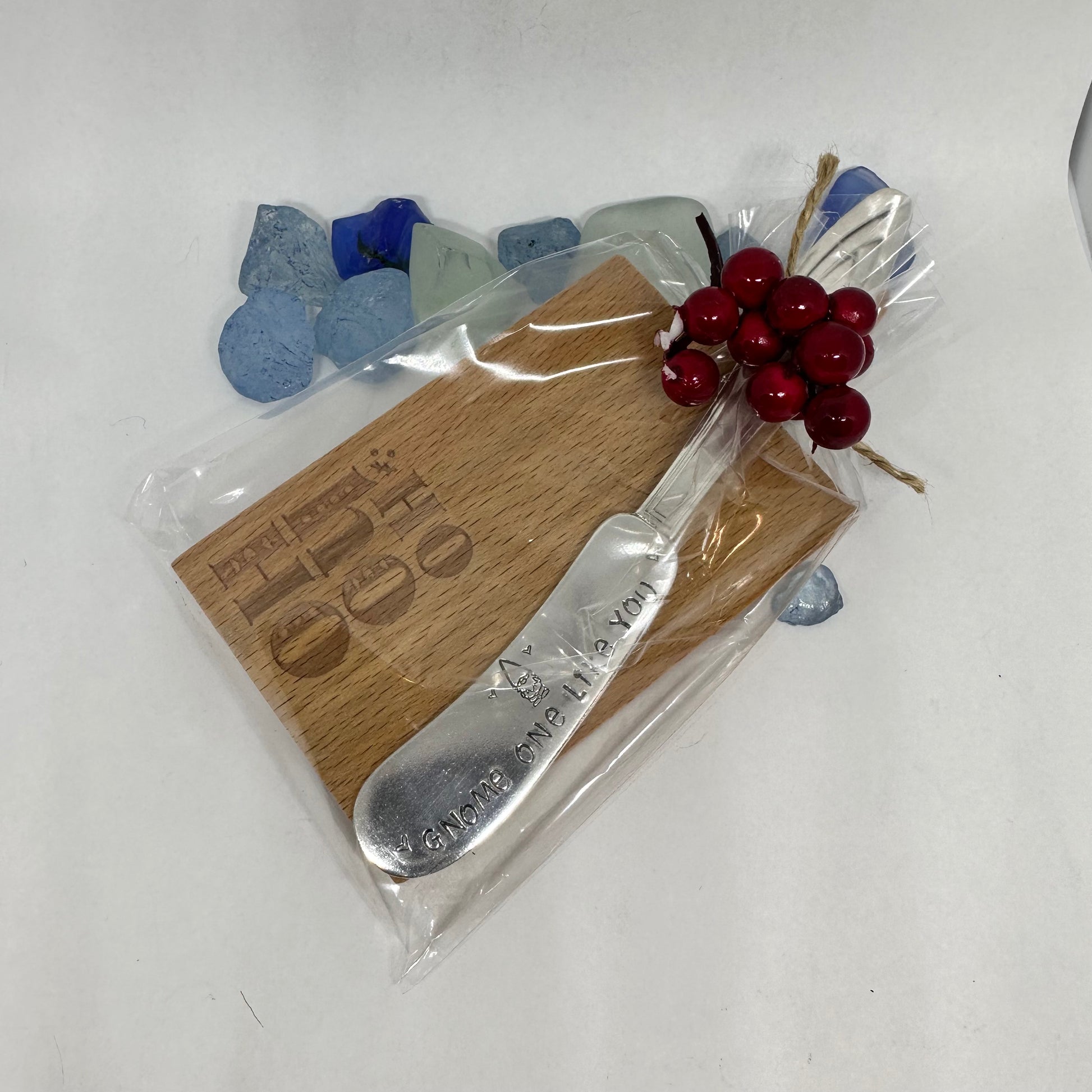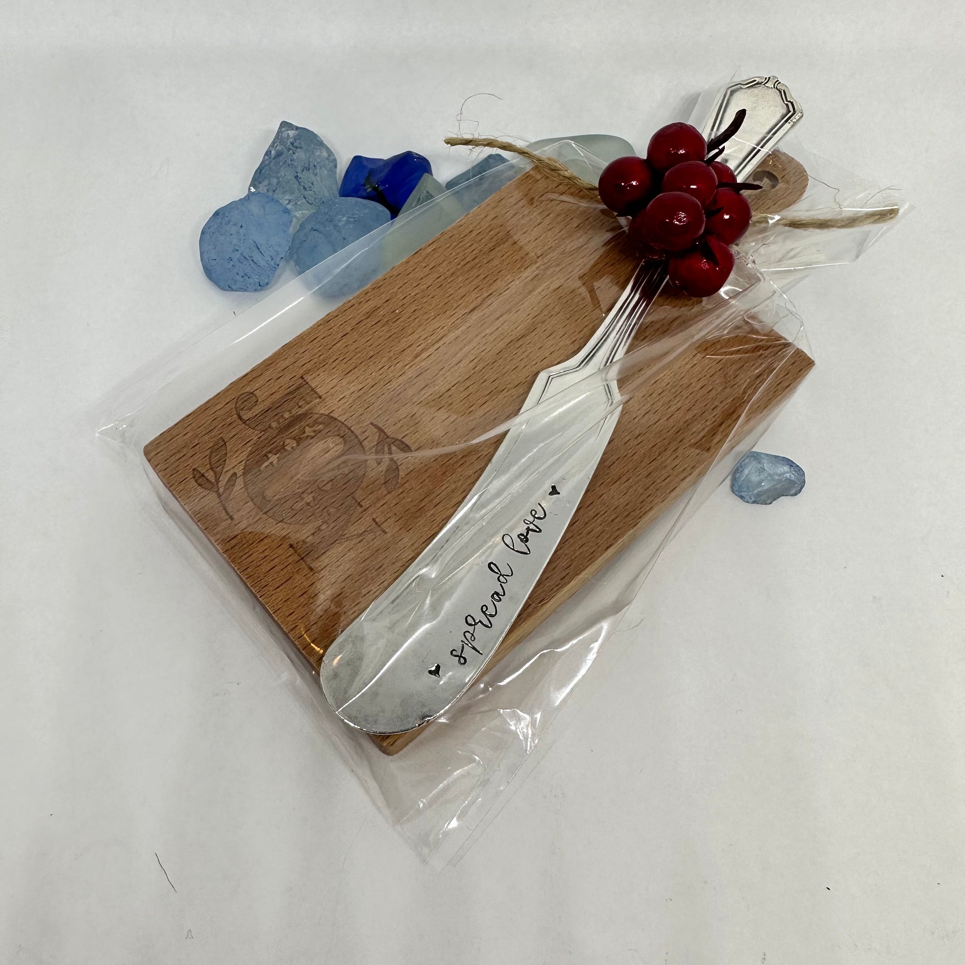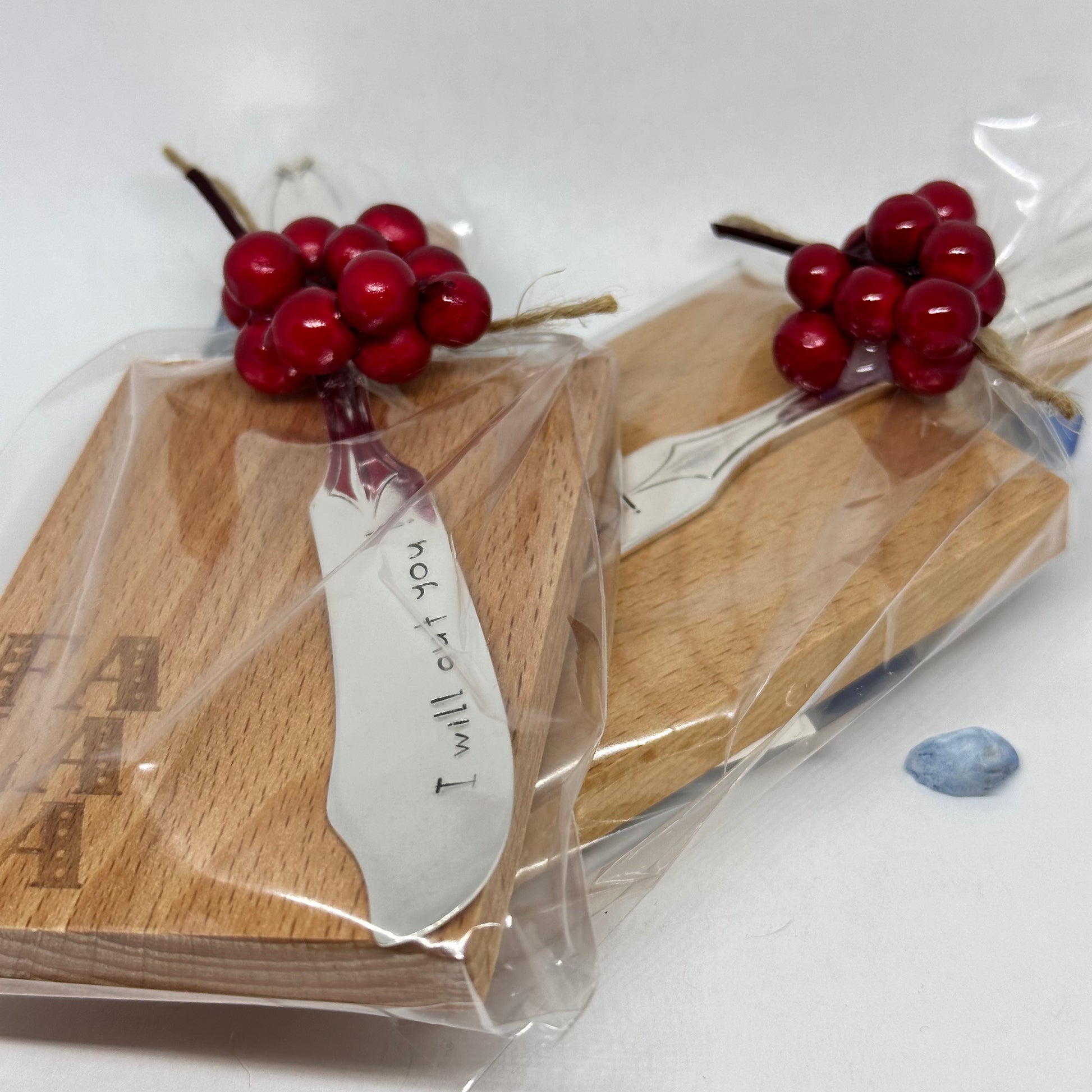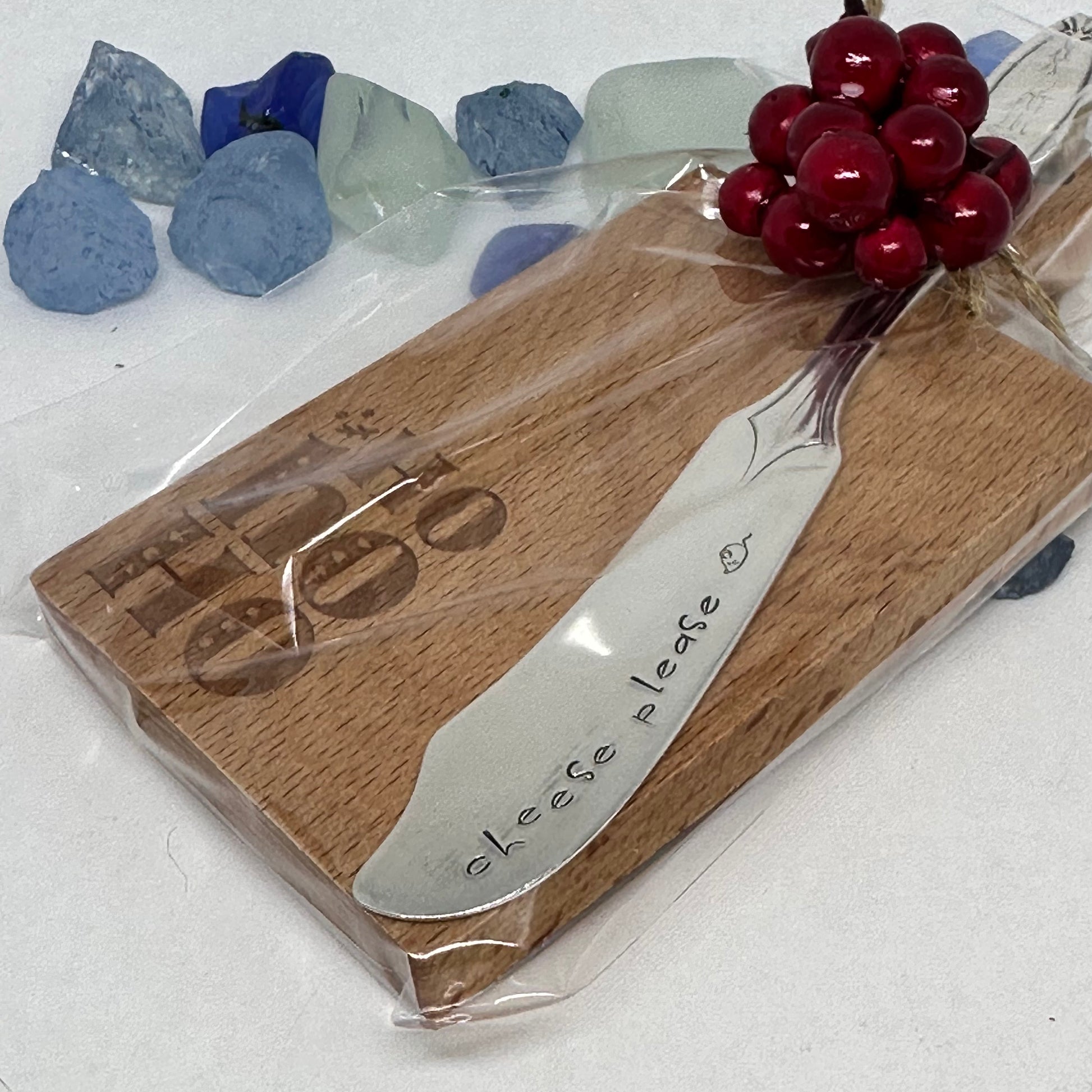 Hand stamped cheese spreaders/butter knives made from vintage silverware (patterns will vary) paired with a food safe decorative board. Both are nicely wrapped together with a festive decoration. Perfect for gift-giving! Think teachers, letter carriers, besties, neighbors, and last minute hostess gifts! Keep a few on hand for “emergency” gift giving!