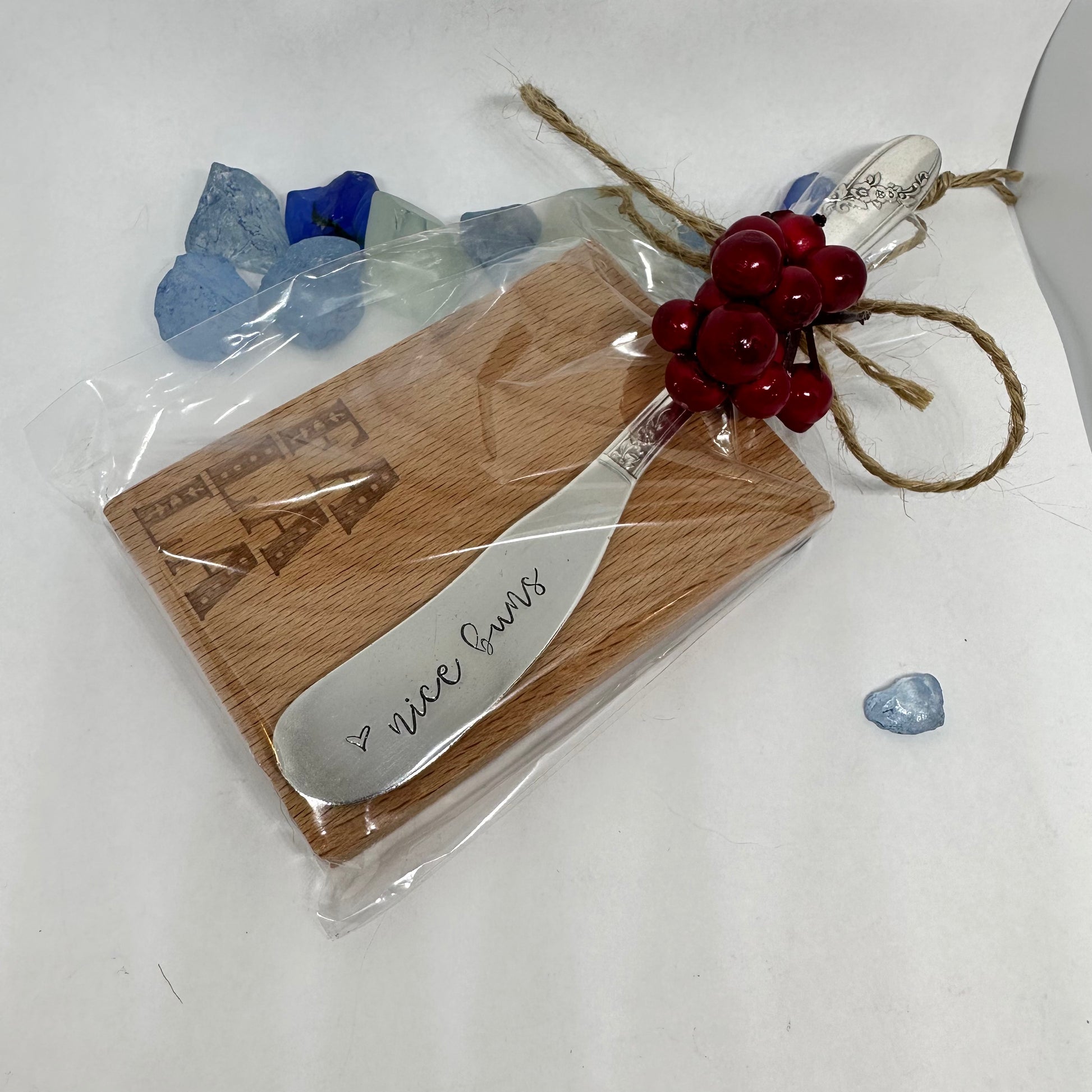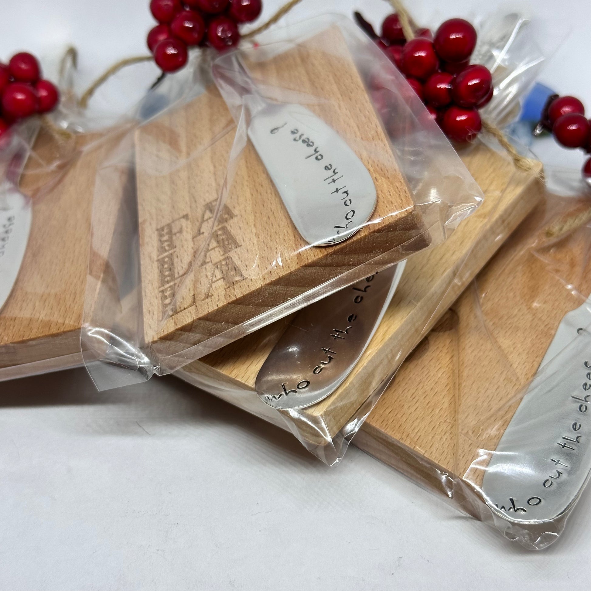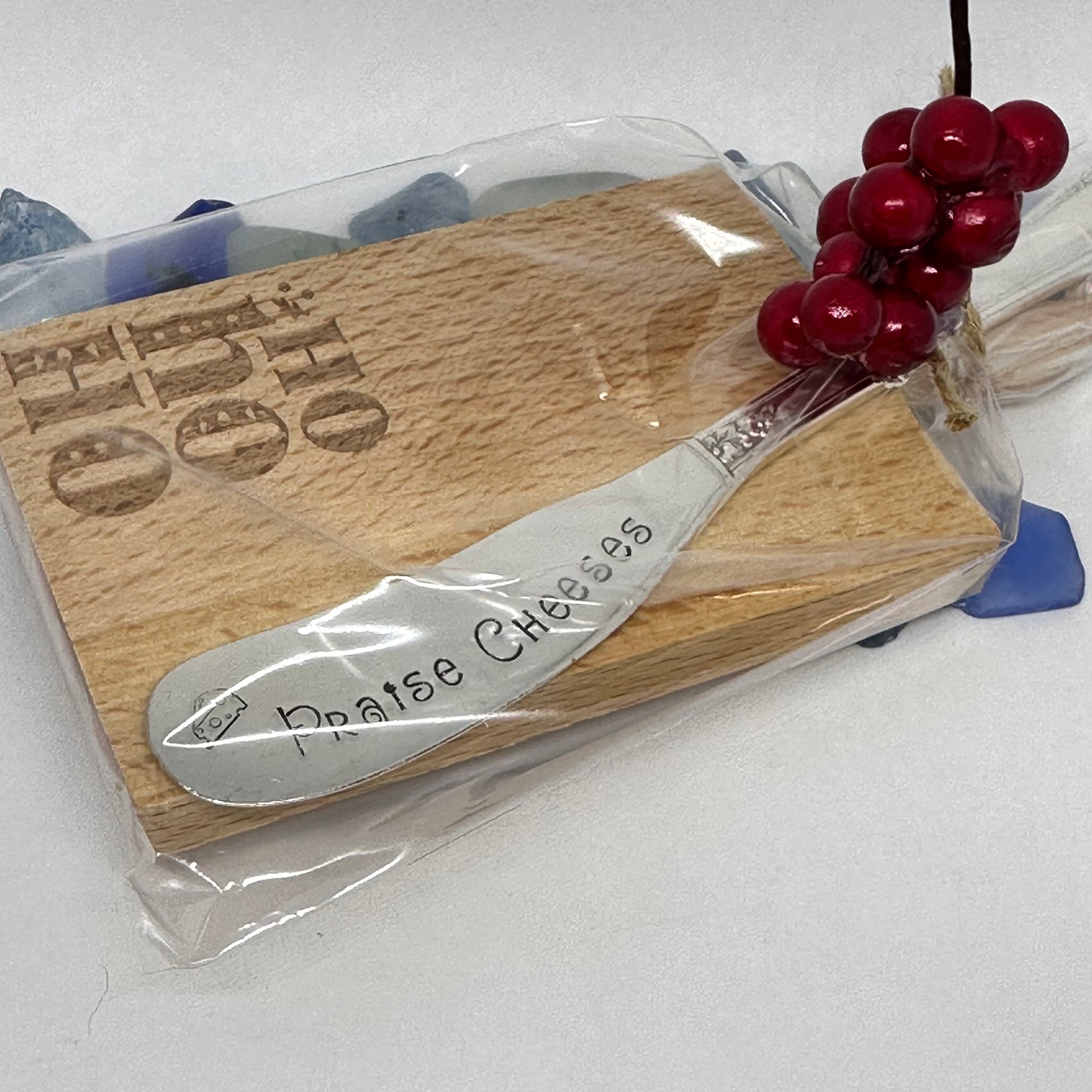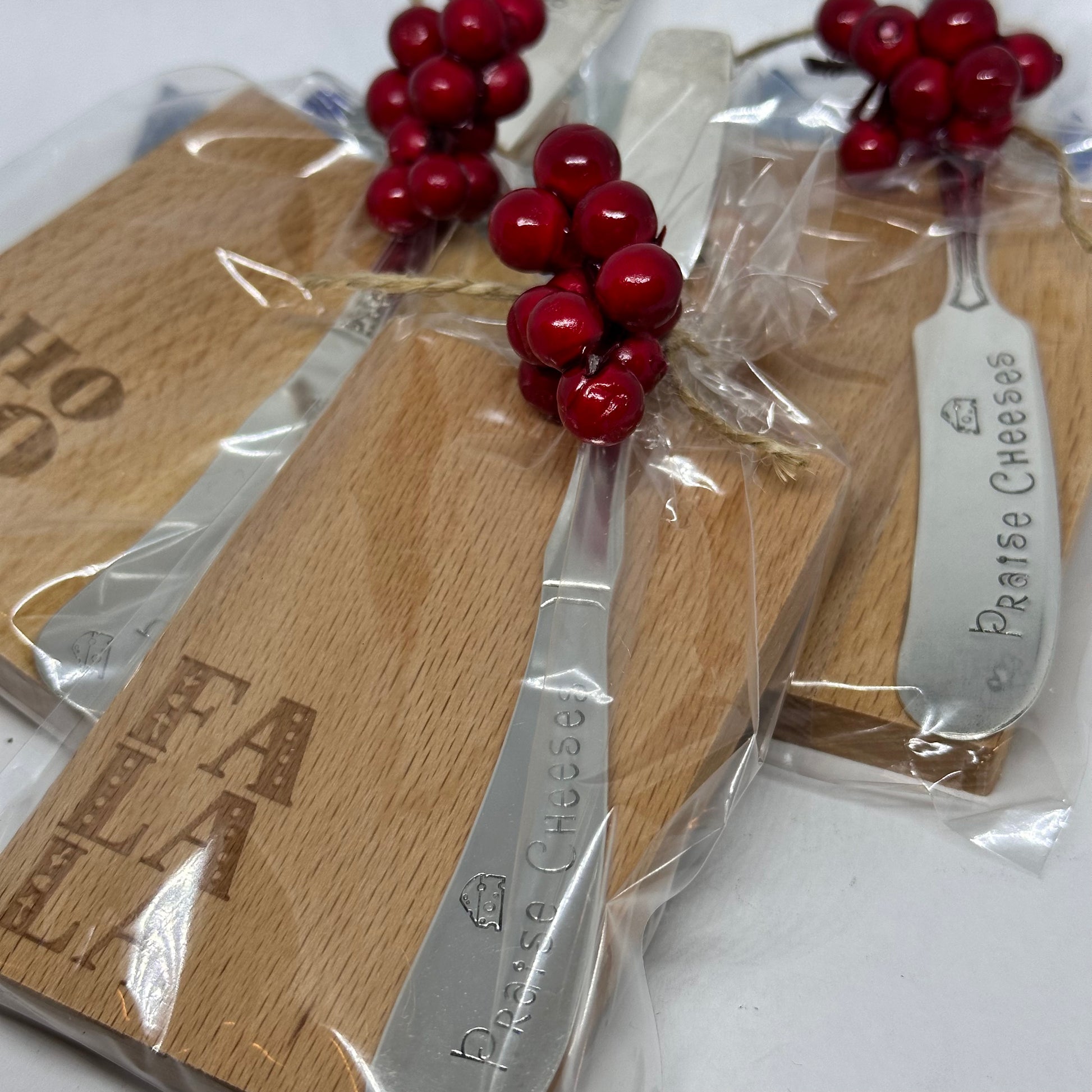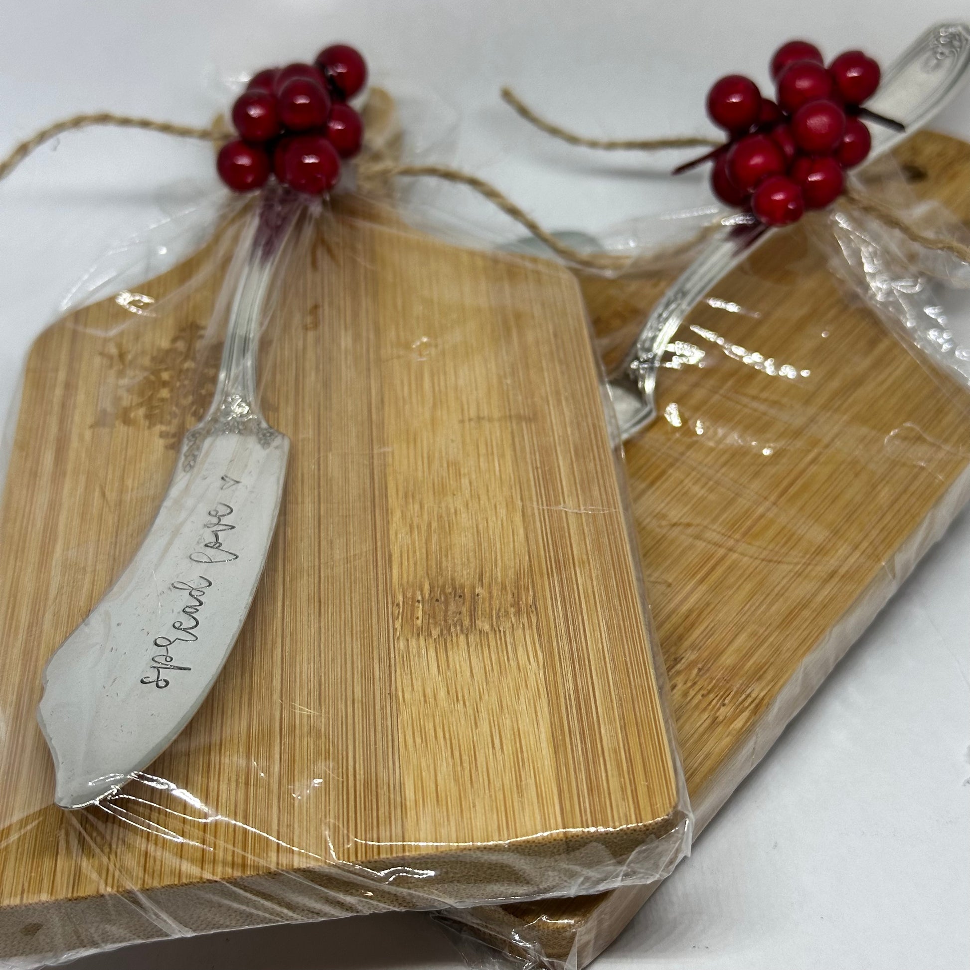 Hand stamped cheese spreaders/butter knives made from vintage silverware (patterns will vary) paired with a food safe decorative board. Both are nicely wrapped together with a festive decoration. Perfect for gift-giving! Think teachers, letter carriers, besties, neighbors, and last minute hostess gifts! Keep a few on hand for “emergency” gift giving!