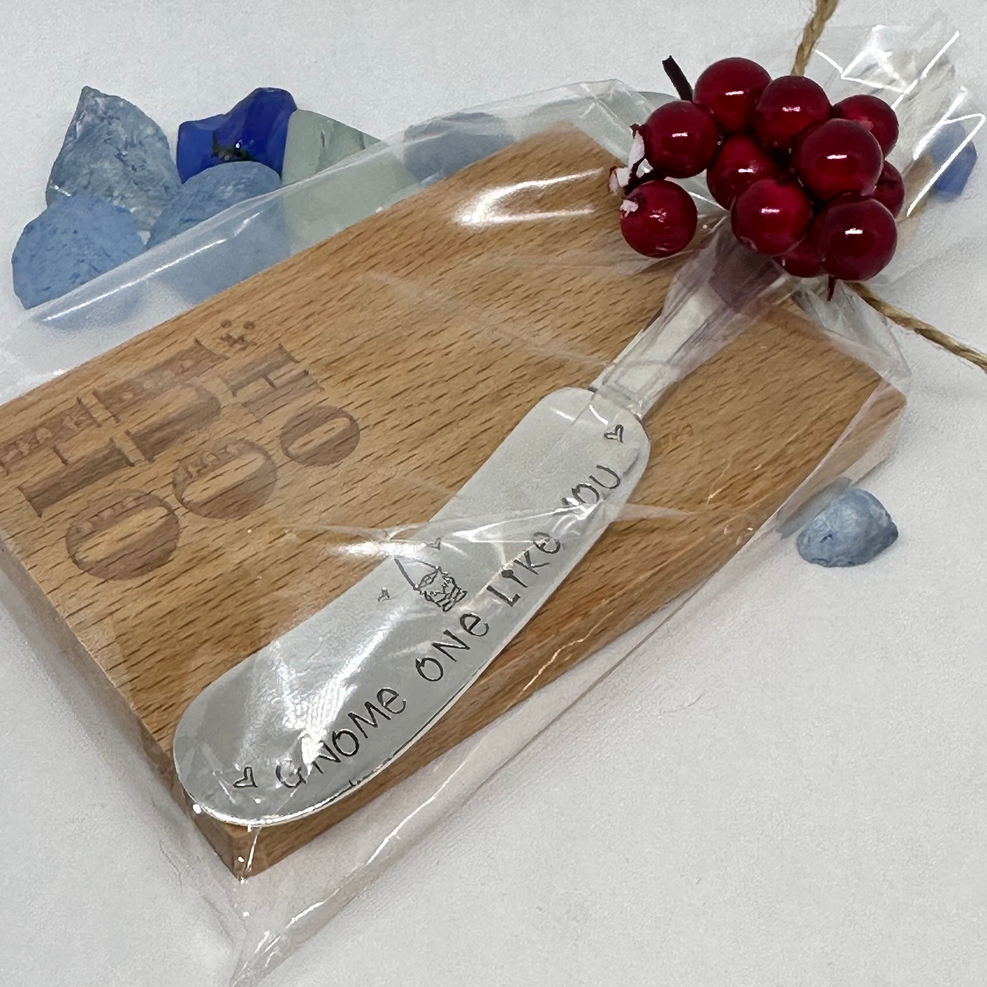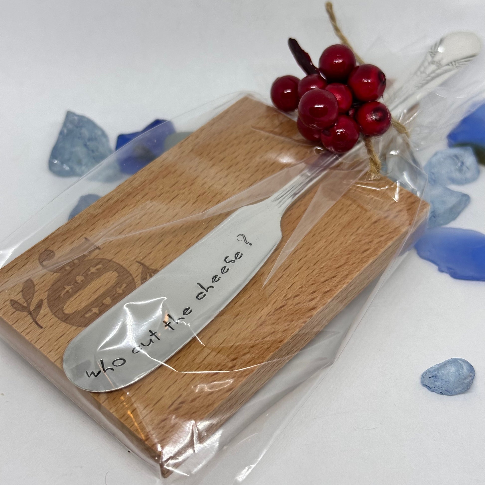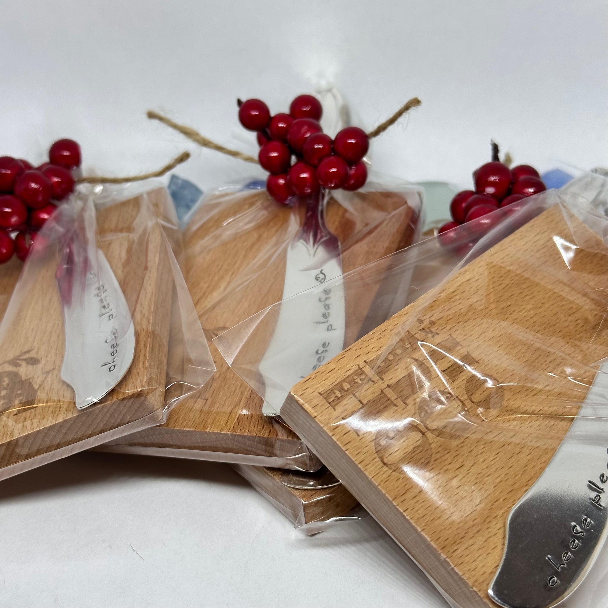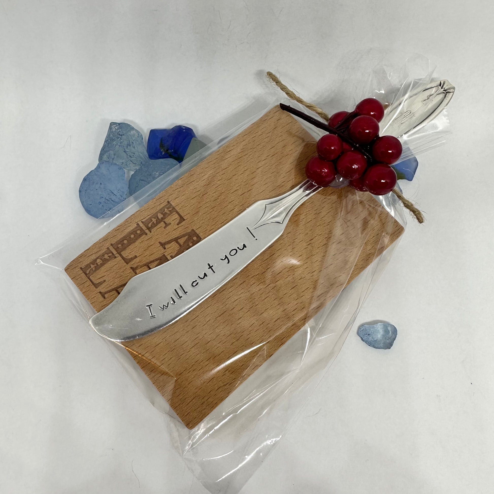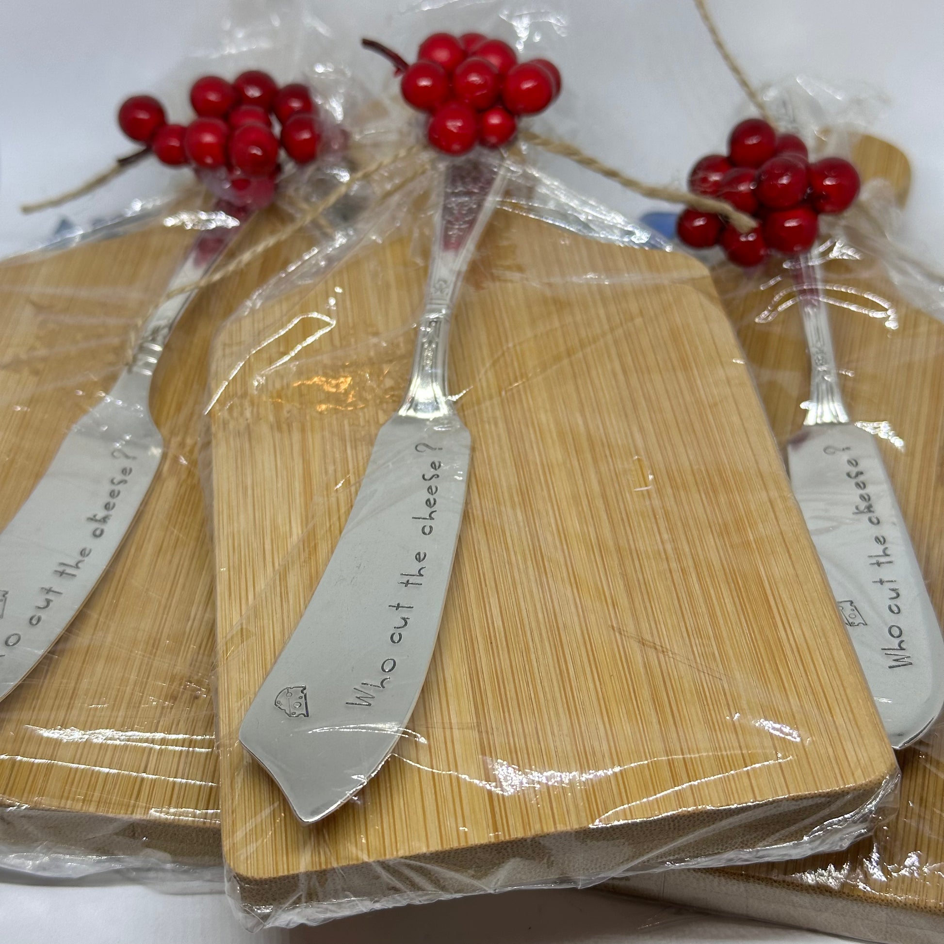 Hand stamped cheese spreaders/butter knives made from vintage silverware (patterns will vary) paired with a food safe decorative board. Both are nicely wrapped together with a festive decoration. Perfect for gift-giving! Think teachers, letter carriers, besties, neighbors, and last minute hostess gifts! Keep a few on hand for “emergency” gift giving!