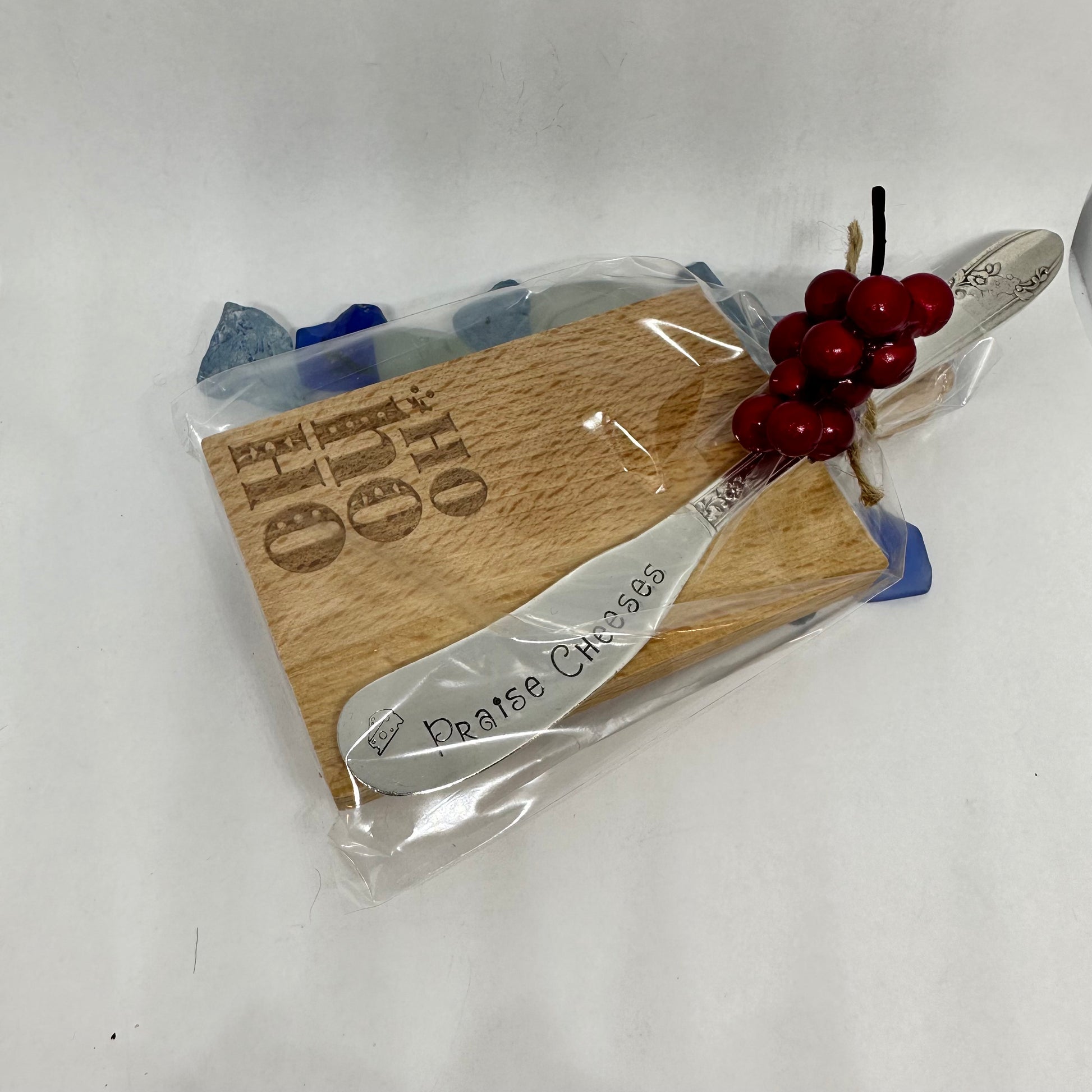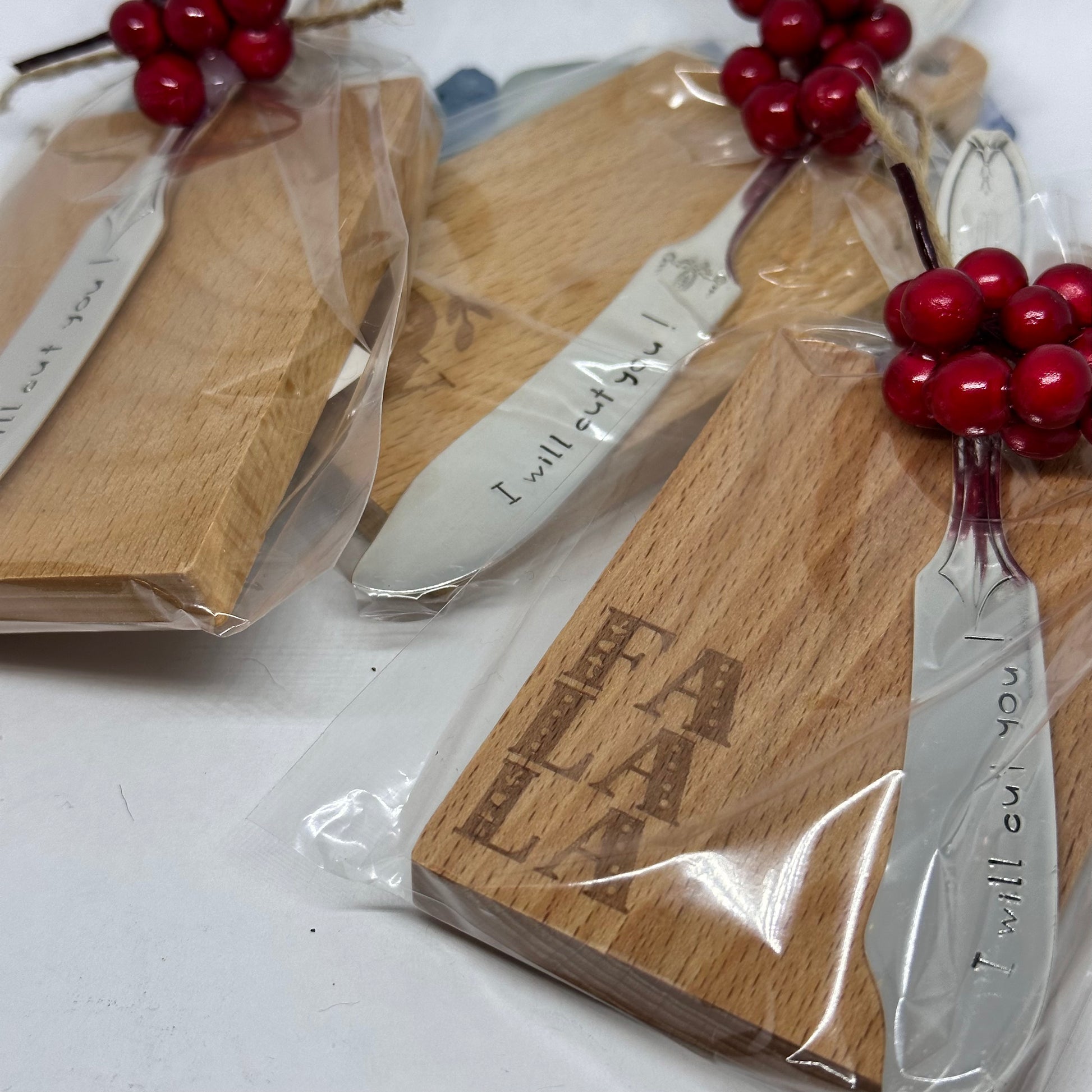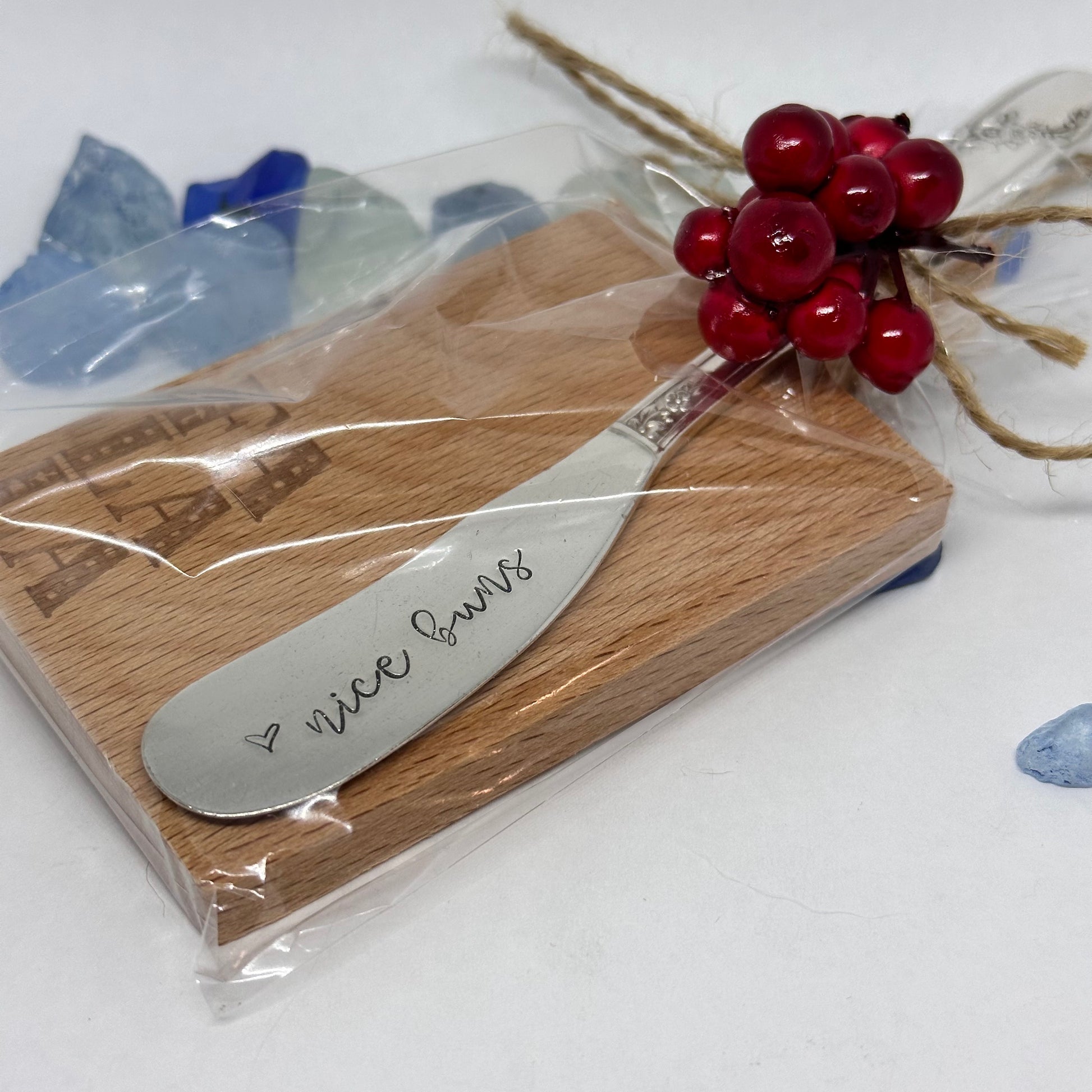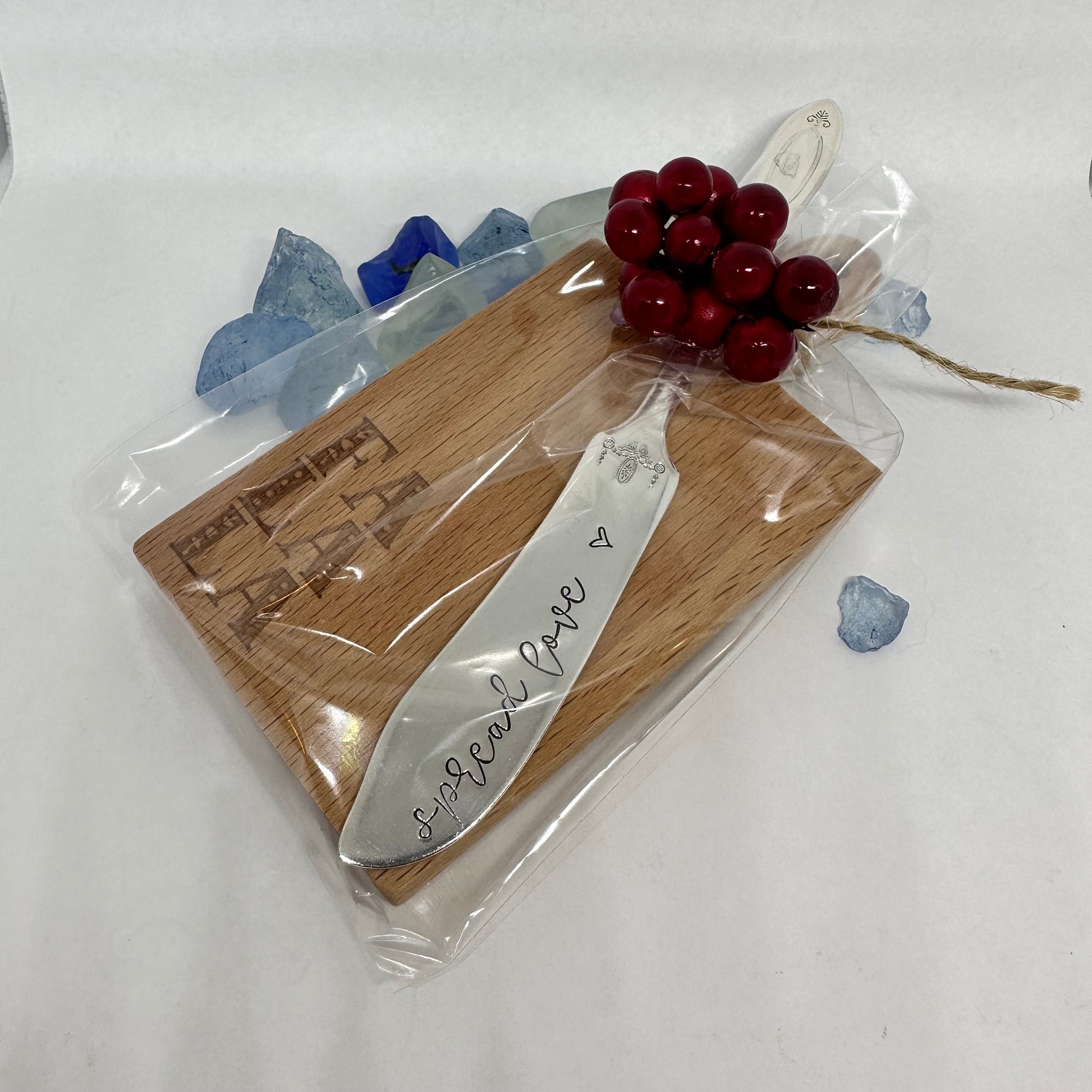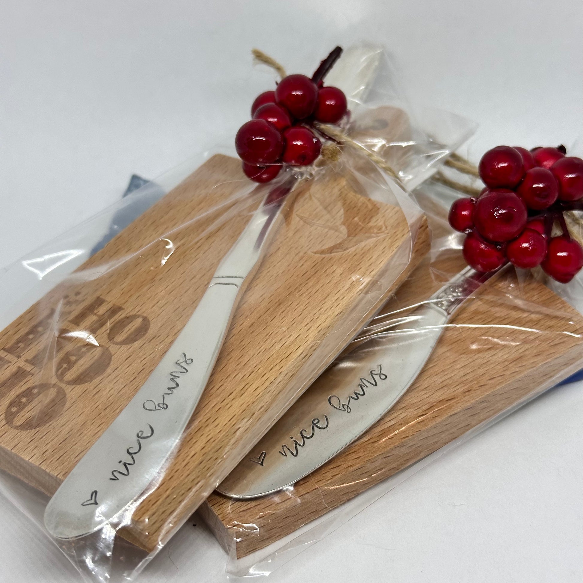Hand stamped cheese spreaders/butter knives made from vintage silverware (patterns will vary) paired with a food safe decorative board. Both are nicely wrapped together with a festive decoration. Perfect for gift-giving! Think teachers, letter carriers, besties, neighbors, and last minute hostess gifts! Keep a few on hand for “emergency” gift giving!