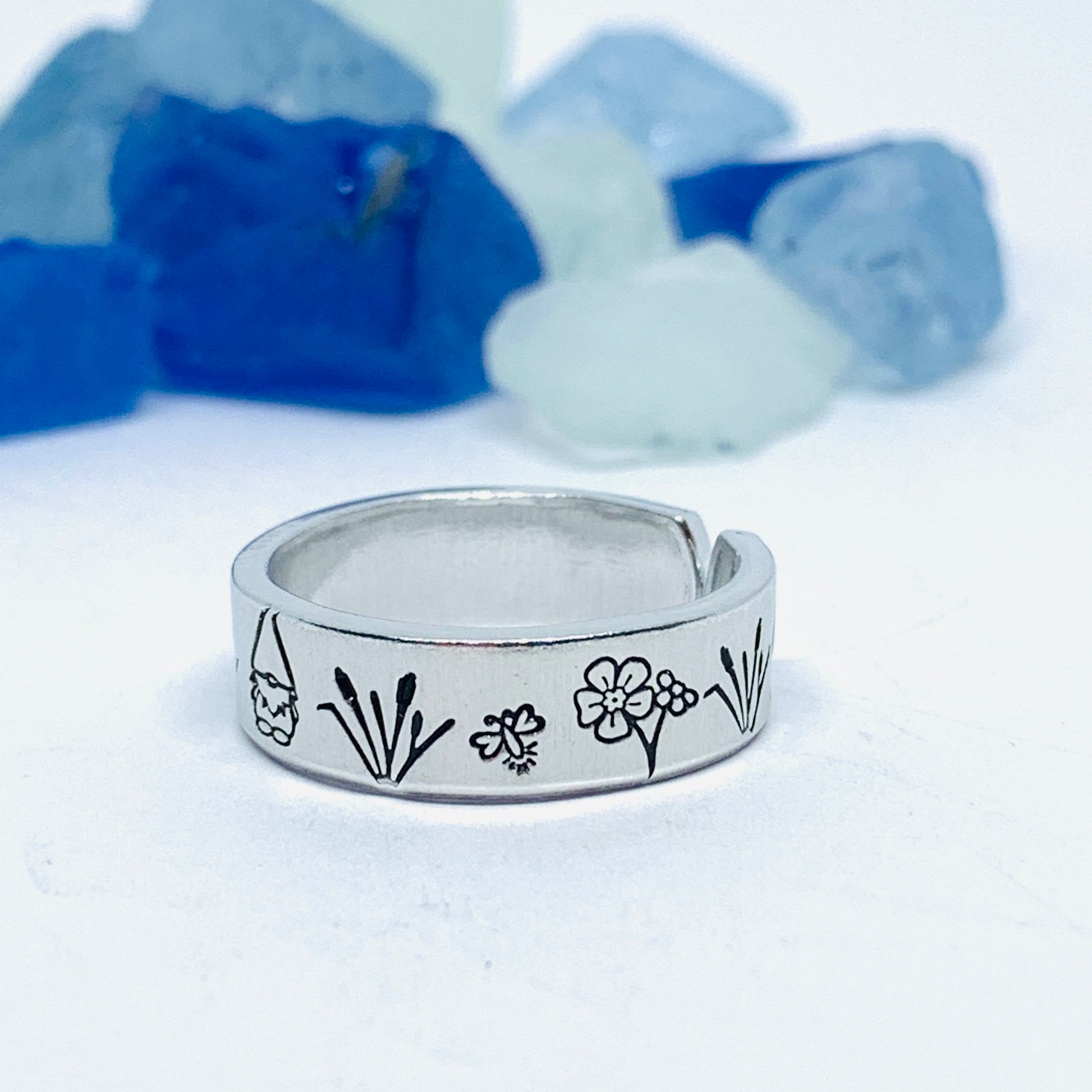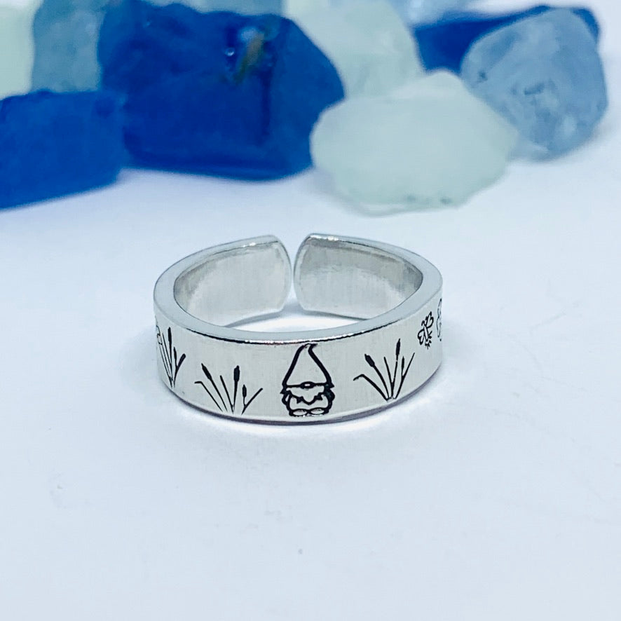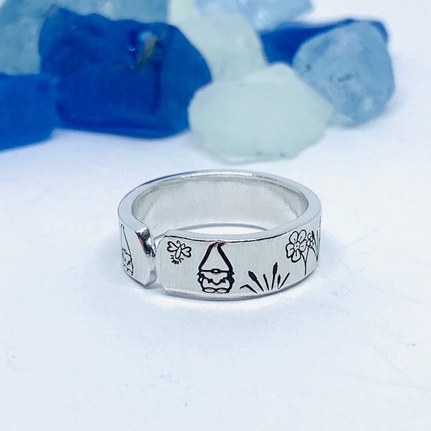 Gnome Garden Hand Stamped Ring | Gnomies Ring | Gift for Her | Gnome Ring | Garden Grass Ring | Fun unique gift | Bees Grasses Fireflies