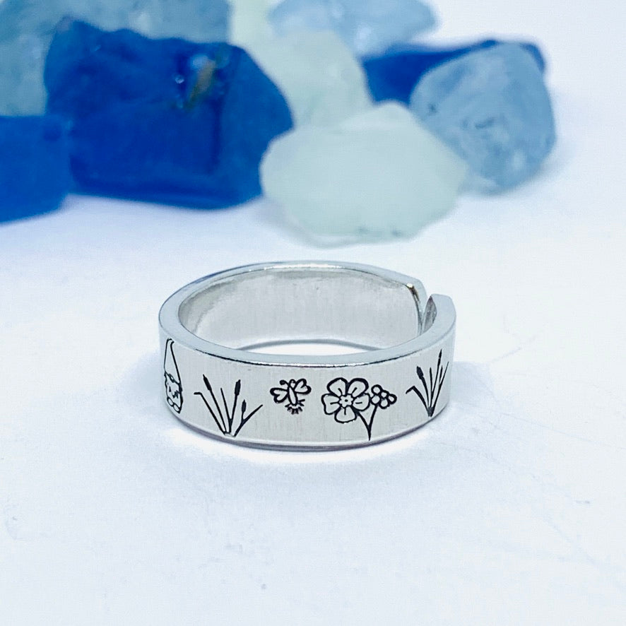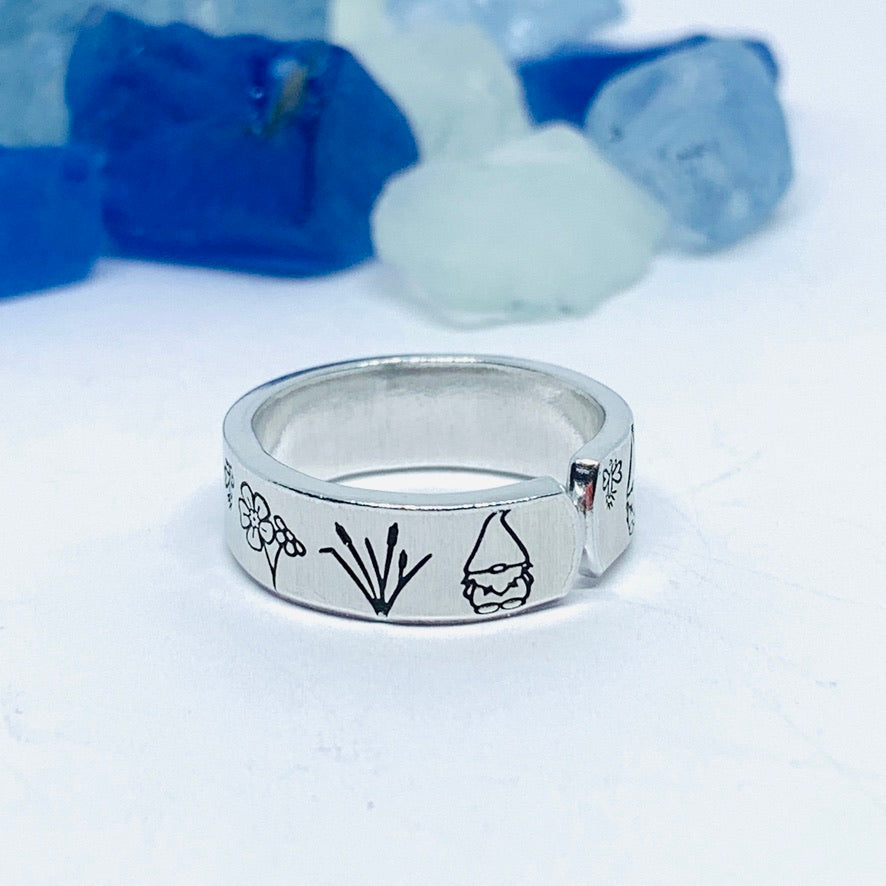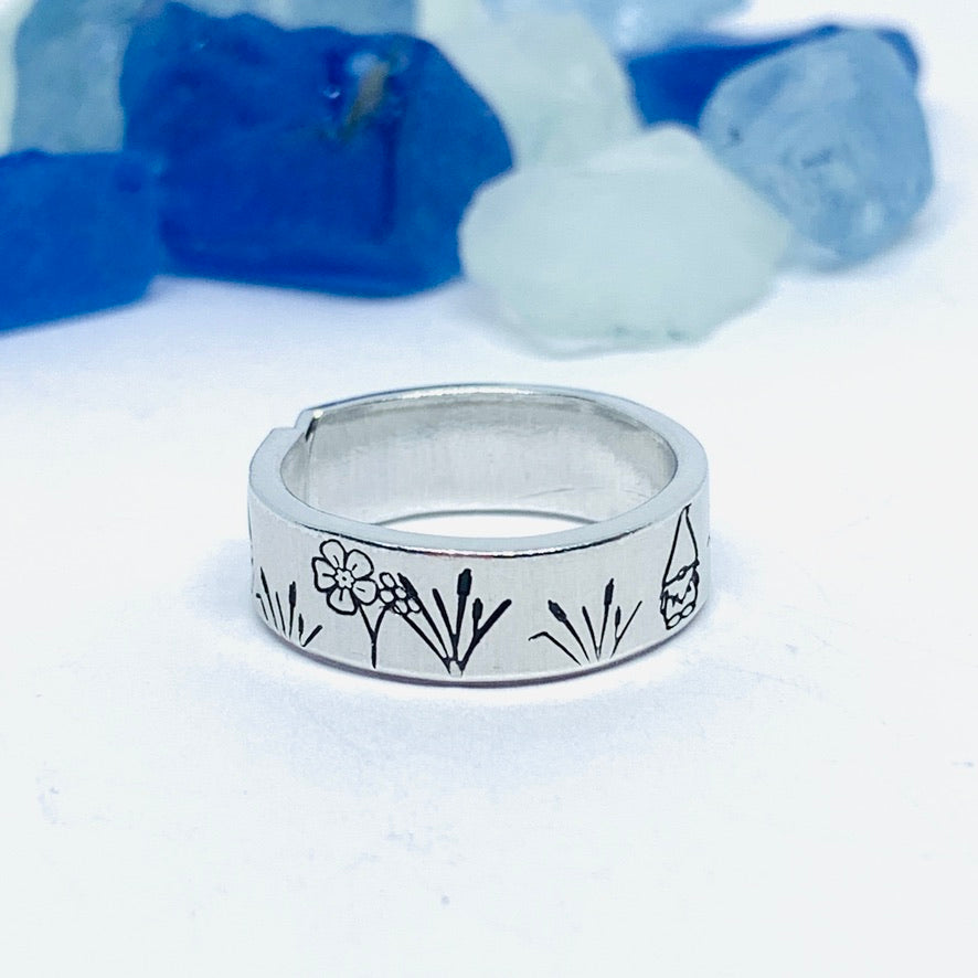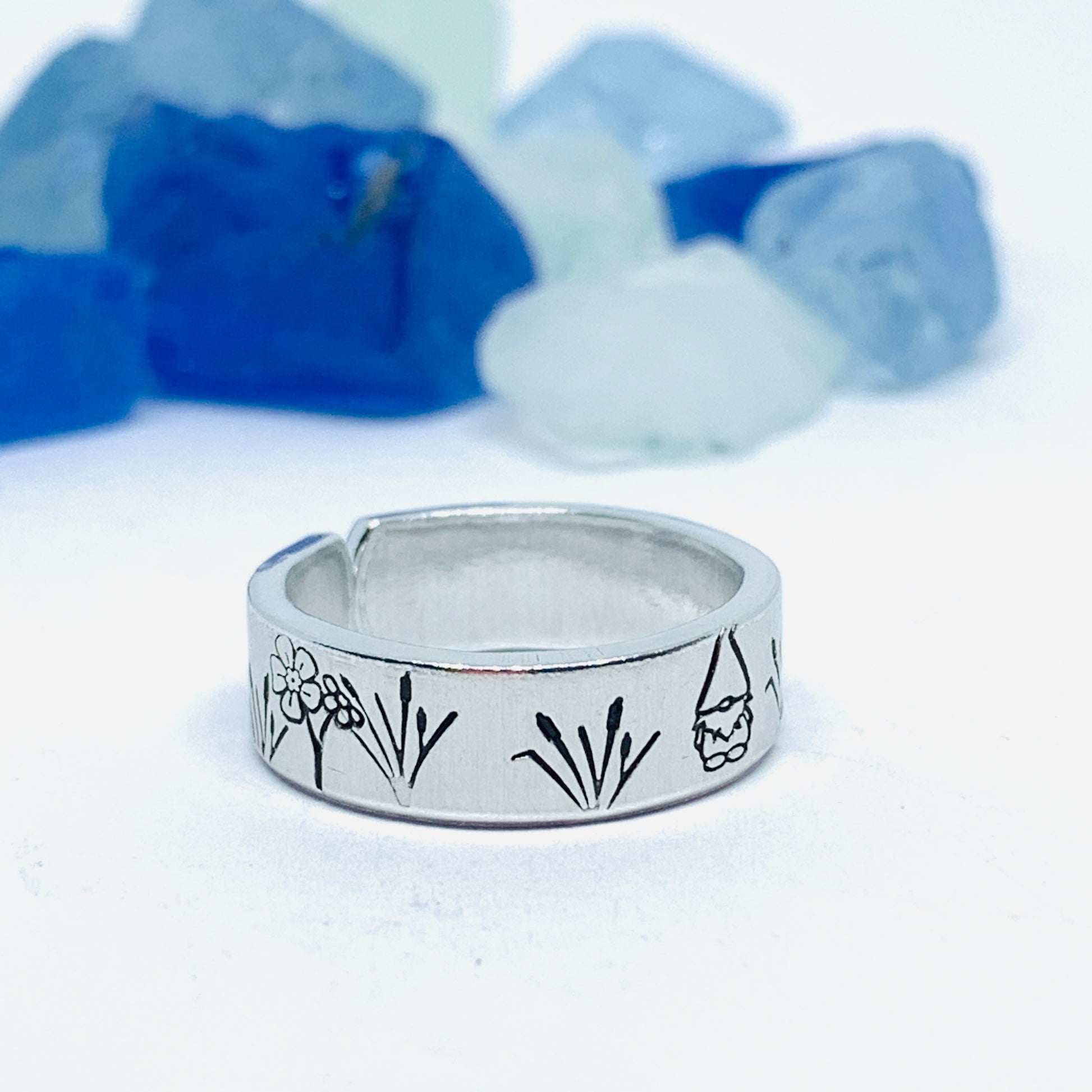 Gnome Garden Hand Stamped Ring | Gnomies Ring | Gift for Her | Gnome Ring | Garden Grass Ring | Fun unique gift | Bees Grasses Fireflies