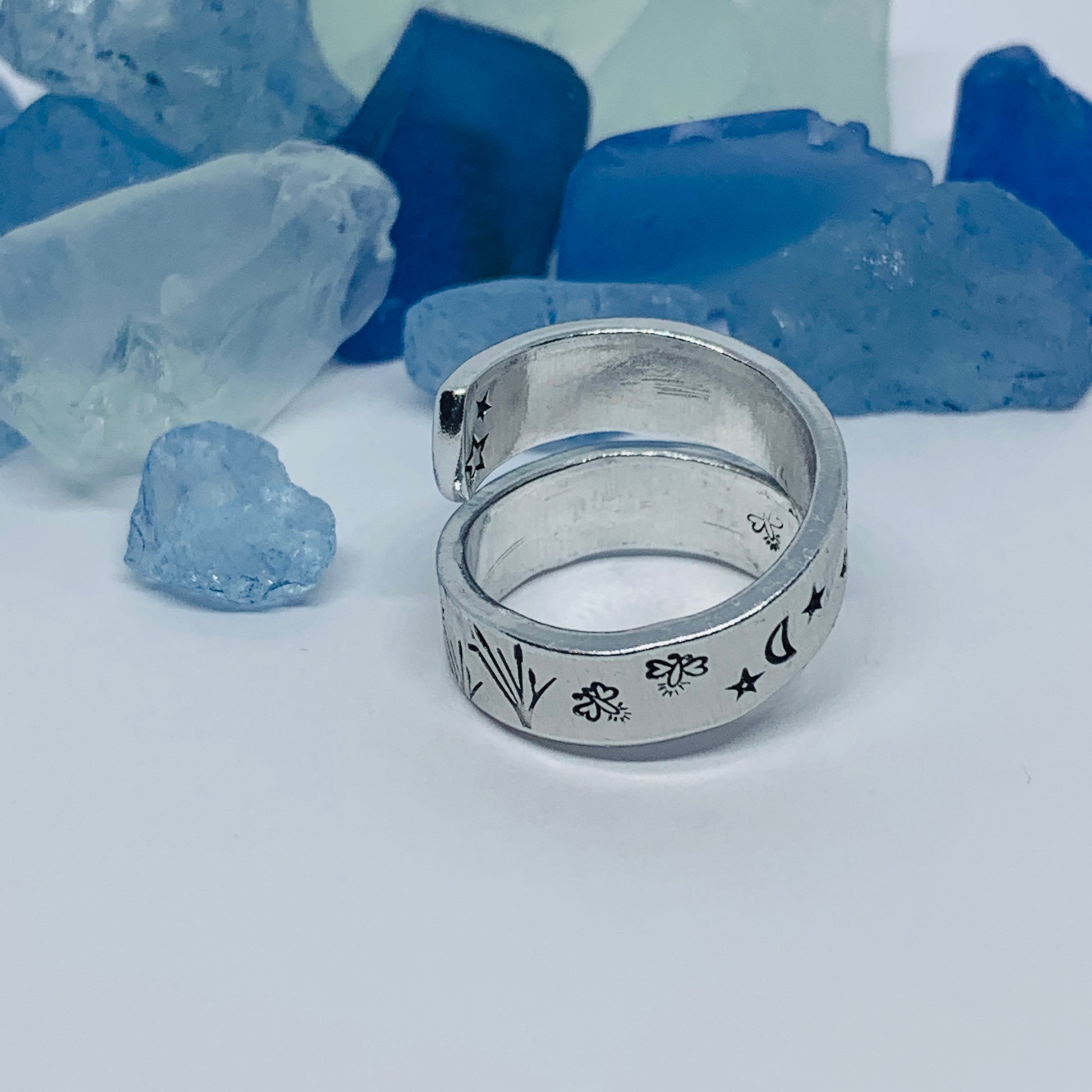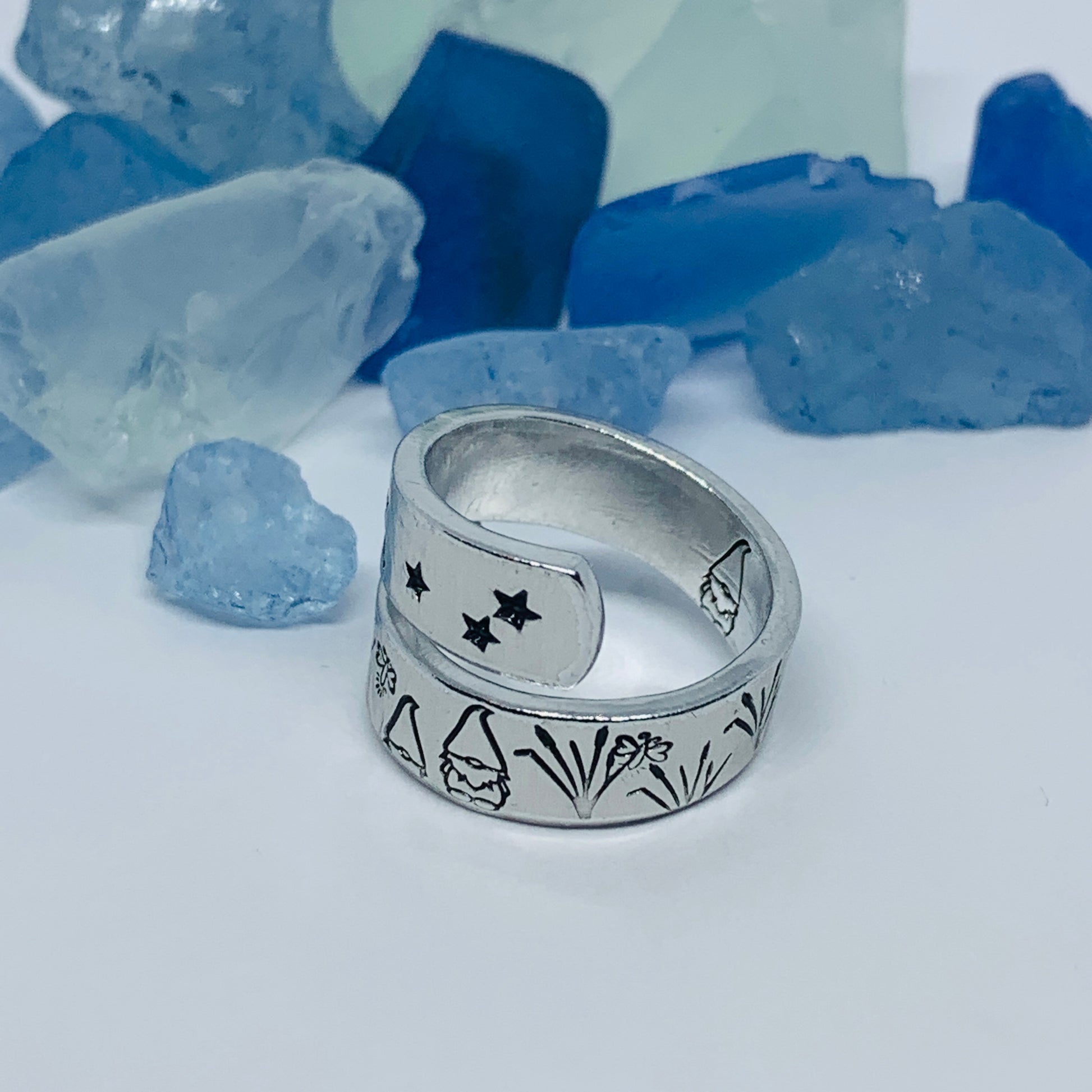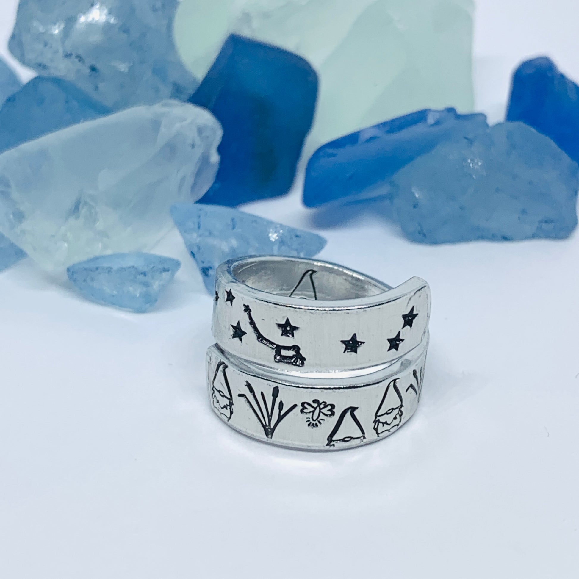 Gnome Garden Hand Stamped Wrap Ring | Gnome Ring | Garden Grass Gnome Firefly Ring | Moons Stars Gnomes Bees Grasses Fireflies | Fantasy