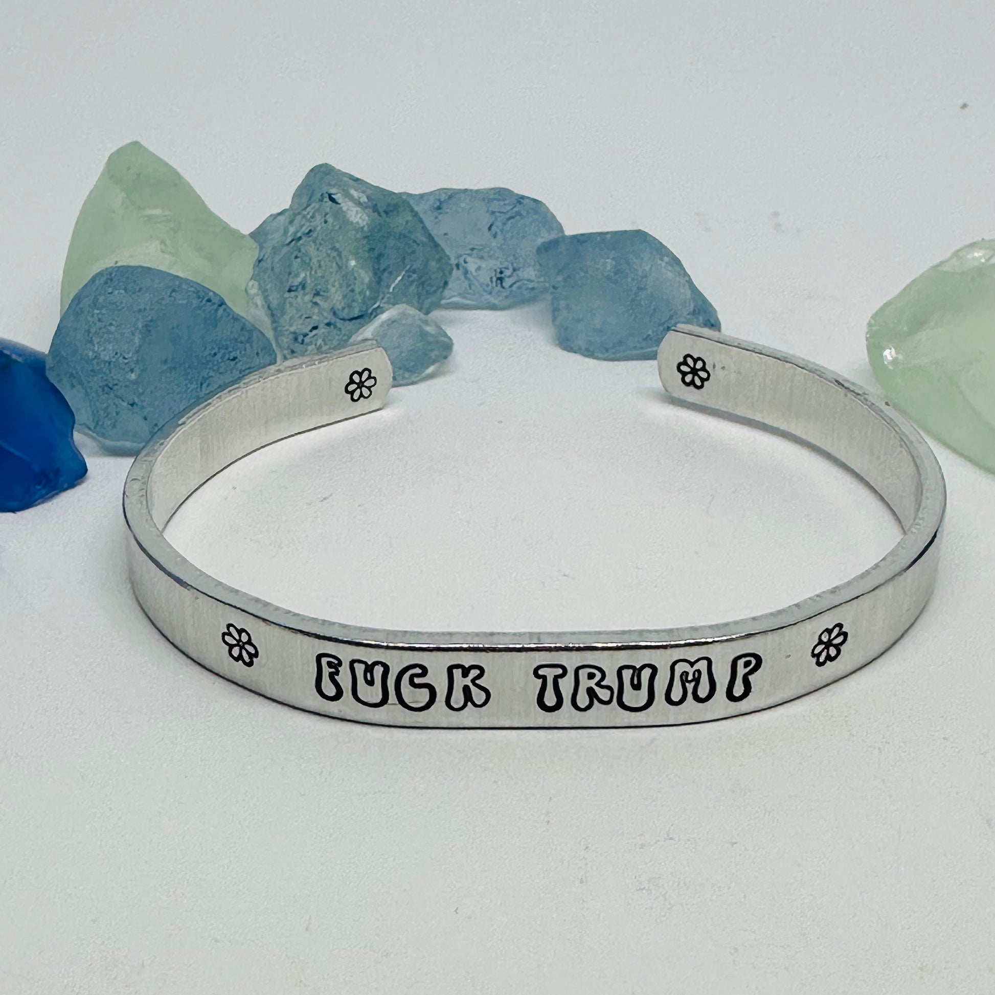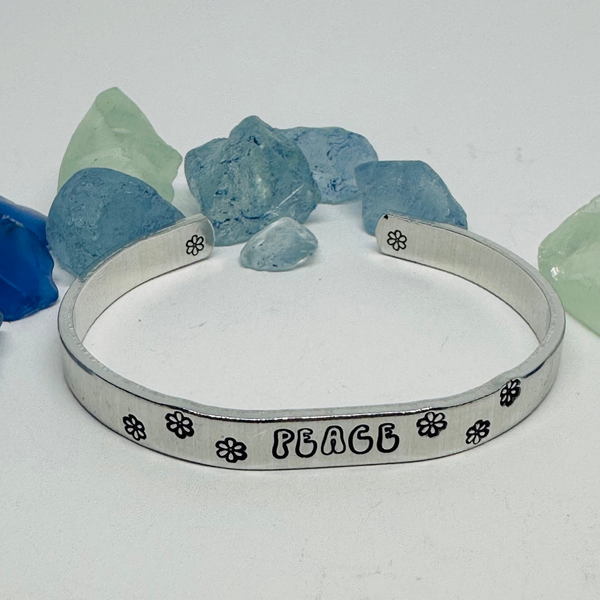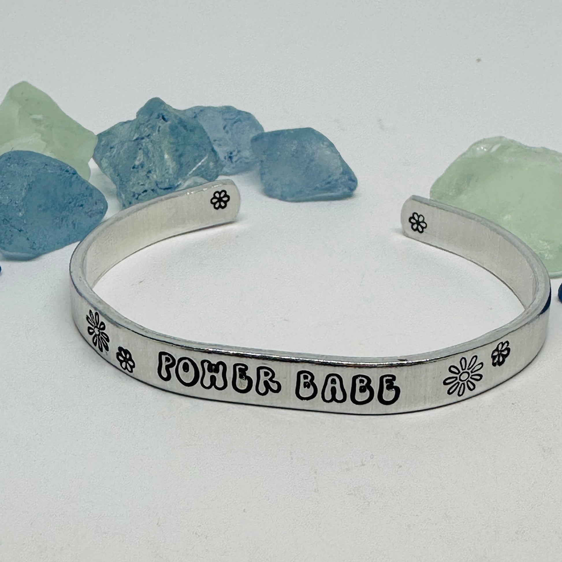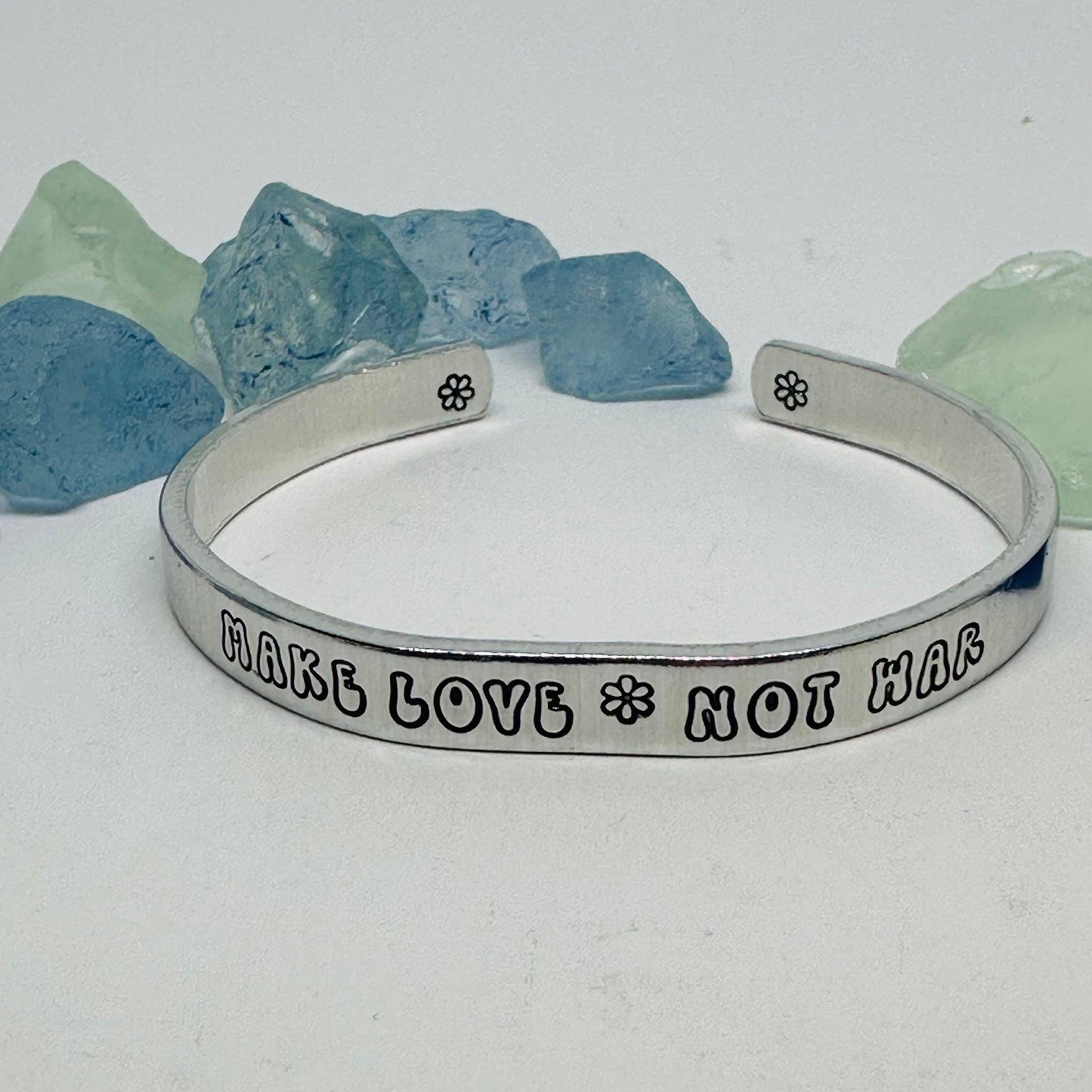 Experience a touch of nostalgia with this 1/4" aluminum cuff featuring a retro font and groovy words of your choice. Adding to its charm, this bracelet may also include whimsical daisy designs.