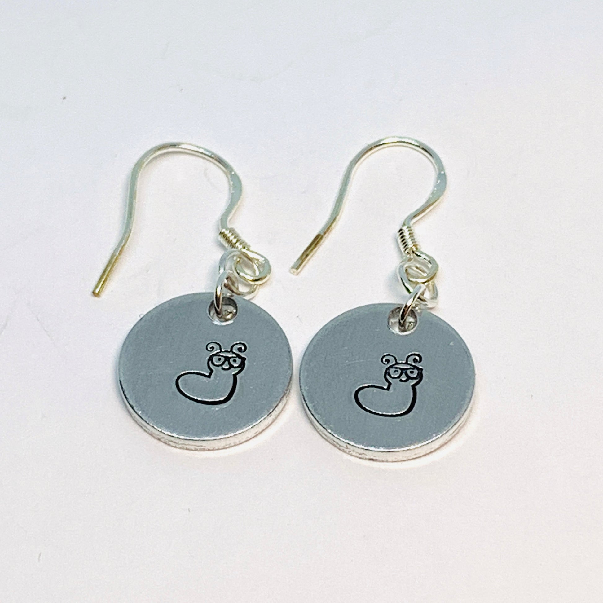 These hand stamped earrings are attached to silver plated ear wires by a silver jump ring and a stainless steel jump ring. They come with clear earring backs to prevent loss!