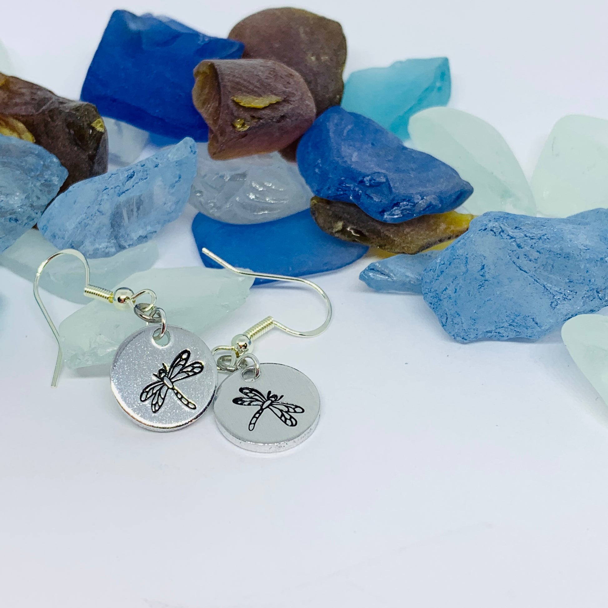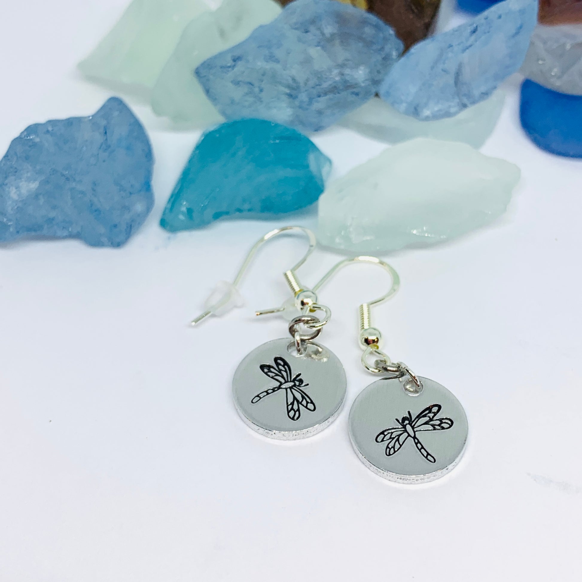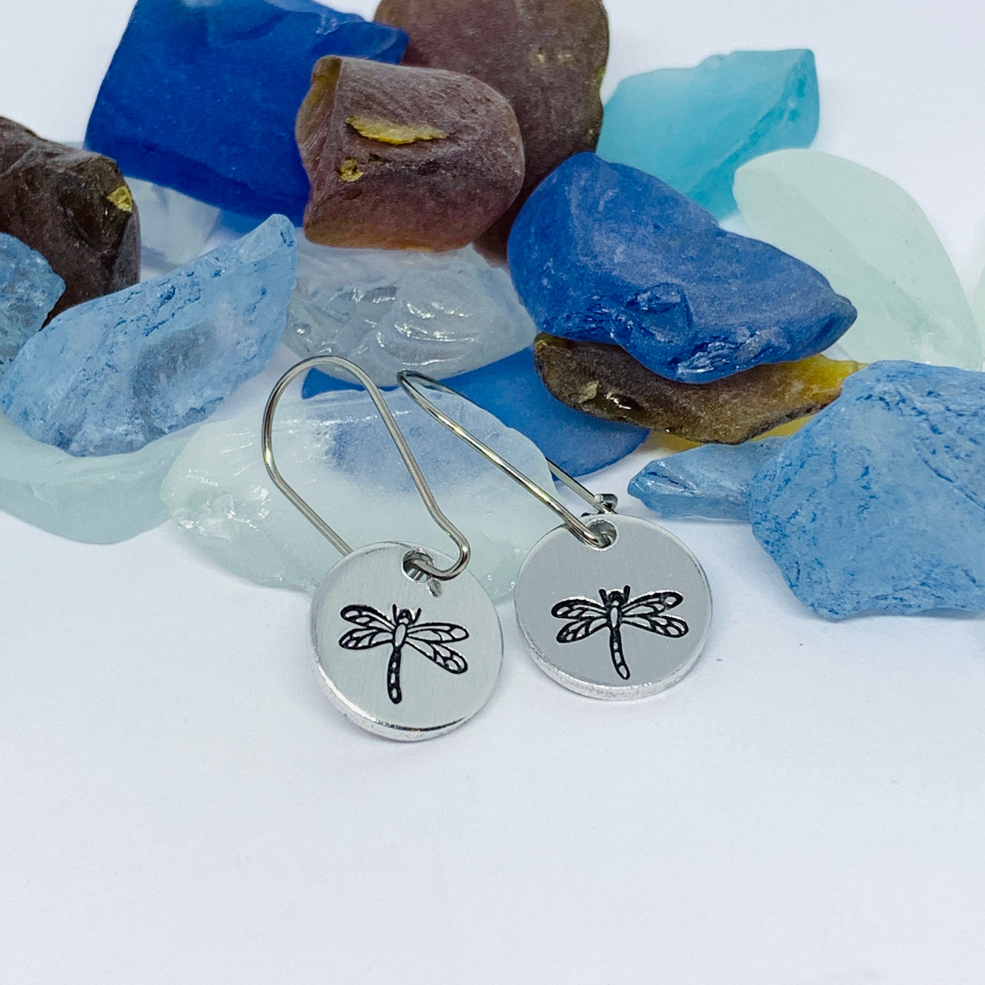 These hand stamped earrings feature beautifully detailed dragonflies on a 1/2” round aluminum disk! They are to attached to sterling silver ear wires by one silver jump ring and one stainless steel jump ring. They come with clear earring backs to prevent loss! Alternatively, they are also available on a stainless steel kidney wire earring.