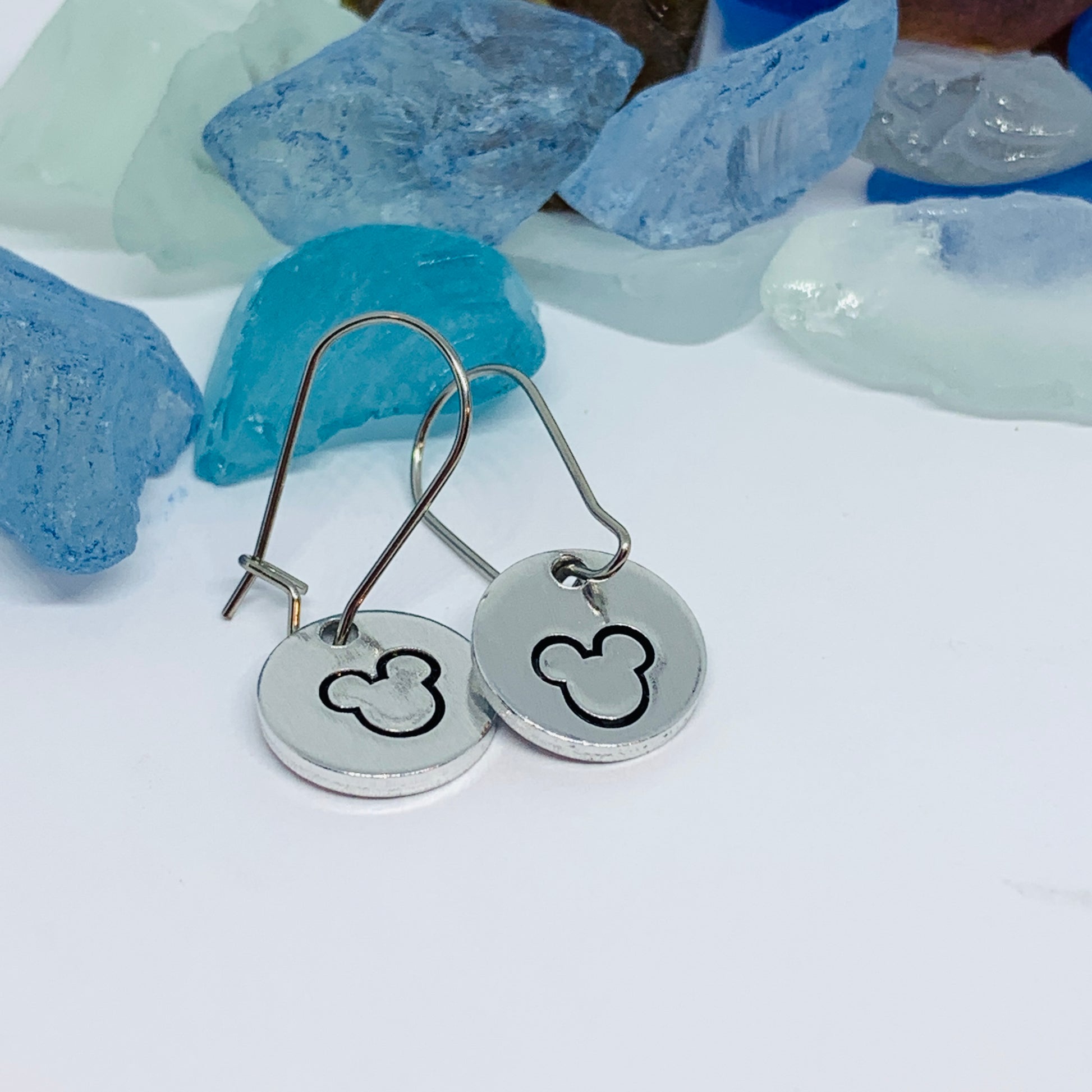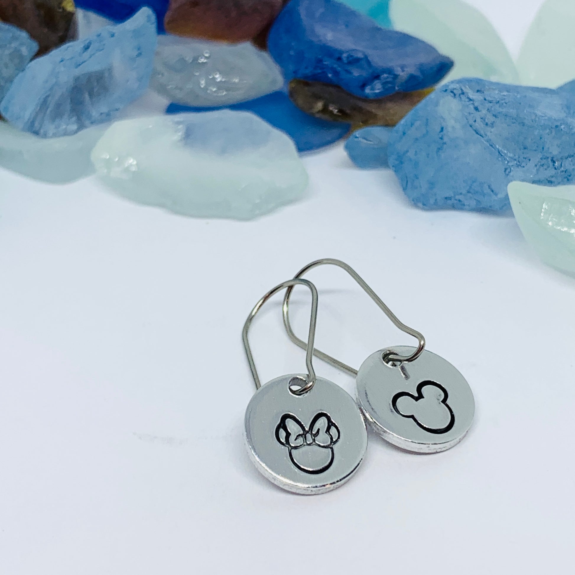 These hand stamped earrings feature Disney-Inspired mouse ears designs on a 1/2” round aluminum disk! They are to attached to sterling silver ear wires. Choose from him and her, or him and him, or her and her!