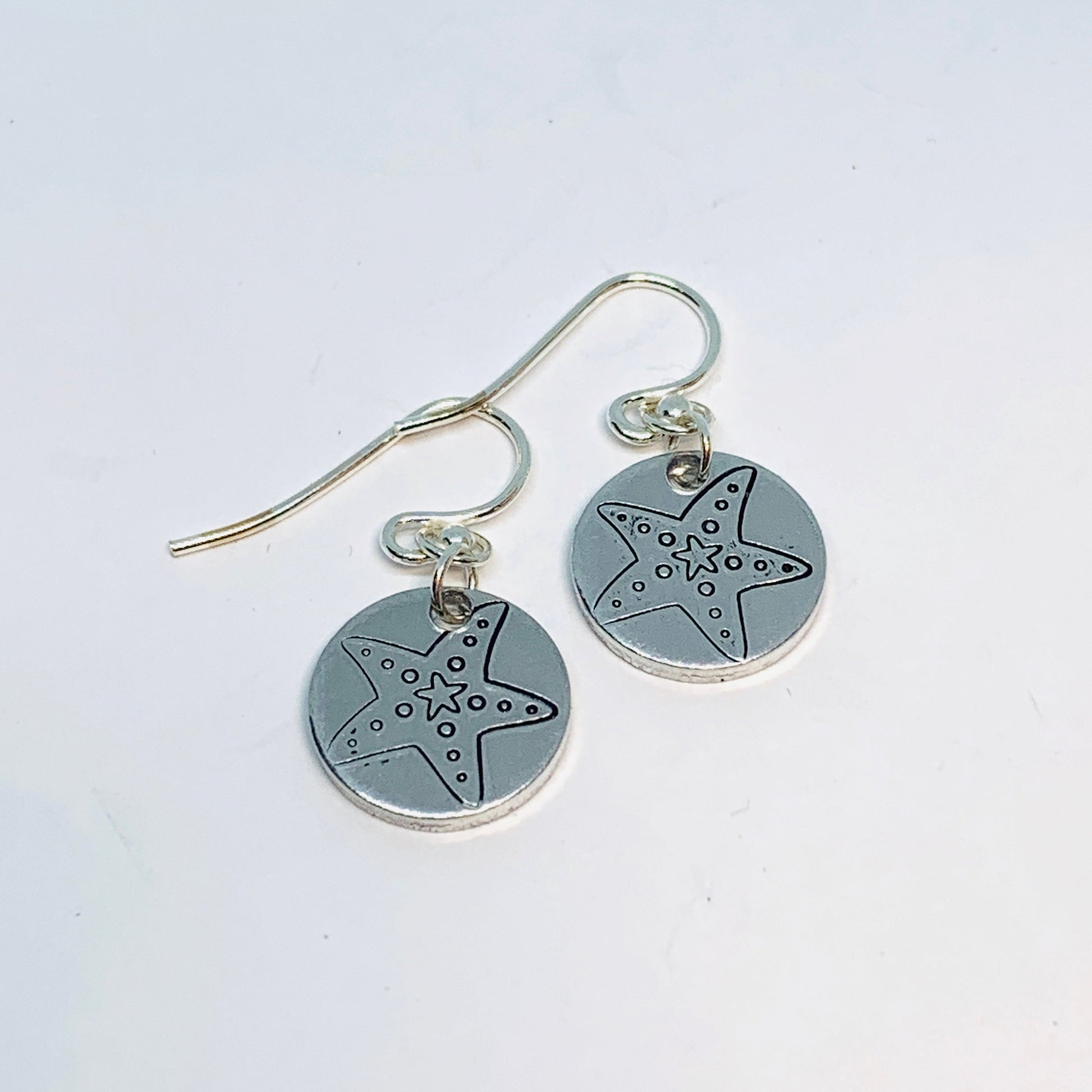 These hand stamped starfish sea star design earrings are attached to silver plated ear wires by a silver jump ring and a stainless steel jump ring. They come with clear earring backs to prevent loss!