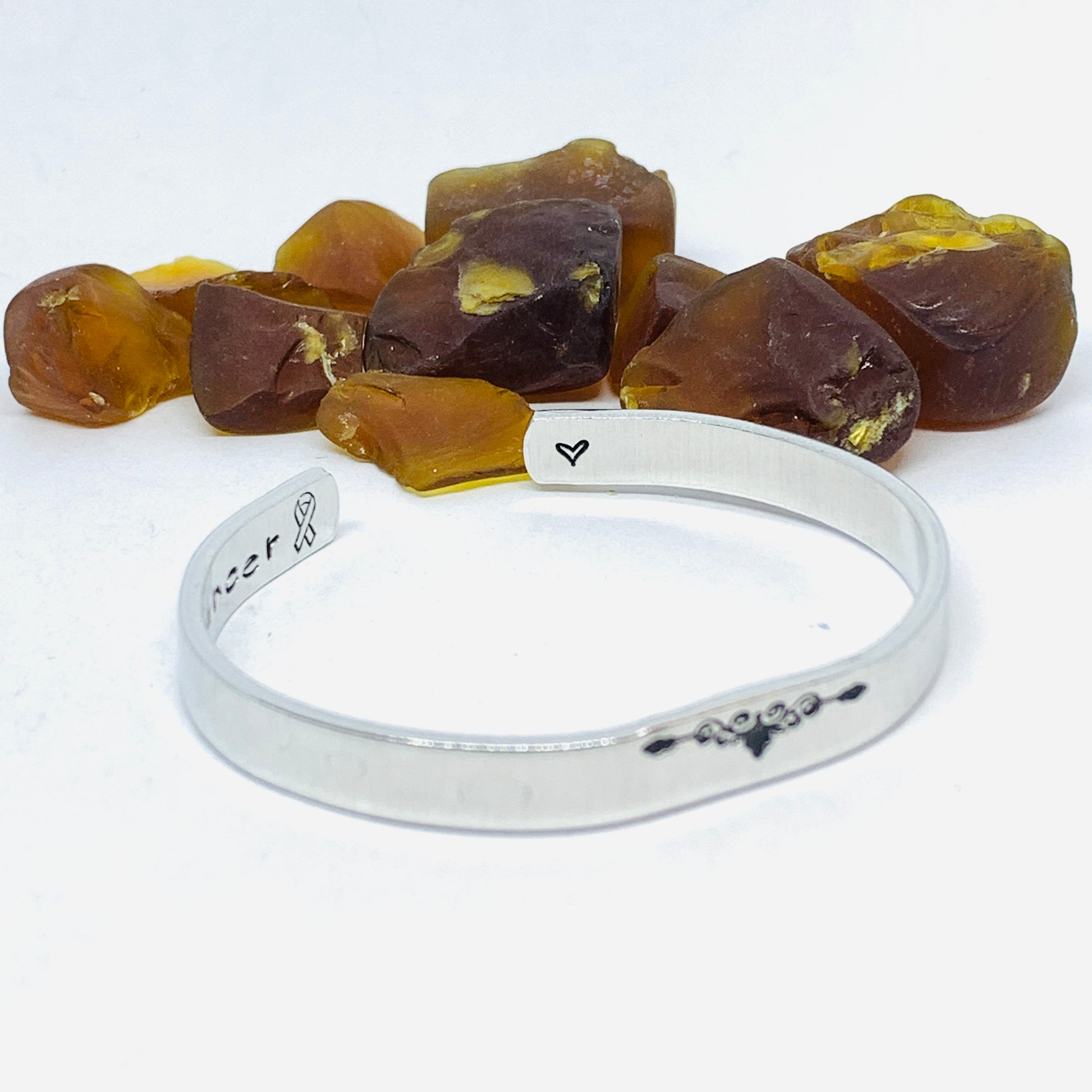 A delicate scroll design is hand stamped on the outside center of this cuff bracelet. Inside you’ll find “fuck cancer” and an awareness ribbon on one far end. On the other far and is a sweet hand drawn heart design.