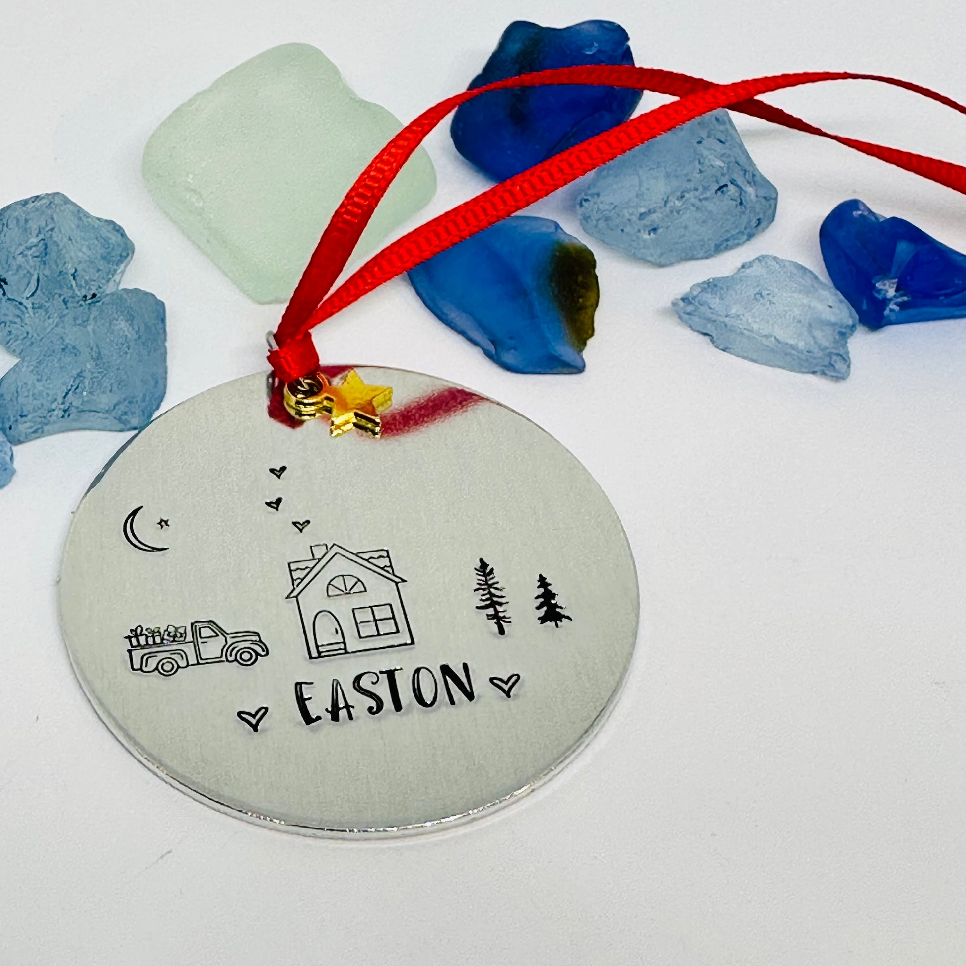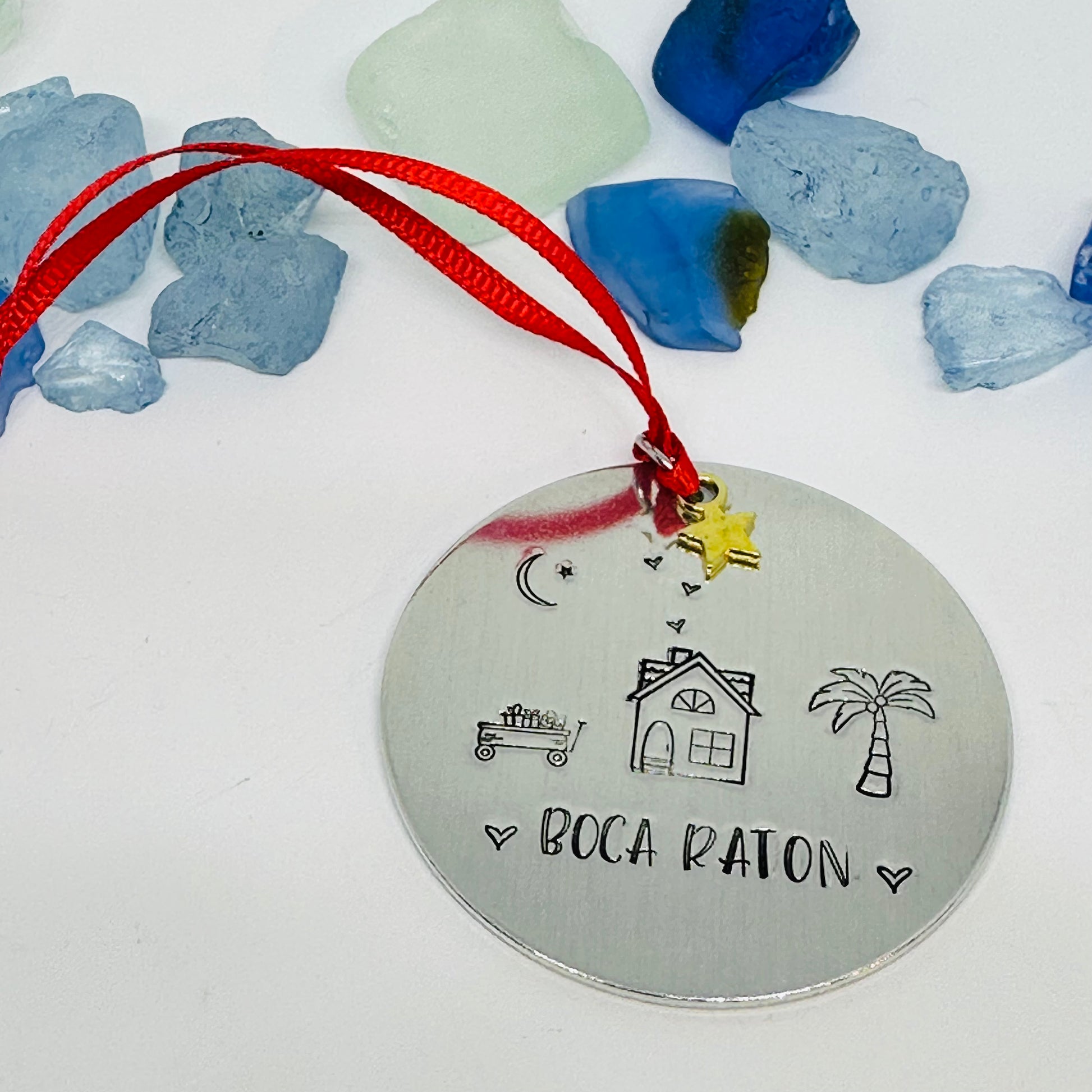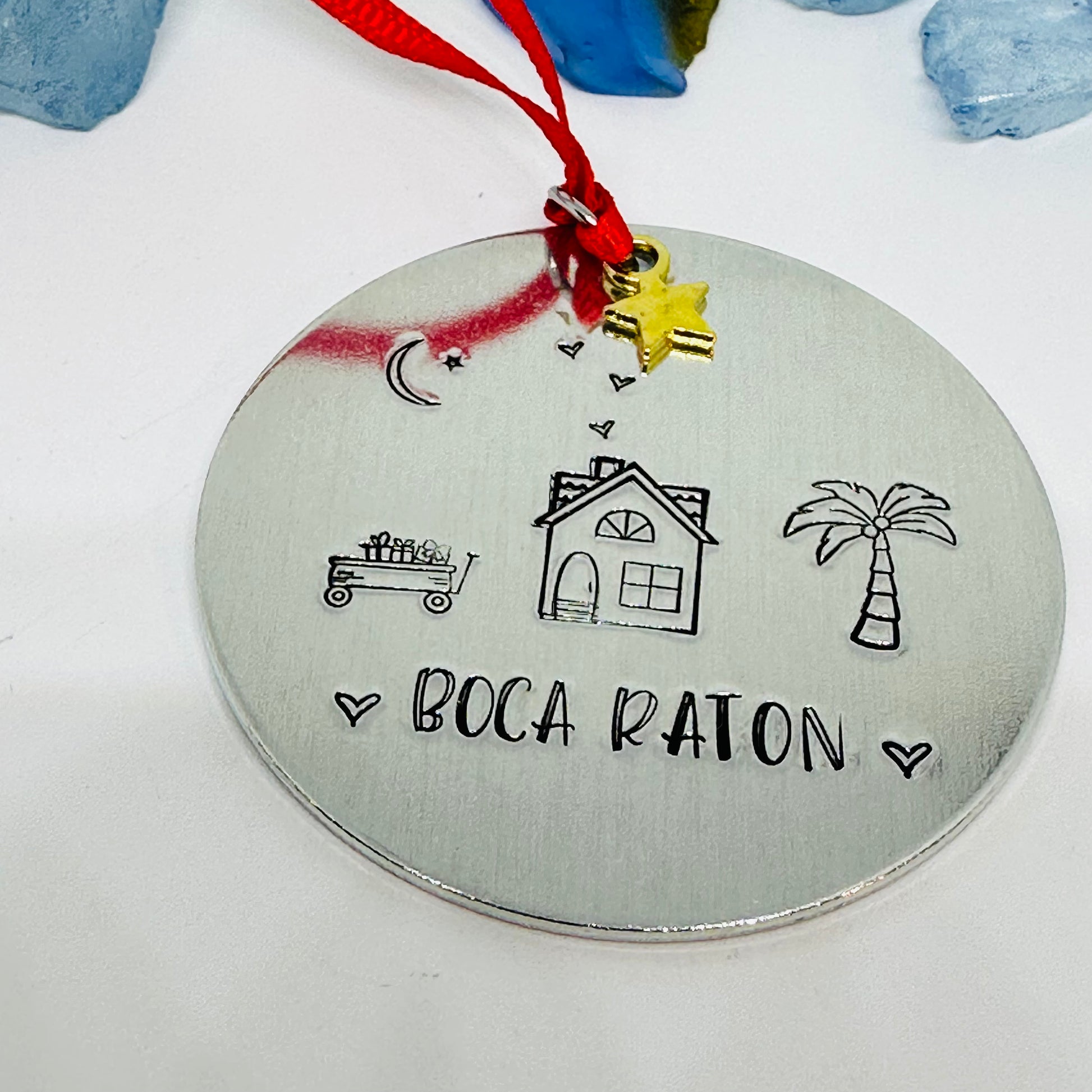 This 2” round aluminum ornament features a hand stamped home assorted designs and the name of your favorite home town!