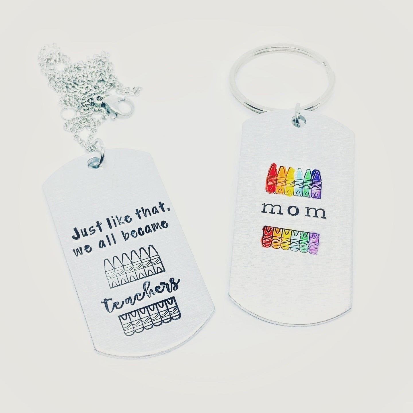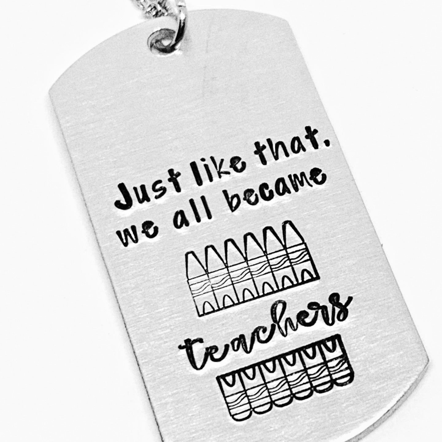 Just like that we all became teachers - Hand Stamped Key Ring / Necklace / Zipper Pull